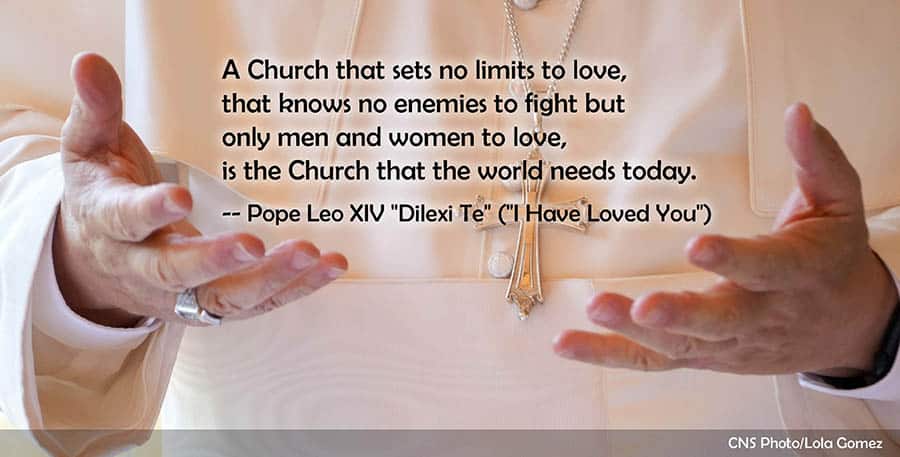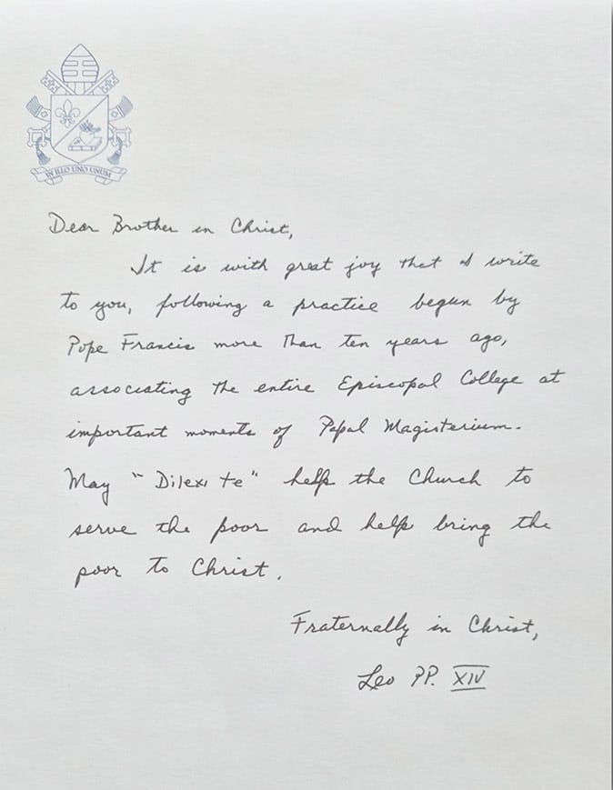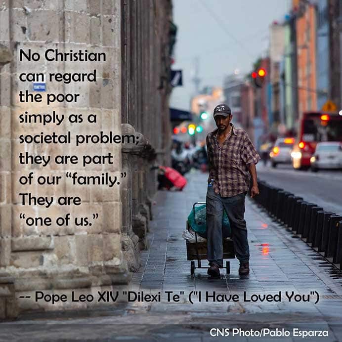 9 things to know about “Dilexi Te,” Pope Leo’s first apostolic exhortation October 9, 2025By OSV News OSV News Filed Under: News, Social Justice, Vatican, World News ROME (OSV News) — Pope Leo XIV’s first apostolic exhortation “Dilexi Te” (“I have loved you”), was promulgated Oct. 9, the feast day of St. John Henry Newman. Here are nine things to know about the document. “Dilexi Te” is about love and care for the poor The apostolic exhortation is addressed “to all Christians on love for the poor,” and explores the topic through the lens of Scripture, church teaching and the witness of the saints. A quote from Pope Leo XIV’s apostolic exhortation “Dilexi Te” (“I Haved Loved You”) is seen over a photo of a man pulling a small cart in an undated file photo. (CNS illustration/Joanna Kohorst with photo by Pablo Esparza) Both Pope Francis and Pope Leo worked on this apostolic exhortation Pope Francis’ fourth and final encyclical “Dilexit Nos” (“He loved us”), on the human and divine love of Sacred Heart of Jesus, was published Oct. 24, 2024, nearly six months before his death. In the prologue of the exhortation, Pope Leo noted the late pope was preparing this apostolic exhortation on the church’s care for the poor as a follow-up, and gave it its title. Pope Leo wrote, “I am happy to make this document my own adding some reflections and to issue it at the beginning of my own pontificate, since I share the desire of my beloved predecessor that all Christians come to appreciate the close connection between Christ’s love and his summons to care for the poor.” Scripture and church social teaching documents are referenced “I often wonder, even though the teaching of Sacred Scripture is so clear about the poor, why many people continue to think that they can safely disregard the poor,” the exhortation reads. Using Scripture, “Dilexi Te” explores mercy and justice toward the poor as shown in both the Old and New Testaments; Jesus’ humbling of himself to become man; his poverty; and his own words on the last judgement, performing works of mercy and how we are to love our neighbor as ourselves. Several church texts on social justice are also referenced in “Dilexi Te,” including “Rerum Novarum,” “Mater et Magistra,” “Populorum Progressio,” “Sollicitudo Rei Socialis,” “Laborem Exercens,” “Caritas in Veritate” and documents of the Second Vatican Council. It contains many saintly examples No less than 33 saints are referenced as examples of holiness in their treatment of the poor sick, imprisoned, uneducated or migrant. The example of St. Francis of Assisi in his embrace of poverty is explored early in the first chapter of “Dilexi Te” and again in a section on the witness of mendicant religious orders. A quote from Pope Leo XIV’s apostolic exhortation “Dilexi Te” (“I Haved Loved You”) is seen over a photo of his hands taken in August 2025. (CNS illustration/Joanna Kohorst with photo by Lola Gomez) St. Stephen, the first martyr, and St. Lawrence, who brought the poor before the Roman authorities and said, “These are the treasures of the church,” are given as examples of deacons carrying out their prescribed works of mercy in the early church. Early fathers of the church Sts. Ignatius of Antioch, Polycarp and Justin Martyr also had much to say on the works of mercy Christians ought to perform, and are mentioned in “Dilexi Te.” Entire sections of the apostolic exhortation are dedicated to Sts. John Chrysostom and Augustine with extensive quotes from their homilies and writings. In these, the saints extort Christians to recognize Christ in people in need, that almsgiving is a matter of justice, that God will not be outdone in generosity and that “charity is not optional but a requirement of true worship.” Other exemplary saints mentioned include Sts. Cyprian, John of God, Camillus de Lellis, Louise de Marillac, Basil the Great, Benedict, John of Matha, Felix of Valois, Peter Nolasco, Raymond of Peñafort, Clare of Assisi, Dominic de Guzmán, Joseph Calasanz, Marcellin Champagnat, John Baptist Scalabrini, Frances Cabrini, Teresa of Calcutta, Dulce of the Poor, Benedict Menni, Charles de Foucauld, Katharine Drexel, Oscar Romero, John Paul II, Gregory the Great and Gregory of Nazianzus for their words, actions or instructions for tending the poor sick, imprisoned, uneducated, or migrant. Works of mercy, spiritual care and almsgiving are recommended “Works of mercy are recommended as a sign of the authenticity of worship, which, while giving praise to God, has the task of opening us to the transformation that the Spirit can bring about in us, so that we may all become an image of Christ and his mercy towards the weakest.” Pope Leo XIV writes a letter to the world’s bishops accompanying the publication Oct. 9, 2025, of his apostolic exhortation “Dilexi Te” (“I Have Loved You”). The letter says, “Dear brother in Christ, It is with great joy that I write to you, following a practice begun by Pope Francis more than ten years ago, associating the entire Episcopal College at important moments of Papal Magisterium. May ‘Dilexi te’ help the Church to serve the poor and help bring the poor to Christ.” (CNS photo/Vatican Media) Several ways of performing works of mercy are mentioned in the apostolic exhortation, particularly through the lives of saints. Pope Leo also notes that the spiritual dimension of caring for the poor is extremely important; that almsgiving is a matter of justice; and helping the poor with better employment reinforces their human dignity and participation in God’s creation. Indifference to the plight of the poor is addressed “No Christian can regard the poor simply as a societal problem; they are part of our ‘family.’ They are ‘one of us.’ Nor can our relationship to the poor be reduced to merely another ecclesial activity or function.” An attitude of