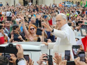 And she and Jon were excited to go to the papal audience. They arrived in St. Peter’s Square hours before the audience and waited for Pope Leo with people from around the world. And then he was there.