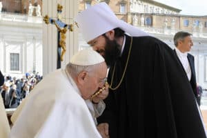 At the end of the pope’s weekly general audience in St. Peter’s Square May 3, Metropolitan Anthony was the first of the special guests to greet Pope Francis. The two shook hands and Pope Francis reached out and kissed the metropolitan’s encolpion, an icon Orthodox and Byzantine Catholic bishops wear instead of a pectoral cross.