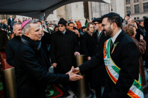 Ahead of the celebration, the mayor met privately with Archbishop Hicks on March 16 at the archbishop’s residence and returned for a March 17 reception. The two leaders also embraced outside St. Patrick’s Cathedral ahead of the parade.