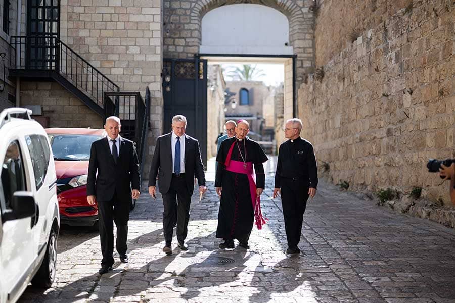 Archbishop Lori and others visit Holy Land to provide support, hope September 9, 2025By Christopher Gunty Catholic Review Filed Under: Conflict in the Middle East, Feature, Local News, News Archbishop William E. Lori and leaders of the Knights of Columbus and Catholic Near East Welfare Association visited Jerusalem, the Palestinian West Bank and other parts of the Holy Lands Sept. 2-6, connecting with ministries serving those in the conflict area. “What you see is that even in a time of great darkness and suffering, the light and the goodness and the glory of Christ shine through in these ministries,” Archbishop Lori said upon his return to Baltimore. “We came as pilgrims of hope. Certainly, we wanted to be a witness of hope to folks who are having a really hard time, but they also strengthen our hope. It was what the synod calls an exchange of gifts.” The pastoral visit was organized by CNEWA-Pontifical Mission, based in New York City, that supports the diverse humanitarian and pastoral works of the Eastern churches throughout the Middle East, Northeast Africa, India and Eastern Europe. Baltimore Archbishop William E. Lori, supreme Knight of the Knights of Columbus, and Monsignor Peter I. Vaccari, president of CNEWA-Pontifical Mission celebrate Mass Sept. 2, 2025, in Jerusalem. They were part of a delegation to discuss the work of Catholic Near East Welfare Association and the Knights of Columbus to support Catholic Christians in the Holy Land, as war continues in Gaza. (Michael J.L. La Civita, courtesy CNEWA) Monsignor Peter I. Vaccari, president of CNEWA, was accompanied by Archbishop Lori as supreme chaplain of the Knights of Columbus; Supreme Knight Patrick E. Kelly; and John A. Marrella, the Knights’ supreme secretary. In addition to his role as archbishop of Baltimore – his “first love and first responsibility” – Archbishop Lori wore several hats on the trip: as supreme chaplain for the Knights; as vice president of the U.S. Conference of Catholic Bishops; and as prior of the Middle Atlantic Lieutenancy of the Equestrian Order of the Holy Sepulcher, which also supports the Christian communities in the Holy Land. The Knights of Columbus have supported efforts of the Latin Patriarchate of Jerusalem for a long time, under the auspices of the organization’s Pacem in Terris Fund, named for Pope St. John XXIII’s 1963 encyclical on truth, justice, charity and liberty. However, the archbishop said, “given the disaster that is unfolding in Gaza, given the ongoing challenges of the center in the West Bank, we wanted to learn from CNEWA, which has been there for a long time, and from the patriarch and from the custos and from various ministries on the ground what it’s like, and what we can do.” He referred to Cardinal Pierbattista Pizzaballa, the Latin patriarch, and Franciscan Brother Francesco Ielpo, custos of the Holy Land for the Order of Friars Minor. On the visiting group’s first day in Jerusalem, they met with Brother Francesco to discuss his concerns and later met with Cardinal Pizzaballa. Archbishop Lori said the Knights’ leadership will discuss in the coming days how the order can provide assistance, but that one opportunity came up immediately. During a visit in Bethlehem to the Crèche, a Daughters of Charity ministry caring for abandoned babies and children, they learned the facility needed a new industrial washing machine, to which the Knights committed on the spot. The machine will be purchased through CNEWA and its local sources. “That’s just an example of things we might do,” the archbishop said. “But I think that of great importance there is (the need for) humanitarian aid right now on the ground, especially for the people who are suffering so terribly in the Gaza Strip, but more long-term support for the schools in the Holy Land that are run by the by the church; economic opportunity for the Palestinians, many of whom are emigrating; and then also healthcare.” He acknowledged that no single organization can do it all, but the question is how the Knights could be helpful in those more long-term endeavors as well. Michael J.L. La Civita, director of communications and marketing for CNEWA, told the Catholic Review that the visit by the group was appreciated by those they encountered. “We are demonstrating our care, our concern for them as the mother church, the church of Jerusalem.” Joseph Hazboun, regional director of Catholic Near East Welfare Association-Pontifical Mission in Jerusalem, Supreme Knight Patrick E. Kelly of the Knights of Columbus, Michael La Civita, director of communications for CNEWA, back, Archbishop William E. Lori of Baltimore, vice president of the U.S. Conference of Catholic Bishops, and Msgr. Peter I. Vaccari, president of CNEWA, are pictured during the archbishop’s pastoral visit to the Holy Land. (OSV News photo/Joseph Saadeh, courtesy CNEWA) He noted that the group visited people from the whole cycle of life: from unborn children to abandoned babies, from children in schools such as the K-12 school run by the Salesian Sisters to young adult students at Bethlehem University, from families and parishioners to those at the St. Nicholas Home for the Elderly in Beit Jala. La Civita said Kelly and Archbishop Lori came to “learn and listen” to understand how the church is responding to “the situation of war and oppression or war and occupation impacting the community, on both sides in Israel and in the Palestinian areas.” He said one of the problems is that unemployment is 70 percent in some areas, especially in the West Bank, and 100 percent – no employment – in Gaza. “The church worldwide is there to support them, to stand with them, that they are not forgotten,” La Civita said, adding that the people they encountered consistently said how much they appreciated the visit of people from the U.S. demonstrating their solicitude. La Civita said the church’s provision of aid has been “hamst