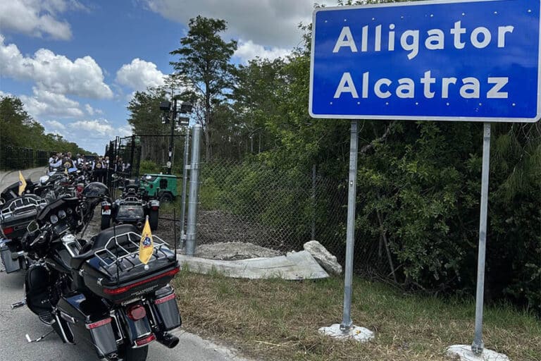 Archbishop Wenski leads Knights on Bikes to pray rosary at Alligator Alcatraz July 21, 2025By Gina Christian OSV News Filed Under: Immigration and Migration, Knights of Columbus, News, World News Archbishop Thomas G. Wenski of Miami and some 25 Knights of Columbus saddled up their motorcycles to pray a rosary at the entrance of Alligator Alcatraz, the controversial migrant detention center recently opened in the Florida Everglades. Archbishop Thomas G. Wenski of Miami and Knights on Bikes pray the rosary for detainees at the entrance to Alligator Alcatraz, a controversial immigration detention facility in some 55 miles from Miami in the Florida Everglades, July 20, 2025. (OSV News photo/Archbishop Thomas G. Wenski) The archbishop posted images of the July 20 gathering to his X account, saying that he and his fellow riders — members of the Knights of Columbus’ Knights on Bikes International fraternal organization — “stopped at the entrance of Alligator Alcatraz and prayed a rosary for the detainees.” Images shared by the archbishop showed the men standing in a circle, bikes parked and heads bowed in prayer, with the Knights of Columbus logo and a cross prominently stitched on the back of their vests. In his post, Archbishop Wenski noted that the Archdiocese of Miami “is still waiting for approval to access” Alligator Alcatraz “to provide Mass for detainees.” According to a recent report by organizations affiliated with Catholic and evangelical Christian churches, Christians account for approximately 80% of all of those at risk of deportation. The Christians most at risk of deportation are Catholics, 61 percent of the total. Alligator Alcatraz, located some 55 miles from downtown Miami at the Dade Collier Training and Transition Airport, consists of tents with groups of bunk beds in cage-like units of chain-link fencing, and exposed communal toilets. Water, sewage management, power and air conditioning are supplied by portable units, according to Florida Governor Ron DeSantis. The facility, estimated to hold 3,000 people, has plans to be expanded to accommodate 5,000. Alligator Alcatraz has drawn condemnation from clergy and Democratic lawmakers alike for its conditions and location — with Trump, Homeland Security Security Kristi Noem and DeSantis, a Catholic, touting the hostile environment as a security feature and immigration deterrent during their July 1 tour inaugurating the opening of the facility. “It basically is in a swamp,” Archbishop Wenski told OSV News in a July 15 interview. “There are numerous alligators and pythons (and) boa constrictors, and tons and tons of mosquitoes.” Archbishop Thomas G. Wenski of Miami and Knights on Bikes pray the rosary for detainees at the entrance to Alligator Alcatraz, a controversial immigration detention facility in some 55 miles from Miami in the Florida Everglades, July 20, 2025. (OSV News photo/Archbishop Thomas G. Wenski) The tarmac on which the tents have been built “becomes even hotter because it’s reflecting the heat of the day,” he said. Detainees have told The New York Times that the frequent rains have created leaks and insect intrusions, while access to showers, full meals and medication is limited. Illness, sleep deprivation and unrest is also in evidence, they said. NBC 6 South Florida reported that from July 1-18, there were 34 emergency calls to 911 from Alligator Alcatraz, an average of two per day. Speaking to OSV News July 15, Archbishop Wenski also noted that the site is “far removed from hospitals.” One government official, speaking on condition of anonymity, told the Times that most of those detained at Alligator Alcatraz do not have criminal convictions. Records obtained by The Miami Herald/Tampa Bay Times show only a third of those currently housed at the site have criminal histories. “There’s more questions than answers about this place,” Archbishop Wenski told OSV News July 15. He said, “We don’t want dangerous people walking the streets freely. But the majority of the immigrants are not bad actors. They’re basically people that have tried to, through hard work, create a future of hope for themselves and their children. And as such, they have contributed to the prosperity of our nation. And some have done so for years, even decades.” The archbishop added, “There’s no home to go back to, because home is here.” Read More Immigration & Migration Celebrity chef ‘Lidia’ hasn’t forgotten what it’s like to be a refugee. Here’s how she’s giving back The Cabrini Pledge: An invitation to be keepers of hope Chicago Catholic coalition sues ICE over denial of holy Communion, pastoral care Pope calls treatment of migrants in U.S. ‘extremely disrespectful’ White House ‘border czar’ calls U.S. bishops ‘wrong’ after immigration statement U.S. bishops approve ‘special pastoral message’ in Baltimore on immigration Copyright © 2025 OSV News Print