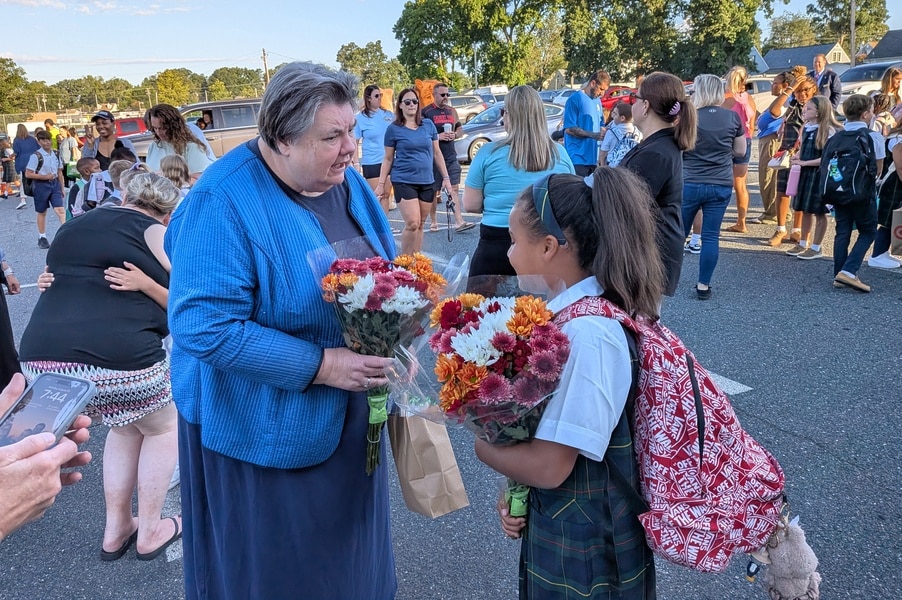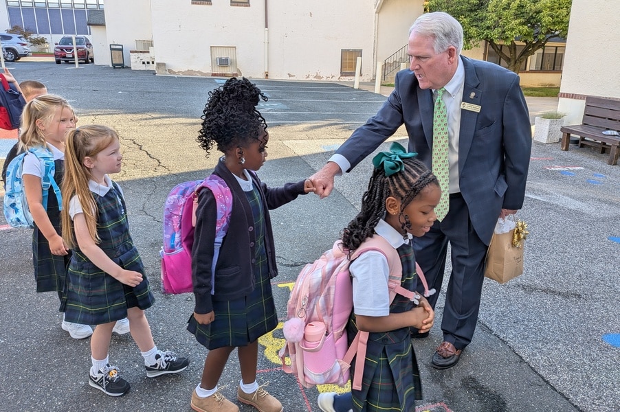 Archdiocese of Baltimore schools celebrate first day of school August 26, 2025By Katie V. Jones Catholic Review Filed Under: Feature, Local News, News, Schools ESSEX – Cheers and applause filled the parking lot of Our Lady of Mount Carmel School on the first day of school as students were dropped off and greeted by staff and the school’s mascots, cougars Max and Cocoa, Aug. 25. Sister Patricia McCarron, superintendent of the Archdiocese of Baltimore schools, receives flowers from Olivia Klacik, a fourth-grade student at Our Lady of Mt. Carmel School. (Katie V. Jones/CR Staff) After middle school students entered the school for their first day, elementary students lined up by grades before proudly marching into the school. Gregory A. Farno, chancellor of education for the Archdiocese of Baltimore, greeted them outside with fist bumps as they passed and School Sister of Notre Dame Patricia McCarron, superintendent of the Archdiocese of Baltimore’s Catholic schools, greeted them inside. “This is one of the best days of the year,” Sister Patricia said, as she smiled at students. “It is so exciting. There is a fabulous spirit of energy.” Principal Jennifer Leynes was pleased that the morning’s festive atmosphere kept students positive. “Not a lot of tears today! Only two,” Leynes said. “It worked!” At St. Casimir School in Baltimore, students walked in on a red carpet with bubbles blowing, according to Principal Noreen Heffner. Gregory A. Farno, chancellor of education for the Archdiocese of Baltimore, fist pumps students at Our Lady of Mount Carmel School in Baltimore on the first day of school, Aug. 25. (Katie V. Jones/CR staff) “The kids were excited,” Heffner said. “It made the fear go away.” As schools across the archdiocese opened their doors for the start of the 2025-26 school year, Sister Patricia and Farno spent the morning visiting three schools – Our Lady of Mount Carmel, St. Francis of Assisi and St. Casimir – to welcome back students and staff. “I’m so excited and thankful to have the kids back on campus,” Kelly Medvigy, assistant principal at Our Lady of Mount Carmel School said. “They’re energy; we feed off of their energy.” Father John Streifel, pastor, also was happy to see the children return. “It is quite a nice moment,” Father Streifel said, as he greeted students. “We’re certainly grateful Sister Patricia and Greg could be here.” Lou Illg sports a first-day of Pre-K hat Aug. 25, at St. Casimir School in Baltimore. (Stephen Herrera-Special to the Review) Leynes and Medvigy allowed Farno to ring the school’s bell – a privilege typically reserved for the fourth graders to herald the end of the day. “Everyone is so well behaved,” Farno said, as he left a classroom. At St. Francis of Assisi School, Sister Patricia and Farno welcomed back students during an assembly about school policies. “You are going to learn so much,” Sister Patricia told them. “I am going to tell you one thing that is super, super important: God loves you. Because God loves us, we can do anything.” At all her stops, Sister Patricia reminded students of God’s love for them through both good and challenging times. “Thank you for sharing your message with us,” St. Francis of Assisi Principal John Seibel said. “We all want a deeper relationship with God.” Anna Merriam, a fourth-grade teacher at St. Francis, welcomed everyone to her class. Conventual Franciscan Father Dennis Grumsey, pastor of St. Casimir Church in Baltimore, welcomes students to the parish school Aug. 25. (Stephen Herrera-Special to the Review) “These are my fabulous five,” she said, gesturing to her class. “Everything has been great so far.” Heffner showed off St. Casimir’s renovated teacher’s lounge, which was done by school parents. The school’s steps were also painted and a large classroom on an upper level was made into two, she said. “I’m glad the first day is here. The summer was busy, so many things to get ready,” Heffner said. Sister Patricia said afterward that the “mission of Catholic education is alive and well.” She was most pleased with the response a young student gave her at St. Casimir when she asked what their favorite part of school was. “She said, ‘all of it,’” Sister Patricia said. “That says it all. I’m just thrilled.” Email Katie V. Jones at kjones@CatholicReview.org Read More Schools Calvert Hall holds off Loyola Blakefield to claim a 28-24 victory in the 105th Turkey Bowl Maryland pilgrims bring energy and joy to NCYC 2025 5 Things to Know about the 2025 Turkey Bowl Mercy High School freshman set to ask question of Pope Leo XIV Baltimore-area Catholic school students take active role in Ignatian Teach-In Faith, fortitude inspire St. Mary’s freshman through journey with kidney disease Copyright © 2025 Catholic Review Media Print