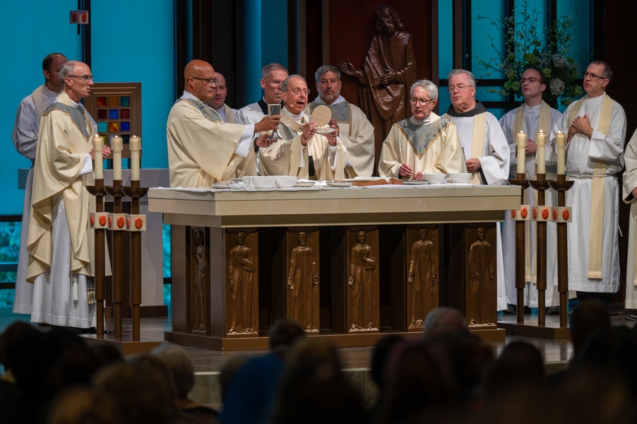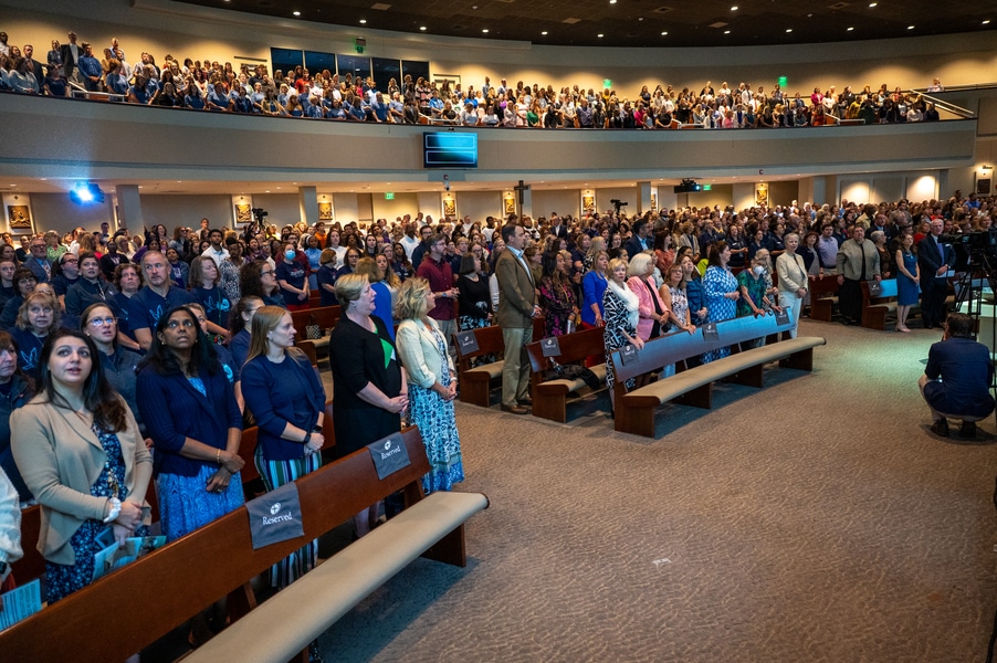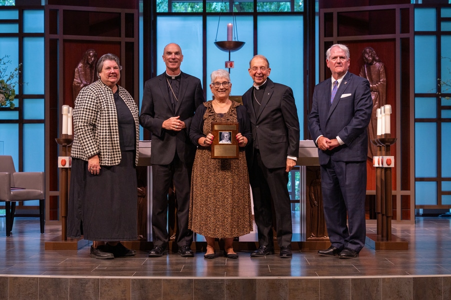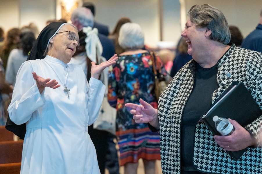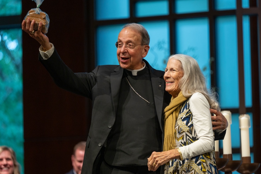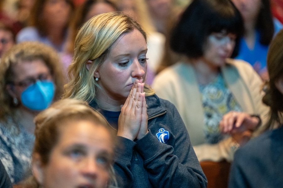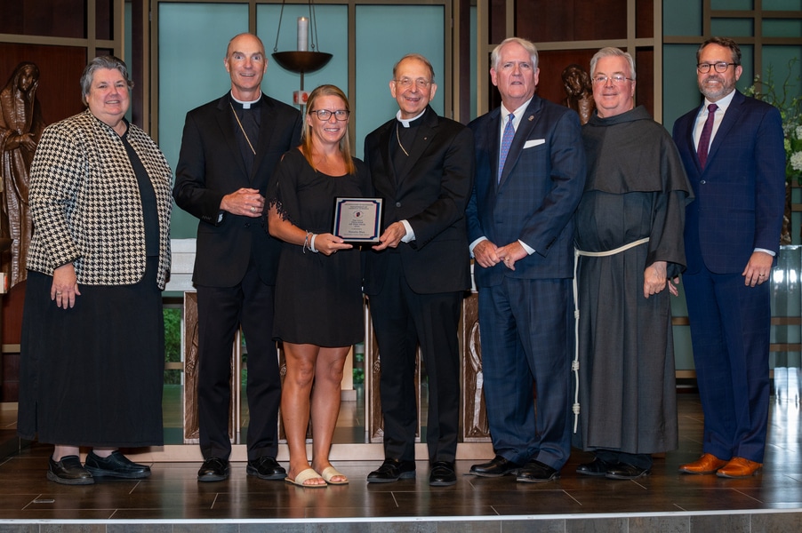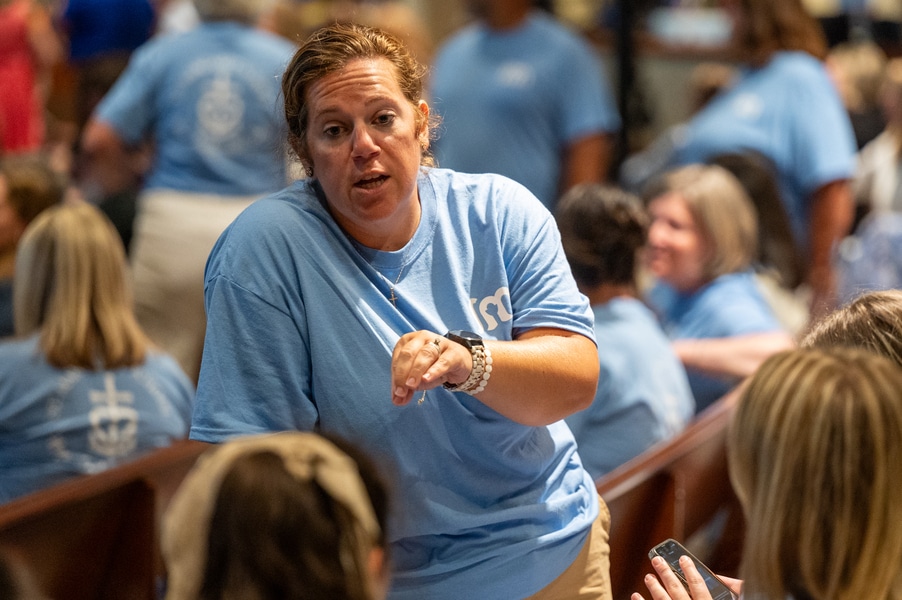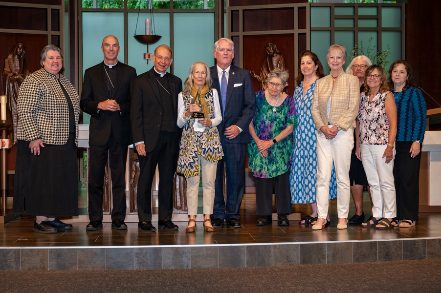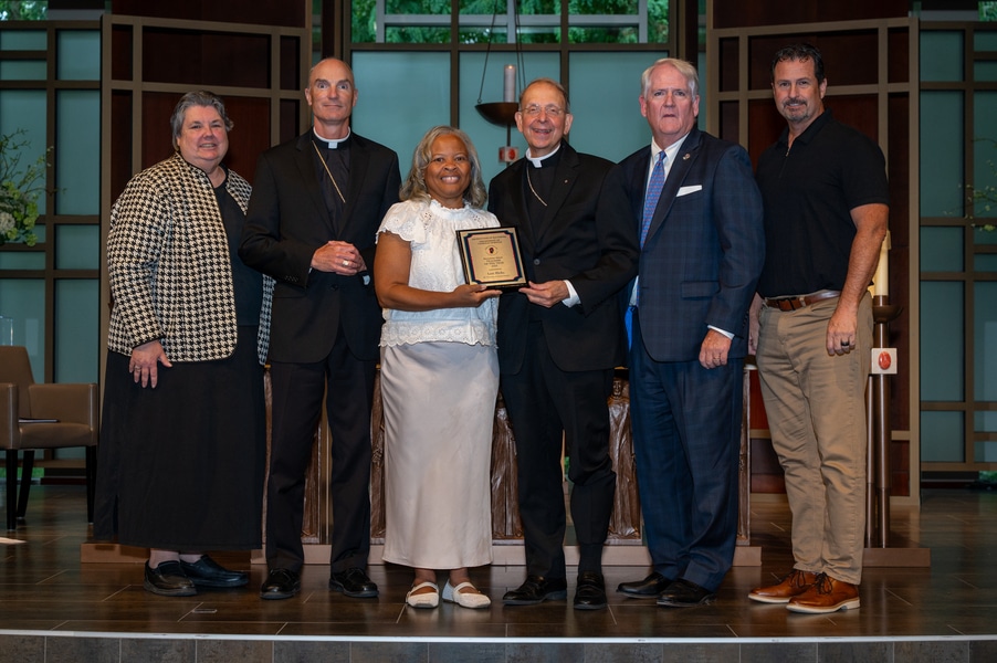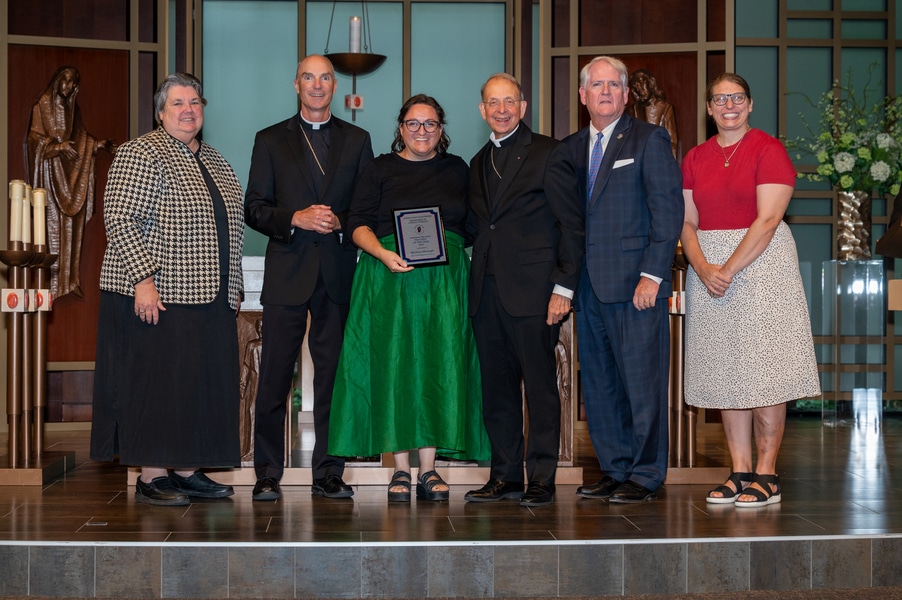 Archdiocese of Baltimore’s Catholic schools convocation celebrates teachers August 26, 2025By Katie V. Jones Catholic Review Filed Under: Feature, Local News, News, Schools TIMONIUM – School Sister of Notre Dame Patricia McCarron spent her first official day as superintendent of the Archdiocese of Baltimore’s Catholic schools celebrating with the teachers she oversees. During her remarks at the Catholic Education Convocation Mass and awards ceremony Aug. 21 at the Church of the Nativity in Timonium, School Sisters of Notre Dame Patricia McCarron, reminds everyone in attendance that they bring hope to their students and families as the academic year begins. (Kevin J. Parks/CR Staff) The former head of Notre Dame Preparatory School in Towson was all smiles as she addressed the crowd of more than 1,600 educators hailing from across the diocese – from Bishop Walsh School in Cumbersland to Joan of Arc School in Aberdeen – gathered Aug. 21 in the Church of the Nativity in Timonium. “I cannot think of a better way to start my first day than sharing this beautiful liturgy together as a faith community,” Sister Patricia said, after being introduced by Gregory A. Farno, chancellor of education. “My parents’ deep and unwavering commitment to their Catholic faith and the tremendous sacrifices they made to provide their four children with Catholic school educations, made all the difference. The values that were foundational to our family life were reinforced daily in my Catholic school education and have been a driving force in my life.” The event began with a Mass celebrated by Archbishop William E. Lori, who, in his homily, reflected on the practices of Pope St. Pius X and provided three points of reflection. Archbishop William E. Lori receives a gift from Betty Contino, chair and CEO of the Women’s Education Alliance, a partner of the Archdiocese of Baltimore Catholic Schools. The unscripted moment took place during the Catholic Education Convocation Mass and awards ceremony Aug. 21 at the Church of the Nativity in Timonium. (Kevin J. Parks/CR Media) First, love young people by being “faithful, hope-filled witnesses who lead children and parents alike to seek and find the Lord in the church’s sacramental life.” Second, many young people, the archbishop said, now “live online” and are “subject to deception and confusion … even more so with the advent of AI (artificial intelligence).” He thanked the teachers for being faithful witnesses who help students “find in Christ the answer to their questions, the source of their dignity and the one who loves them like no other.” Following Christ and his teachings is not easy, the archbishop said, and his third point reminded everyone that as pilgrims of hope, they are also pilgrims of love, who “strive to restore all things in Christ.” “Thank you for loving the Lord in the midst of your daily challenges,” Archbishop Lori said. A ceremony after the Mass recognized teachers for their years of service, celebrated each school’s teacher of the year and honored the three archdiocesan teachers of the year: Marlena Murtagh, independent Catholic high school teacher of the year; Natalie Hax, archdiocesan high school teacher of the year; and Lori Hicks, archdiocesan elementary school teacher of the year. During one of several lighthearted moments of the morning, Bishop Adam J. Parker humorously dismisses his closing remarks, stating they could not be used because they were generated by AI. His comment came after earlier remarks made by Joe Olzewski, director of technology for the Archdiocese of Baltimore, during the Catholic Education Convocation held at the Church of the Nativity on Aug. 21 in Timonium. (Kevin J. Parks/CR Media) The Doris Musil Award was presented to Lisa Madgar, who is currently an administrative assistant at Immaculate Heart of Mary School in Towson, but has worn many hats, including assistant principal at St. Ursula School and as coordinator of special projects for Catholic schools. “I am overwhelmed and humbled when I look around the room and see all the deserving individuals who answered the call to work in and for our schools every day,” Madgar said. “I am grateful for the opportunity I have had to work with so many talented and committed individuals who use their hands, their feet, their hearts, their minds and their souls as they endeavor to build the kingdom of God.” This year marked the first time the Archdiocese of Baltimore Catholic schools presented its annual partnership award during the convocation. Betty Contino, CEO of the Women’s Education Alliance, accepted the award for the nonprofit, which partners with four archdiocese schools – Archbishop Border School, Bishop Walsh School, Cardinal Shehan School and Mother Mary Lange Catholic School. “We‘re so proud of the schools we serve,” Contino said. “We have had the privilege of serving them and the children for these many years. It’s a blessing to partner.” Amy Strickland, a fourth-grade teacher at Immaculate Heart of Mary in Towson, enjoys attending the convocation, she said after the Mass, as it shows her school is part of a larger community, the Archdiocese of Baltimore. She was looking forward to the first day of school, Aug. 25. “They are so fun,” Strickland said, of her students. “To watch them light up with ideas.” Gregory A. Farno, chancellor of education for the Archdiocese of Baltimore, personally greets teachers and staff before the Catholic Education Convocation Mass and awards Aug. 21 at the Church of the Nativity in Timonium. (Kevin J. Parks/CR Staff) Erica Fabrizio, an art teacher at Bishop Walsh School in Cumberland, also looked forward to the first day of school. “I’m ready for the kids to come into the classroom and start creating again,” she said. “To all of you, I wish you a very, very blessed and wonderful school year,” Auxiliary Bishop Adam J. Parker said in his closing rem