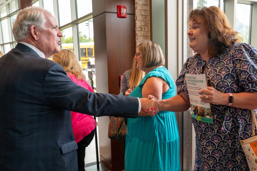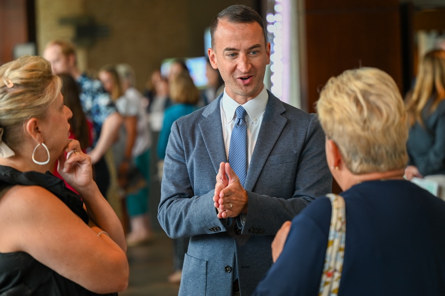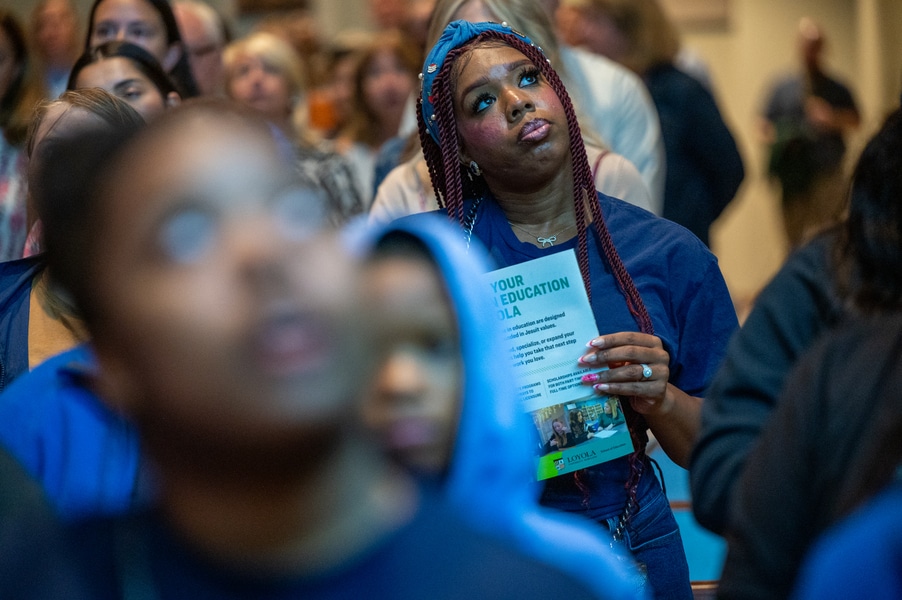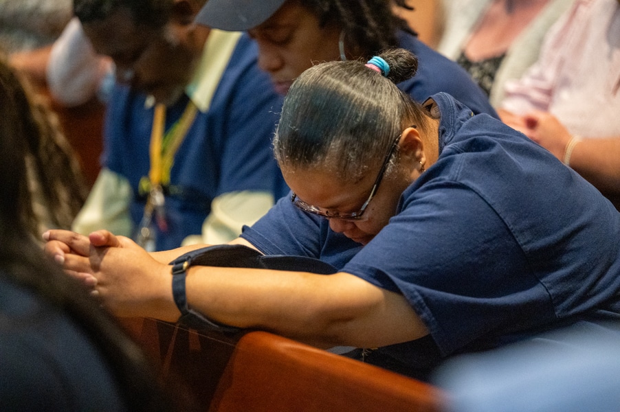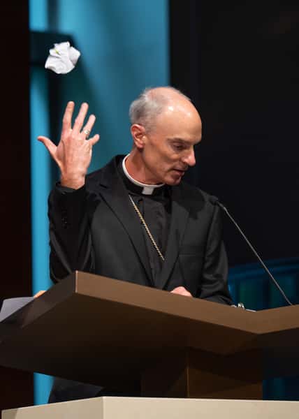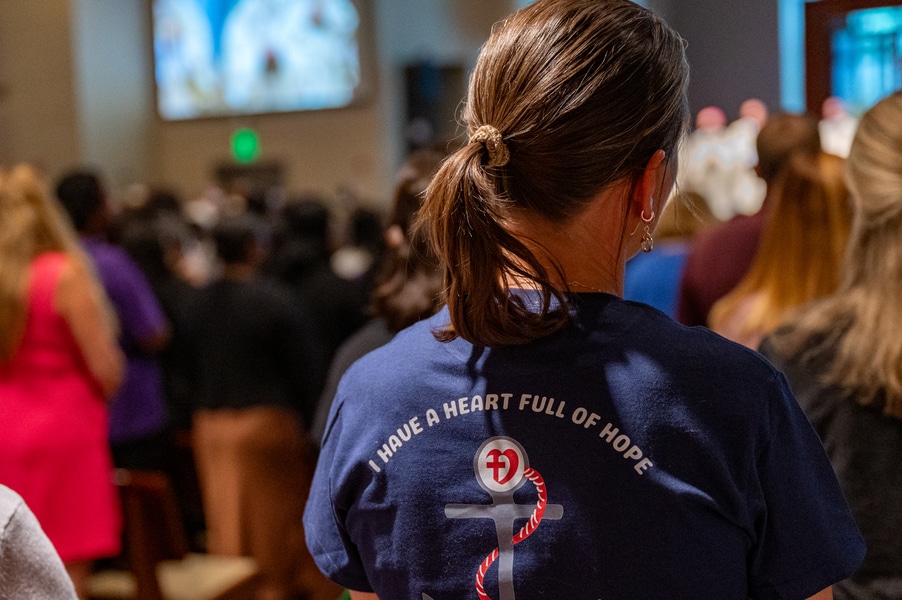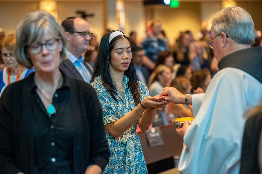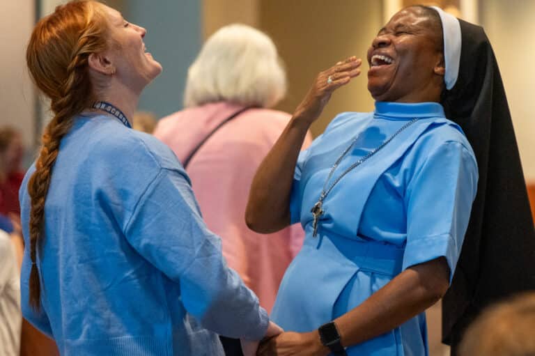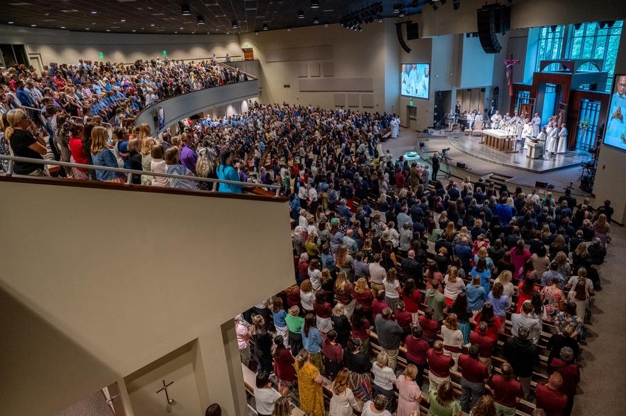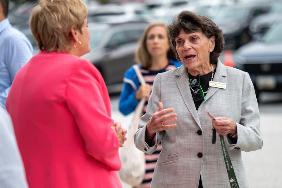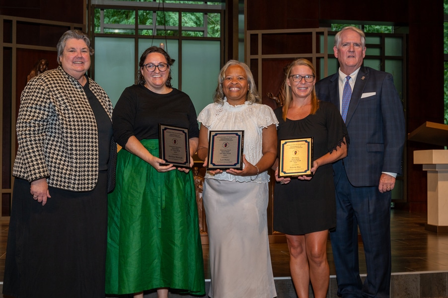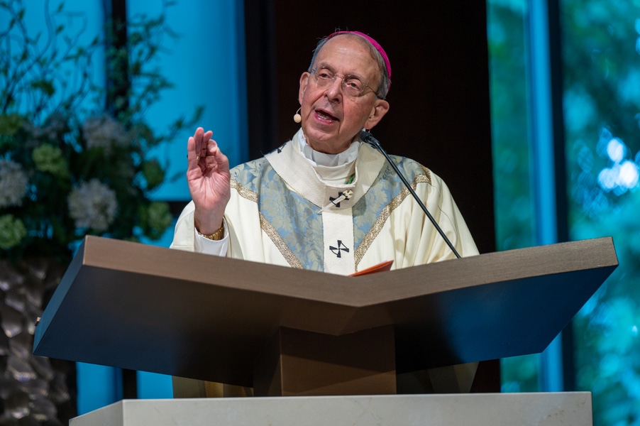 Archdiocese of Baltimore’s Catholic schools convocation celebrates teachers August 26, 2025By Katie V. Jones Catholic Review Filed Under: Feature, Local News, News, Schools TIMONIUM – School Sister of Notre Dame Patricia McCarron spent her first official day as superintendent of the Archdiocese of Baltimore’s Catholic schools celebrating with the teachers she oversees. During her remarks at the Catholic Education Convocation Mass and awards ceremony Aug. 21 at the Church of the Nativity in Timonium, School Sisters of Notre Dame Patricia McCarron, reminds everyone in attendance that they bring hope to their students and families as the academic year begins. (Kevin J. Parks/CR Staff) The former head of Notre Dame Preparatory School in Towson was all smiles as she addressed the crowd of more than 1,600 educators hailing from across the diocese – from Bishop Walsh School in Cumbersland to Joan of Arc School in Aberdeen – gathered Aug. 21 in the Church of the Nativity in Timonium. “I cannot think of a better way to start my first day than sharing this beautiful liturgy together as a faith community,” Sister Patricia said, after being introduced by Gregory A. Farno, chancellor of education. “My parents’ deep and unwavering commitment to their Catholic faith and the tremendous sacrifices they made to provide their four children with Catholic school educations, made all the difference. The values that were foundational to our family life were reinforced daily in my Catholic school education and have been a driving force in my life.” The event began with a Mass celebrated by Archbishop William E. Lori, who, in his homily, reflected on the practices of Pope St. Pius X and provided three points of reflection. Archbishop William E. Lori receives a gift from Betty Contino, chair and CEO of the Women’s Education Alliance, a partner of the Archdiocese of Baltimore Catholic Schools. The unscripted moment took place during the Catholic Education Convocation Mass and awards ceremony Aug. 21 at the Church of the Nativity in Timonium. (Kevin J. Parks/CR Media) First, love young people by being “faithful, hope-filled witnesses who lead children and parents alike to seek and find the Lord in the church’s sacramental life.” Second, many young people, the archbishop said, now “live online” and are “subject to deception and confusion … even more so with the advent of AI (artificial intelligence).” He thanked the teachers for being faithful witnesses who help students “find in Christ the answer to their questions, the source of their dignity and the one who loves them like no other.” Following Christ and his teachings is not easy, the archbishop said, and his third point reminded everyone that as pilgrims of hope, they are also pilgrims of love, who “strive to restore all things in Christ.” “Thank you for loving the Lord in the midst of your daily challenges,” Archbishop Lori said. A ceremony after the Mass recognized teachers for their years of service, celebrated each school’s teacher of the year and honored the three archdiocesan teachers of the year: Marlena Murtagh, independent Catholic high school teacher of the year; Natalie Hax, archdiocesan high school teacher of the year; and Lori Hicks, archdiocesan elementary school teacher of the year. During one of several lighthearted moments of the morning, Bishop Adam J. Parker humorously dismisses his closing remarks, stating they could not be used because they were generated by AI. His comment came after earlier remarks made by Joe Olzewski, director of technology for the Archdiocese of Baltimore, during the Catholic Education Convocation held at the Church of the Nativity on Aug. 21 in Timonium. (Kevin J. Parks/CR Media) The Doris Musil Award was presented to Lisa Madgar, who is currently an administrative assistant at Immaculate Heart of Mary School in Towson, but has worn many hats, including assistant principal at St. Ursula School and as coordinator of special projects for Catholic schools. “I am overwhelmed and humbled when I look around the room and see all the deserving individuals who answered the call to work in and for our schools every day,” Madgar said. “I am grateful for the opportunity I have had to work with so many talented and committed individuals who use their hands, their feet, their hearts, their minds and their souls as they endeavor to build the kingdom of God.” This year marked the first time the Archdiocese of Baltimore Catholic schools presented its annual partnership award during the convocation. Betty Contino, CEO of the Women’s Education Alliance, accepted the award for the nonprofit, which partners with four archdiocese schools – Archbishop Border School, Bishop Walsh School, Cardinal Shehan School and Mother Mary Lange Catholic School. “We‘re so proud of the schools we serve,” Contino said. “We have had the privilege of serving them and the children for these many years. It’s a blessing to partner.” Amy Strickland, a fourth-grade teacher at Immaculate Heart of Mary in Towson, enjoys attending the convocation, she said after the Mass, as it shows her school is part of a larger community, the Archdiocese of Baltimore. She was looking forward to the first day of school, Aug. 25. “They are so fun,” Strickland said, of her students. “To watch them light up with ideas.” Gregory A. Farno, chancellor of education for the Archdiocese of Baltimore, personally greets teachers and staff before the Catholic Education Convocation Mass and awards Aug. 21 at the Church of the Nativity in Timonium. (Kevin J. Parks/CR Staff) Erica Fabrizio, an art teacher at Bishop Walsh School in Cumberland, also looked forward to the first day of school. “I’m ready for the kids to come into the classroom and start creating again,” she said. “To all of you, I wish you a very, very blessed and wonderful school year,” Auxiliary Bishop Adam J. Parker said in his closing rem