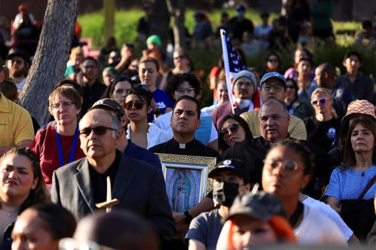 As chaotic demonstrations erupt across U.S., Catholic experts counsel nonviolence June 12, 2025By Kimberly Heatherington OSV News Filed Under: Catholic Social Teaching, Feature, Immigration and Migration, News, World News The crowd of hundreds — including clergy from many denominations, leaders and supporters of faith advocacy groups, and church congregants — were peaceful and respectful when they gathered near the U.S. Capitol June 10 for a “Pentecost Witness for a Moral Budget.” But they were nonetheless stirred — vocally urging Congress to protect Medicaid, SNAP food assistance benefits, and other programs targeted for what they say are crippling cuts in the Trump administration’s One Big Beautiful Bill Act (H.R. 1), now under review in the U.S. Senate. In defending the bill, House Speaker Mike Johnson, R-La., has called the claim it makes drastic cuts in medicaid “misinformation” and that Medicaid coverage for people who need it is not threatened. People hold signs during a demonstration in Washington June 10, 2025, as part of nationwide protests in solidarity with Los Angeles protests against federal immigration sweeps. (OSV News photo/Nathan Howard, Reuters) But organizers of the vigil — including Georgetown University’s Center on Faith and Justice — earlier declared, “Stripping support from the nation’s most vulnerable communities in order to cut taxes for the rich is a moral tradeoff … followers of Jesus must not accept.” So what did they do? They rallied in protest. And being people of faith, they did it nonviolently. It’s an important precept of Catholic citizenship: Ethical disagreement with public policy — and a desire to peacefully change it — is a worthy undertaking. It’s also in contrast to aggressive encounters recently breaking out across America — in Los Angeles, where 4,000 U.S. National Guard troops and 700 Marines are deployed, in Minneapolis and in New York — as communities physically react to Immigration and Customs Enforcement raids detaining their neighbors who are in the country without legal documents. Los Angeles Archbishop José H. Gomez urged restraint. “We all agree that we don’t want undocumented immigrants who are known terrorists or violent criminals in our communities,” Archbishop Gomez said June 9. “But there is no need for the government to carry out enforcement actions in a way that provokes fear and anxiety among ordinary, hardworking immigrants and their families.” Protests that began June 6 with relative calm have since escalated to scenes of burning cars, violent clashes with police and hundreds of arrests. Meanwhile, officials — including California Gov. Gavin Newsom and LA Mayor Karen Bass — maintain the chaos is limited to a small downtown section of the city. Demonstrators react to crowd control munitions being shot at them by law enforcement in downtown Los Angeles June 10, 2025, as protests against federal immigration sweeps continue. OSV News photo/Leah Millis, Reuters) “Living, speaking, and acting without violence is not giving up, it is not losing or giving up anything,” Pope Francis said in April 2023, “but aspiring to everything.” How then, to effectively encourage change in a culture that too often resorts to force — or ignores those who don’t? OSV News spoke with experts in peacebuilding to explore Catholic principles of nonviolent protest. “If you are interested in joining a protest or demonstration,” said Meghan J. Clark, professor of moral theology at St. John’s University in Queens, New York. “I would urge Catholics to prepare.” Clark — who previously wrote, “Protest is not merely about justice; it is an act of faith” — suggests preparation in three key areas, particularly for action concerning immigration issues. “First, information: Make sure you learn about what is going on. It is also important to know what to bring and what to leave at home,” she advised. “Ignatian Solidarity Network and CLINIC (Catholic Legal Immigration Network Inc.) are perfect places to start. They offer a wealth of information, practical guides and narrative stories.” Next, Clark counseled prayer. “Prayer, discernment, and reflection are crucial to prepare oneself to engage in active nonviolent protest. Dr. Martin Luther King, Jr., developed principles of active nonviolence that I would urge Catholics to utilize in spiritually preparing themselves,” she said. “When we prepare ourselves spiritually, then it is easier to resist fear, intimidation, and escalation in a tense situation.” A woman holding a Mexican flag stands on Sixth Street Bridge after a curfew for downtown Los Angeles was issued, following protests against federal immigration sweeps, June 10, 2025. (OSV News photo/David Swanson, Reuters) And lastly, community. “Participation in demonstrations is best done with others. Even if you do not know anyone else interested in going, when you join the demonstration, get to know your neighbors,” Clark recommended. “In joining together to protest injustice, we create new moments of encounter and solidarity among each other.” Gerard Powers — director of Catholic peacebuilding studies and coordinator of the Catholic Peacebuilding Network at Notre Dame University’s Kroc Institute for International Peace Studies — agreed. Powers cited the crucial role Catholics have had in nonviolent protests — from People Power in the Philippines and Solidarity in Poland, to the anti-Iraq War protests in 2003 and the annual March for Life in Washington. “To maintain the moral high ground and be effective, protests must remain nonviolent, organized and disciplined, and strategically focused on the injustice at issue,” Powers explained. “If protests become random and associated — even if unintentionally — with violence, they should cease, and alternative means of opposing the injustice should be pursued.” Nor can protests be the only tool of op