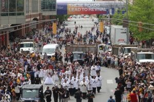 That gift literally took a road trip, when — from May 17 to July 16, 2024, on routes north, south, east and west — a total of 250,000 participants processed 6,500 miles in the National Eucharistic Pilgrimage across America. The routes eventually converged on Indianapolis for the 10th National Eucharistic Congress from July 17-21, 2024, which was attended by more than 60,000 participants.