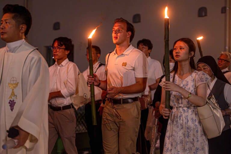 At 80th anniversary Mass in Nagasaki, people urged to bring Christ’s love, peace to world August 12, 2025By Mark Zimmermann OSV News Filed Under: Feature, News, World News In his homily at a solemn Peace Memorial Mass Aug. 9, Archbishop Peter Michiaki Nakamura of Nagasaki, Japan, issued a passionate plea to the world. “We must abandon the fists, weapons, and tools of violence we hold in our hands, and stop creating and using nuclear weapons. Let us use our hands to love and embrace others,” he said. The Mass was offered at Urakami Cathedral in Nagasaki on the exact day that 80 years ago the U.S. dropped an atomic bomb on that city — which followed by three days the Aug. 6, 1945, U.S. atomic bombing of Hiroshima, Japan. At the Mass, Japanese Catholics were joined by four U.S. prelates — two cardinals and two archbishops — and by Catholic university leaders and students from the United States who were participating in a “Pilgrimage of Peace” to commemorate the 80th anniversary of the bombings and to pray together for peace and for a world without nuclear weapons. The city of Nagasaki, Japan, shows scant signs of recovery four years after an atomic bomb was detonated over the city Aug. 9, 1945. (OSV News photo/Milwaukee Journal Sentinel files, USA TODAY NETWORK via Reuters) In an English translation of Archbishop Nakamura’s homily, which he had delivered in Japanese, he recounted the horror that the nuclear bombing unleashed on that city. “Eighty years ago, on August 9, 1945, at 11:02 a.m., an atomic bomb exploded approximately 500 meters above Urakami in Nagasaki. The city was reduced to a wasteland. At that time, 74,000 of Nagasaki’s 240,000 residents lost their lives. In Urakami alone, more than half of the 12,000 parishioners, totaling 8,500 people, lost their lives. The Urakami Cathedral, once hailed as ‘the largest cathedral in the East,’ was almost completely destroyed,” he said. Before the Mass, a new bell donated by U.S. Catholics rang out for the first time in one of the two bell towers of Urakami Cathedral, replacing a bell that had been destroyed in the bombing. Urakami Cathedral was rebuilt in 1959 with one of the original bells recovered in the rubble of the original cathedral. As a sign of solidarity and faith from U.S. Catholics, the Nagasaki Bell Project raised funds for the casting and installation of the new bell, which rang together with the recovered bell at 11:02 a.m. — the moment when the atomic bomb exploded over the city in 1945. As the Peace Memorial Mass at Urakami Cathedral began, Archbishop Nakamura blessed with incense two damaged religious artifacts that had been recovered in the rubble of the original cathedral after the bombing — the head of a wooden statue of Mary and a wooden crucifix with the figure of Jesus missing his head and limbs. Those two items were displayed near the altar during the Mass, and the archbishop framed his homily around them. He told the story of a church in Germany damaged by bombing during World War II, and the arms of Jesus on its cross were missing. After the war, they kept the cross where it was, and in the place of the cross beam where Jesus’s arms were missing, they put an inscription in German that read, “I have no hands but yours.” “A similar thing happened here in Nagasaki. The head, hands and feet of Jesus on the cross that you see next to this altar are also missing. Mary’s head is still there, but her face is blackened, and her eyes are gone. It was our hands that started wars and created weapons of mass destruction,” Archbishop Nakamura said. Noting that people use their hands, feet and minds to hurt others, Nagasaki’s archbishop said, “We must work together with the hands of Jesus. More than that, we must live as the hands of Jesus. … Our hope lies in God’s hands. Let us live as God’s hands.” Concluding his homily, Archbishop Nakamura said, “Our peace depends on what we do. … Our peace depends on how we walk. It depends on our feet, our way of thinking, our perspective, and our way of life. In other words, our peace depends on living like Christ. This means thinking, speaking, acting and loving like Christ. “For that reason, let us once again begin our true journey by gazing upon Jesus and Mary who survived the bombing, and considering how they became like this out of love for us.” During the Mass, Archbishop Francisco Escalante Molina, the Vatican’s apostolic nuncio to Japan, noted that people had journeyed together to commemorate the anniversaries of the atomic bombings in Hiroshima and Nagasaki, “to offer our prayers for those how suffered and those who died, and for lasting peace among all people.” He noted that week included interreligious gatherings and meetings with civil authorities, religious leaders, diplomatic representatives and Hibakusha, survivors of the atomic bombings, to pray for peace, “a prayer that must never end.” Archbishop Molina read a message from Pope Leo XIV, who offered respect to the Hibakusha, as the survivors of the atomic bombings are known. Their “stories of loss and suffering are a timely summons to all of us to build a safer world and foster a climate of peace,” he said. Hiroshima and Nagasaki “remain living reminders of the profound horrors wrought by nuclear weapons. Their streets, schools and homes still bear scars — both visible and spiritual — from that fateful August of 1945,” the pope said. Quoting words often said by Pope Francis, he said, “War is always a defeat for humanity.” Decrying nuclear weapons, Pope Leo said, “True peace demands the courageous laying down of weapons — especially those with the power to cause an indescribable catastrophe. Nuclear arms offend our shared humanity and also betray the dignity of creation, whose harmony we are called to safeguard.” The concelebrants at the Mass included the four U.S. prelates participating in the “Pilgrimage of Peace”: Washing