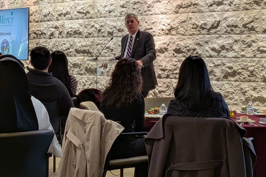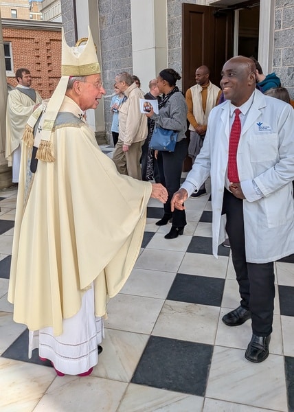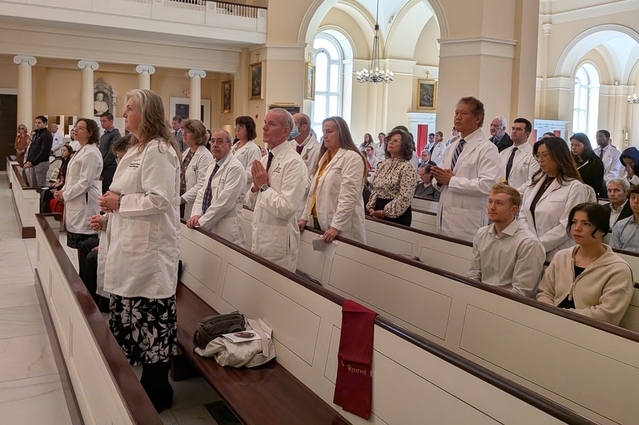 At Baltimore White Mass event, theologian warns Catholic medical professionals they are on the front lines of a cultural crisis October 28, 2025By Katie V. Jones Catholic Review Filed Under: Feature, Health Care, Local News, News Catholic theologian and author George Weigel warned that the Catholic faith is facing a “great crisis,” and those in the medical profession are “on the front lines” of that battle. George Weigel speaks to the Baltimore Guild of the Catholic Medical Association during a luncheon following the White Mass Oct. 26. (Katie V. Jones/CR Staff). Speaking Oct. 26 at the Baltimore Guild of the Catholic Medical Association’s White Mass luncheon at Mercy Medical Center in Baltimore, Weigel said the modern West’s view of humanity – as “just congealed stardust, the fortuitous result of random cosmic biochemical forces that, in the 15 billion or so years since the Big Bang, just happened to produce us” – has created a deep divide in understanding the human person. That worldview, the Baltimore native said, denies both humanity’s purpose and its divine origin. “There is no given nature. Our destiny is oblivion. The gratification of our desires, whatever they may be, is the most we can hope for,” he said. That outlook, he added, fuels the “mantra of ‘choice,’” manifesting in abortion, euthanasia and “gender-affirming” procedures as attempts to answer the question, “Who are we?” Catholics, Weigel said, reject that definition of the human person. They affirm the message of Psalm 8: “That we have come from someone (and) that that someone has endowed us with a unique dignity and that we are going somewhere.” Archbishop William E. Lori greets Dr. Abel B. Batuure following the White Mass Oct. 26. (Katie V. Jones/CR Staff) Weigel’s talk followed the annual White Mass, celebrated by Archbishop William E. Lori at the Basilica of the National Shrine of the Assumption of the Blessed Virgin Mary. More than 440 people, including doctors, nurses, medical students and other professionals, attended the liturgy, many wearing their white coats. The Mass, organized by the Baltimore Guild, is held near Oct. 18, the feast of St. Luke, patron saint of physicians. In his homily, Archbishop Lori thanked Catholic medical professionals for their dedication and urged them to serve with humility. “Humility,” he said, “is recognizing that we are not the owners nor the masters of God’s gift of life, but rather its stewards and servants.” He reminded those gathered that “the patient before you was created, body and soul and spirit, in God’s image,” which means rejecting “medical procedures which, by their very nature, imply complete mastery over human life and the identity of person. For example, procedures which terminate life at the beginning or the end or which violate the natural functions of the human body.” Archbishop Lori also emphasized the church’s commitment to the poor, noting that poverty often worsens health conditions. “Pope Leo reminds us how much God truly does love the poor and urges us to see the poor not as a statistic or a problem to be solved but rather as our brothers and sisters,” he said. “The beauty of Catholic healthcare is its love for the poor. Few people understand how much uncompensated medical care is provided by Catholic hospitals and other healthcare institutions and facilities.” He encouraged the faithful to uphold truth and dignity in medicine. “Distinguish clearly between the treatments and procedures that enhance human dignity and those that violate it,” he said. “You bear witness to the Gospel of life in a culture of death that is often forgetful and even adverse to sound ethical principles and practices.” Those in the medical field wore their white coats to the White Mass Oct. 26 at Basilica of the National Shrine of the Assumption of the Blessed Virgin Mary Oct. 26. At the luncheon, Weigel offered three practical suggestions for Catholic medical professionals: follow real science, be lifelong Catholic learners and work to reform medical schools and associations corrupted by what he called “woke ideology, false notions of freedom and false answers to the question, ‘Who are we?’” “Medical professionals are apostles,” he said. “My hope for you in this association is that you will be ardent warriors in the cause of life. Knowing that in these times, it is not permitted to anyone to be mediocre. And that when each of us meets the Lord, the question posed to us will not be whether we succeeded, but whether we tried as hard as we could.” The luncheon drew members of the Baltimore Guild and nearby guilds, along with many medical students. Dr. Janine Danko, Baltimore Guild president, said gatherings such as the White Mass strengthen and unite Catholic healthcare workers. “There is no doubt the secular world is ‘anti-’ what we believe as Catholics and Catholic health care,” she said. “We aim to sponsor events and host events like these not only to foster fellowship and camaraderie, but to also equip us as warriors in the faith to a better understanding what our ethics are so that we can defend the dignity of life in everything that we do.” Email Katie V. Jones at kjones@CatholicReview.org Read More Local News Calvert Hall holds off Loyola Blakefield to claim a 28-24 victory in the 105th Turkey Bowl Tears and prayers greet St. Thérèse relics in Towson Mercy surgeons help residents get back on their feet at Helping Up Mission Maryland pilgrims bring energy and joy to NCYC 2025 Governor Moore visits Our Daily Bread to thank food security partners Relic of St. Francis of Assisi coming to Ellicott City Copyright © 2025 Catholic Review Media Print