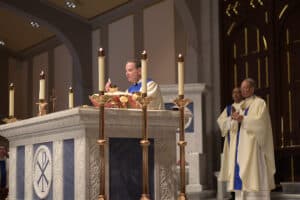 Each element of the Rite of Dedication of the new altar is significant, Bishop Burbidge said. Depositing saints’ relics into the altar is a reminder that, “We do not travel alone on our earthly journey to heaven. The saints are the ‘clouds of witnesses surrounding us.’ They accompany us. Their example inspires us. Their prayers support us,” he said.