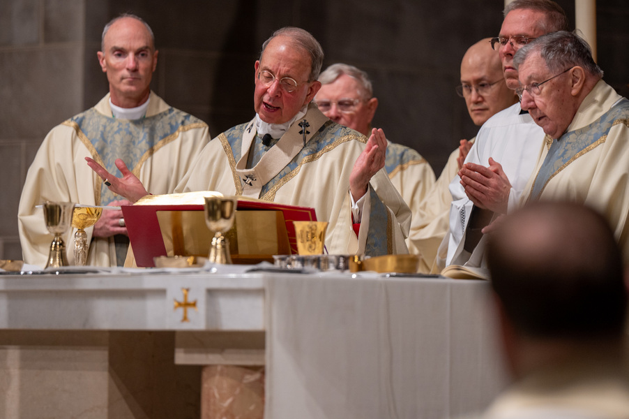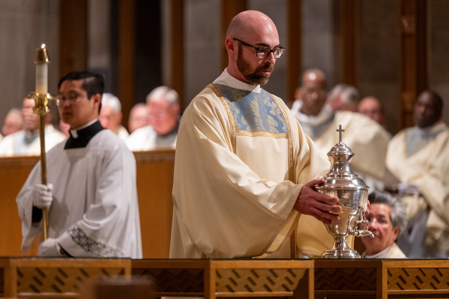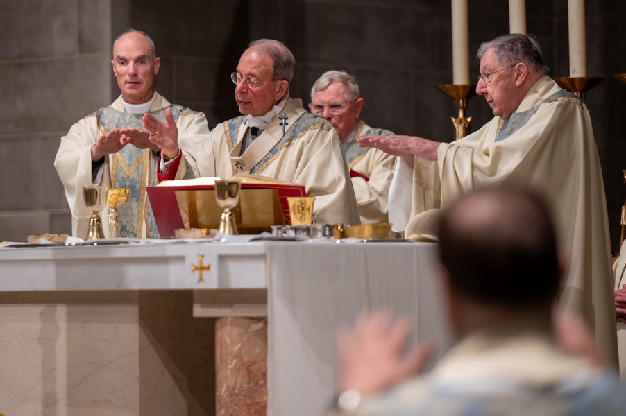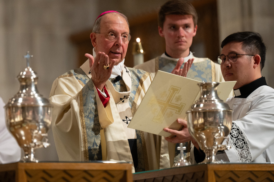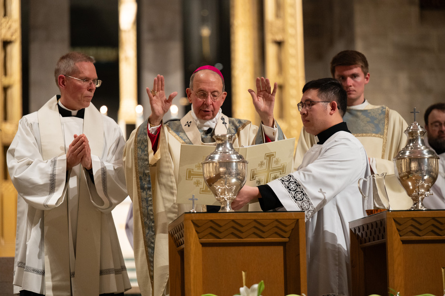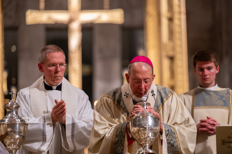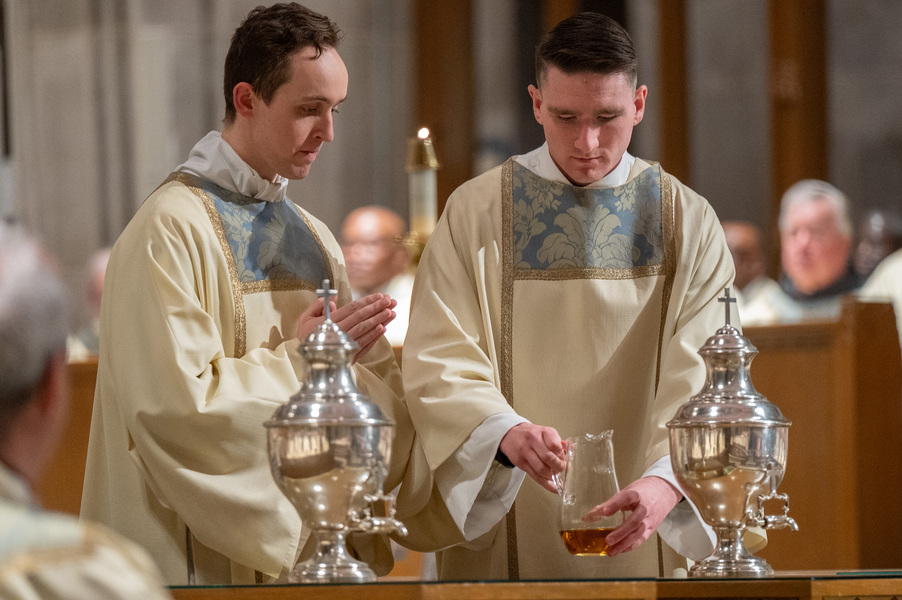 Baltimore Chrism Mass draws 1,400 to witness to ‘liberating power of God’ March 31, 2026By Christopher Gunty Catholic Review Filed Under: Archbishop's Ministry, Easter, Feature, Local News, News, Worship & Sacraments The five men who will be ordained to the priesthood in June each had a special role in the chrism Mass March 30 at the Cathedral of Mary Our Queen in Homeland. Three carried the oils that would be blessed in the Mass, one preached the Gospel and another assisted Archbishop William E. Lori at the altar. Before the Mass, Deacon Alexander Kulik said it is significant to be able to present the oil of the sick to the archbishop for blessing, since within a few months, he will use that same oil to anoint those who are ill. Archbishop William E. Lori breathes into the vessel of chrism as he calls down the Holy Spirit holy oils during the March 30 chrism Mass at the Cathedral of Mary Our Queen in Homeland. (Kevin J. Parks/CR Staff) Deacons Connor Schmidt and Stephen Kirby brought up the chrism and the balsam to be added to it, respectively. Deacon Schmidt said presenting the oil with which he and his fellow deacons would be ordained a priest “is an honor; it’s humbling. … it’s surreal.” Deacon Kirby said, “The sacraments are beautiful channels of grace and we use oil in a lot of them. To me, this is a day we’re going to reflect on how we constantly use these oils to bring grace into people’s lives, and that’s something that as priests we will get to witness a lot of.” Deacon Andrew Lacovara, a permanent deacon and the archbishop’s delegate for the Urban Vicariate, presented the oil of the catechumens at the Mass. Deacon Christopher Yeung, the delegate for the Western Vicariate and also a permanent deacon, and Deacon Russ Sullivan, who will be ordained in June, assisted the archbishop at the altar. Deacon Robert “Tre” Bart III proclaimed the Gospel. The incorporation of the deacons into the Mass, attended by about 1,400, emphasized the role of service closely connected to the archbishop as part of the solemn liturgy, which has three primary focuses: the renewal of priestly promises; the blessing of oils and the consecration of the chrism; and gathering the laity, especially those who will enter the Church at the Easter Vigil, to enter into Holy Week. Conventual Franciscan Brother Edward Handy, a Catonsville native living at St. Casimir in Canton who has been a religious friar for 64 years, attends the chrism Mass every year. “Well, it’s always good to go to Mass, but this is such a special one, you know?” he said. As he enters Holy Week, he is praying for peace in the world and for leaders of countries; for the needs of all people, especially the poor; and for priestly vocations. Augusto Frisancho and Maria Browne were saving places for eight of their fellow members of the Basilica of the National Shrine of the Assumption of the Blessed Virgin Mary before the Mass. Frisancho said the Mass is important because all the oils to be used throughout the year in parishes would be made sacred. “And so many priests attend, the blessings of so many priests” made the Mass a priority for members of the parish. Oil is prepared for blessing at chrism Mass, March 30, 2026, at the Cathedral of Mary Our Queen on Homeland. (Kevin J. Parks/CR Staff) Browne said this was the first chrism Mass for her. She has been learning about the oils and then plans to attend the Easter Vigil at the Baltimore Basilica to see them put to use. “I wanted to get the full experience,” she said. In his homily, Archbishop Lori especially addressed the priests as he acknowledged that ministry may sometimes feel like an ever-expanding universe, with no limit to the needs and expectations placed on them. “Our day is spoken for almost as soon as we get out of bed in the morning. The demands of ministry can absorb the time we try to set aside for prayer, reading and study, for exercise and for rest,” he said. “While the universe of ministry keeps on expanding, our private world sometimes seems to be shrinking. Unless we are vigilant, anger and frustration may overtake us, or we may even find ourselves simply going through the motions.” Being run ragged by the expanding demands for their ministry may cause someone to miss out on the liberating message from Jesus captured in the reading from Luke’s Gospel which is always the selection for the chrism Mass. In the passage, Jesus reads from the prophet Isaiah: “The Spirit of the Lord is upon me, because he has anointed me to bring glad tidings to the poor. He has sent me to proclaim liberty to captives and recovery of sight to the blind, to let the oppressed go free, and to proclaim a year acceptable to the Lord” (Lk 4:18-19). Jesus then tells the congregation in Nazareth that the Scripture “is fulfilled by your hearing.” The archbishop noted that he has preached on the same Gospel passage at chrism Masses for 25 years. “After all these years, I still say to myself, ‘What a message!’ It’s brimming with the liberating power of God over human infirmity, sinfulness and self-imposed captivity,” Archbishop Lori said. “It’s brimming with hope and joy and the promise of true freedom.” Seminarians are recognized with applause by parishioners as Archbishop William E. Lori thanks them for their commitment to the church at the conclusion of chrism Mass March 30 at the Cathedral of Mary Our Queen in Homeland. (Kevin J. Parks/CR Staff) He told the priests that he and they have been anointed by the Spirit and sent to continue the healing and liberating mission of Jesus. “The headwinds can be strong and the obstacles many, but when we allow the Lord to liberate us from sin, from fear, from egotism, from attachments – then we are credible witnesses, for we have internalized the Gospel of freedom we preach. “Then do we radiate to our good co-workers in ministry and to all we serve a joy, a peace, a loving presence unc