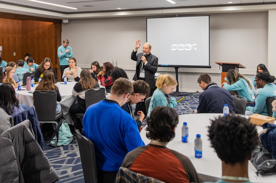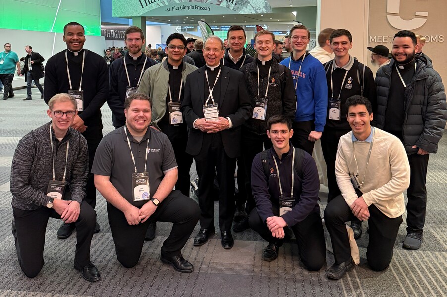 Baltimore students inspired by trip to SEEK conference in Ohio January 8, 2026By Gerry Jackson Catholic Review Filed Under: Colleges, Feature, Local News, News, Young Adult Ministry For Brandon Jacobs, a 20-year-old college student, practicing his faith at his home parish can sometimes feel like a solitary experience. He certainly didn’t get that feeling when he was part of a group of about 120 from the Archdiocese of Baltimore attending the annual SEEK conference in Columbus, Ohio, Jan. 1-5. Members of the contingent of 120 students, college chaplains, campus ministers and FOCUS missionaries from Baltimore that traveled to the SEEK 2026 conference pose in Columbus, Ohio. UMBC student Brandon Jacobs, second from right, was among the group. (Courtesy Father Matthew Himes) “I try to attend Mass as often as possible, but I often feel old and alone,” said the UMBC student and parishioner of Church of the Resurrection in Burtonsville. “There usually aren’t very many people my age attending church at my home parish regularly.” The recent Catholic convert had no such worries at the SEEK 2026 gathering in Columbus. He was one of more than 16,000 mostly college students in attendance in Ohio with another 10,000 gathering at similar events in Denver and Fort Worth, Texas. The conferences featured worship, talks and workshops on encountering Christ. “It was so inspiring to see people my own age, both cradle Catholics and recent converts like me practicing their faith,” said Jacobs, his voice hoarse and barely above a whisper from singing and praying so loudly at the conference. “The other students inspire me. It is a blessing to know that I am not alone in my faith. This is why I became Catholic, knowing people practice their faith with such passion.” SEEK (Search for Education, Elevation and Knowledge) is a collaboration led by Fellowship of Catholic University Students (FOCUS), a Catholic outreach organization that “shares the hope and joy of the Gospel with the world.” The conference schedule included daily Mass, eucharistic adoration and confession. Archbishop William E. Lori blesses a group of 120 students, college chaplains, campus ministers and FOCUS missionaries from Baltimore who traveled to the SEEK 2026 conference in Columbus, Ohio. (Courtesy Aaron Sebastian) Campus chaplains, campus ministers and other FOCUS missionaries from UMBC in Catonsville, Towson University and The Johns Hopkins University in Baltimore accompanied the students on the more than eight-hour bus ride to the Greater Columbus Convention Center. Father Matthew Himes, UMBC’s campus chaplain, was leading his fourth trip to the event after also attending several as a student. “It’s inspiring and powerful to see young people want to encounter God in their lives,” Father Himes said. “To see it at such a big venue shows that we’re not alone. It’s the opposite of what our culture is telling us about the Church.” Father Himes said evening adoration was the highlight for him each day. “It’s evidence of a deep faith, and inspires me in my own life,” he said. “It gives me great hope for the future of our Church, and it’s a great witness to see young people filled with that kind of joy and hope.” Brian Rhude, campus minister at Towson University for the past three years, led a group of 35 to Columbus that included school chaplain Father Michael Misulia. Seminarians from the Archdiocese of Baltimore, posing with Archbishop William E. Lori, were among a group of 120 students, college chaplains, campus ministers and FOCUS missionaries from Baltimore who traveled to the SEEK 2026 conference in Columbus, Ohio. (Courtesy Father Matthew Himes) He said the moments of shared worship and adoration were what struck him about the conference. “I know the students were moved by the speakers,” Rhude said. “But more than anything, it was the moments of shared worship and adoration with more than 16,000 people that really moved us. I felt like we really built a camaraderie, sharing those moments and deepening our faith and friendship.” Jimmy Thomas, a junior at Towson and parishioner of St. Paul in Ellicott City, echoed Rhude’s thoughts. “SEEK 26 was probably the greatest and most influential weekend of my life,” Thomas said. “Giving glory to God with (16,000) other young Catholics was so incredibly powerful. The conference renewed my love of God, others and self. I have believed that the Eucharist is Jesus for a while, but that adoration sparked something in my heart that I haven’t felt in a long time. Thomas said he was particularly moved by a talk about heaven by Father Mike Schmitz, one of the keynote speakers. “I feel as though a fire was lit, and I want to live my life to the fullest, not for my own sake but to give glory to God. I want to live like heaven starts today, and I want to give God control so that he can change the world through me. I have so much stirring in my heart.” A procession is seen during Eucharistic adoration with 16,000 youth Jan. 3 at the SEEK26 conference in Columbus, Ohio. Young Catholics and attendees of all ages were invited to embrace the conference’s theme inspired by St. Pier Giorgio Frassati: “To the Heights,” This year SEEK the Jan. 1-5 conference was being held in Denver and Fort Worth, Texas, in addition to Columbus. (OSV News photo/Margaret Murray) Baltimore Archbishop William E. Lori also attended the conference in Columbus, spending time with the Baltimore delegation. In a Jan. 5 homily at the Cathedral of Mary Our Queen in Homeland, he said the conference attendees sought the face of Christ, the fullness of the faith and “how to give their lives in love to the Lord and to others.” “At 8:30 in the morning, a vast auditorium was filled with young people,” he said. “They were avidly participating in holy Mass, listening attentively to the Word of God, soaking up the Divine Word as dry ground absorbs water.” The archbi