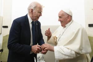 Biden last met with Pope Francis at the Group of Seven summit in Puglia, Italy, June 14, where they had a brief private bilateral meeting, according to Catholic News Service. Prior to that meeting, the two met at the Vatican Oct. 29, 2021, when Biden “thanked His Holiness for his advocacy for the world’s poor and those suffering from hunger, conflict, and persecution,” according to the U.S. Embassy to the Holy See. He also “lauded Pope Francis’ leadership in fighting the climate crisis, as well as his advocacy to ensure the pandemic ends for everyone through vaccine sharing and an equitable global economic recovery,” the embassy said.