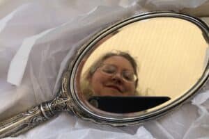 My parents delivered a cake and some wonderful gifts, including a mirror that belonged to my grandmother, engraved with an F for her maiden—and my middle—name, Fay. My mother has had it on her dresser for years, and I can’t believe it’s mine now.