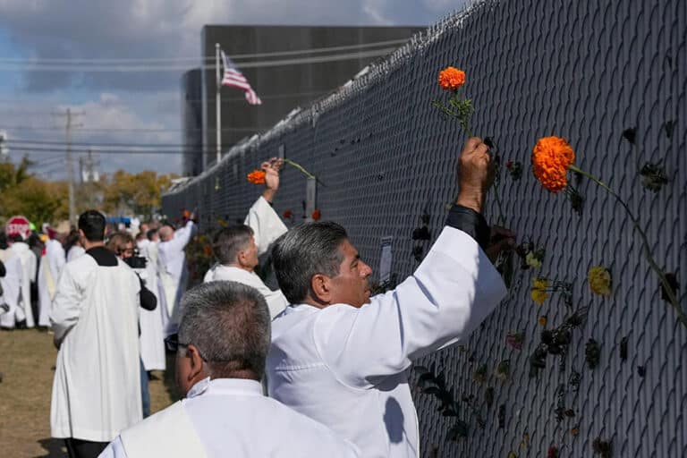 Bishop says Trump administration ‘assured’ him detainees’ access to sacraments ‘under careful review’ November 4, 2025By Kate Scanlon OSV News Filed Under: Immigration and Migration, News, Religious Freedom, World News WASHINGTON (OSV News) — Amid concern about the ability of those detained by immigration enforcement authorities to receive Catholic sacraments, a key U.S. bishop said Trump administration officials have “assured” him the matter is “under careful review.” His comments came shortly before Pope Leo XIV urged respect for “the spiritual rights” of migrants detained in the U.S. in comments to journalists Nov. 4 at Castel Gandolfo. A man receives a blessing during an outdoor Mass in the Broadview section of Chicago Nov. 1, 2025, observed by interfaith leaders, community members, and volunteers, outside the Broadview ICE facility, after U.S. President Donald Trump ordered an increased federal law enforcement presence to assist in crime prevention. The Mass was led by Chicago Auxiliary Bishop José María Garcia-Maldonado. (OSV News photo/Leah Millis, Reuters) Bishop Robert E. Barron of Winona-Rochester, Minn., who was appointed by President Donald Trump to the Department of Justice’s Religious Liberty Commission, said in a Nov. 3 social media post that he and Father Alexei Woltornist, a Melkite Catholic priest and a member of the Department of Homeland Security’s Homeland Security Advisory Council, “have been in touch with senior officials in both the State Department and the Department of Homeland Security and have brought forward the concerns of the Church regarding detainees’ access to Sacraments.” Bishop Barron’s post included an OSV News article about a delegation of clergy, religious sisters and laity, and a Chicago auxiliary bishop who were barred for the second time in three weeks from bringing the Eucharist to those being held at an immigration detention center just west of Chicago on the feast of All Saints Nov. 1. The facility in the suburb of Broadview, Illinois, has seen tense confrontations between protesters and federal law enforcement in the last several weeks as the Trump administration ramped up enforcement efforts in and around the Windy City. In a separate incident, reports of immigration authorities near St. Jerome Catholic Church in Chicago’s Rogers Park neighborhood on Oct. 12 prompted warnings of caution from its pastor, although a spokesperson for ICE denied the church was targeted, local media reported. Catholic bishops are among those who have acknowledged points of tension between the Trump administration’s immigration policy and religious liberty. In a statement provided to OSV News in response to an inquiry about Bishop Barron’s post, Tricia McLaughlin, assistant secretary for public affairs for the Department of Homeland Security, said the Broadview facility is “a field office, it is not a detention facility.” “Illegal aliens are only briefly held there for processing before being transferred to a detention facility. Religious organizations are more than welcome to provide services to detainees in ICE detention facilities,” McLaughlin said. “Even before the attacks on the Broadview facility, it was not within standard operating procedure for religious services to be provided in a field office, as detainees are continuously brought in, processed, and transferred out.” McLaughlin argued the facility faces “serious public safety and officer safety threats,” and that “ICE staff has repeatedly informed religious organizations that due to Broadview’s status as a field office and the ongoing threat to civilians, detainees, and officers” they are “not able to accommodate these requests at this time.” In his post, Bishop Barron added, “I feel that maintaining open lines of communication and engaging in dialogue with the Administration constitute the most constructive way forward.” Catholic social teaching on immigration balances three interrelated principles — the right of persons to migrate in order to sustain their lives and those of their families, the right of a country to regulate its borders and control immigration, and a nation’s duty to regulate its borders with justice and mercy. In his Nov. 4 comments, Pope Leo added, “The authorities allow pastoral workers to assist with the needs of these people. Many times they have been separated from their families and no one knows what happens” This story was updated Nov. 5 at 9 a.m. Read More Immigration & Migration Catholic advocates raise alarm at Trump’s call to ‘pause’ migration from ‘Third World Countries’ Children, refugees victimized by AI-fueled human trafficking, says Vatican diplomat Pew: U.S. Latinos disapprove of Trump’s immigration, economic policies Celebrity chef ‘Lidia’ hasn’t forgotten what it’s like to be a refugee. Here’s how she’s giving back The Cabrini Pledge: An invitation to be keepers of hope Chicago Catholic coalition sues ICE over denial of holy Communion, pastoral care Copyright © 2025 OSV News Print