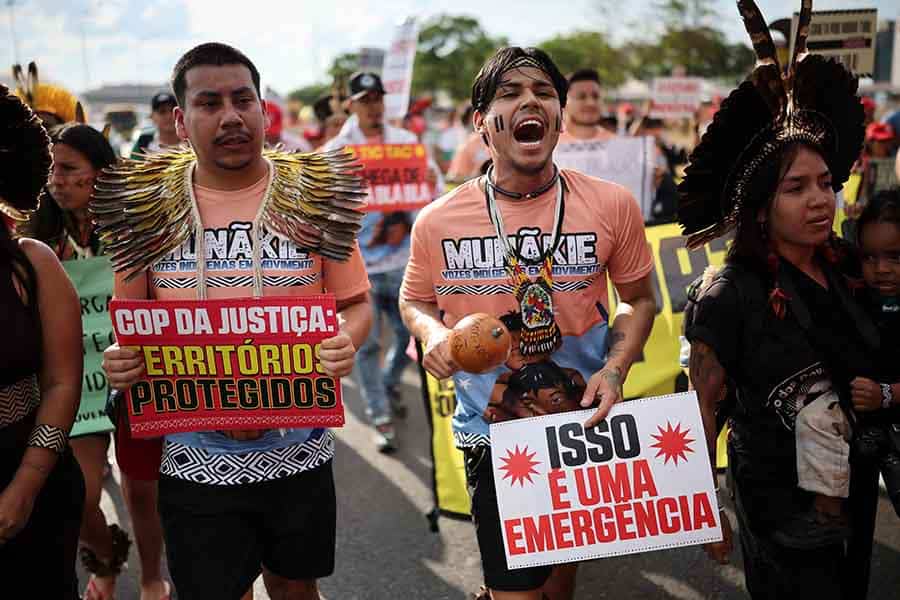 Bishops, humanitarian leader urge bold, courageous action at UN climate conference November 8, 2025By Gina Christian OSV News Filed Under: Environment, News, World News Ahead of the United Nations’ annual climate conference, two U.S. Catholic bishops and the leader of a top Catholic aid agency are calling for urgent, long-term action to safeguard both creation and humanity. Government officials, scientists, business leaders, activists and others from more than 190 nations will gather for the U.N.’s COP30, which will take place Nov. 10-21 in Belém, Brazil. Named for the “Conference of the Parties” that signed the original 1992 U.N. climate agreement, the COP gatherings are held under the U.N. Framework Convention on Climate Change, which entered into force in 1994 and now counts 198 parties (representing 197 countries plus the European Union). Indigenous people in Brazil attend a protest Oct. 13, 2025, calling for the recognition of 104 territories and urging Brazil’s President Luiz Inacio Lula da Silva to complete land demarcations. The protest was held ahead of the COP30 Climate Summit, which is taking place Nov. 10-21 in Belém, Brazil. (OSV News photo//Mateus Bonomi, Reuters) According to the official COP30 website, the talks will focus in particular on “aligning the commitments of developed and developing countries in relation to climate finance, ensuring that emission reduction targets are compatible with climate science, and dealing with the socio-economic impacts of climate change on vulnerable populations.” The gathering “convenes while the Catholic Church celebrates the Jubilee Year of Hope,” which marks “a sacred opportunity to restore relationships and renew creation at a time when the gift of life is under grave threat,” said Metropolitan Archbishop Borys A. Gudziak of the Archeparchy of Philadelphia, Bishop A. Elias Zaidan of the St. Louis-based Maronite Eparchy of Our Lady of Lebanon of Los Angeles, and Sean Callahan, president and CEO of Catholic Relief Services, in a joint statement issued Nov. 4. All three work directly on addressing climate policy: Archbishop Gudziak as chair of the U.S. Conference of Catholic Bishops’ Committee on Domestic Justice and Human Development; Bishop Zaidan as chair of the USCCB’s Committee on International Justice and Peace; and Callahan as head of CRS, the USCCB’s international humanitarian and development agency, which in turn is part of Caritas Internationalis, the Catholic Church’s global humanitarian network. The bishops and Callahan quoted an Oct. 1 address by Pope Leo XIV on the 10th anniversary of Pope Francis’ environmental encyclical “Laudato Si’.” In that address, Pope Leo exhorted participants in three upcoming U.N. summits — COP30, the 53rd Plenary Session of the Committee on World Food Security and the 2026 Water Conference — to “listen to the cry of the Earth and the cry of the poor, families, indigenous peoples, involuntary migrants and believers throughout the world.” “Climate change, biodiversity loss, and environmental degradation are devastating communities already burdened by poverty and exclusion,” said Archbishop Gudziak, Bishop Zaidan and Callahan. “Farming and fishing families confront threats to their livelihoods; Indigenous Peoples face destruction of their ancestral lands; children’s health, safety, and futures are at risk. Failing to steward God’s creation ignores our responsibility as one human family.” They observed that in “Laudato Si’,” Pope Francis “reminded us that the climate is a common good, belonging to all and meant for all, and that intergenerational solidarity is not optional.” In addition, they implored “world leaders to act urgently and courageously for an ambitious Paris Agreement implementation that protects God’s creation and people.” Adopted at COP21 by 195 parties in 2015, and taking effect in 2016, the Paris Agreement is a legally binding international treaty to limit global warming — the long-term heating of Earth’s surface due to human activities — to 1.5 degrees Celsius, well below pre-industrial levels of 2 degrees Celsius. “As all of us are impacted, so must we all be responsible for addressing this global challenge,” said Archbishop Gudziak, Bishop Zaidan and Callahan. They also stressed that countries, organizations and businesses should recommit to implementations that remain centered on human dignity, while balancing both economic opportunity and climate care. Among the aims they pointed to were investment in adaptations that also foster economic opportunities, along with “bold mitigation efforts” to reduce emissions contributing to global warming. Other priorities they highlighted included “loss and damage financing that guarantees priority and direct access to vulnerable affected communities”; the development of “a just transition to a sustainable economy centered on workers, communities and creation”; and efforts to make “financing for climate solutions, including debt relief, timely and transparent while at the same time upholding human dignity.” “Together, these actions can work towards integral ecology” and — as Pope Leo said in his Oct. 1 “Laudato Si'” anniversary address — “‘give priority to the poor and marginalized in the process,'” said Archbishop Gudziak, Bishop Zaidan and Callahan, adding they offered their prayers and solidarity and pledged “to work collaboratively to safeguard the future of our common home.” Read More Environment Believers must care for the poor and creation, pope says ‘Creation is crying out,’ pope says in new message to COP30 Delegation of top prelates, lay activists gives Brazil church strong presence at COP30 Caring for creation is part of peacemaking, pope tells COP30 Maryland Catholics renew Appalachian mission Tackle ecological debt, protect biodiversity and change hearts, says Vatican diplomat Copyright © 2025 OSV News