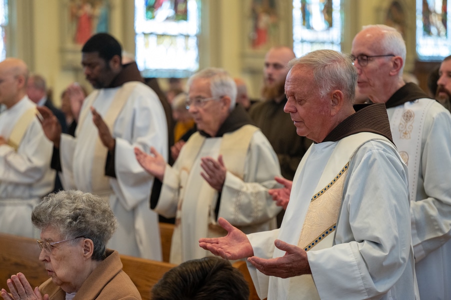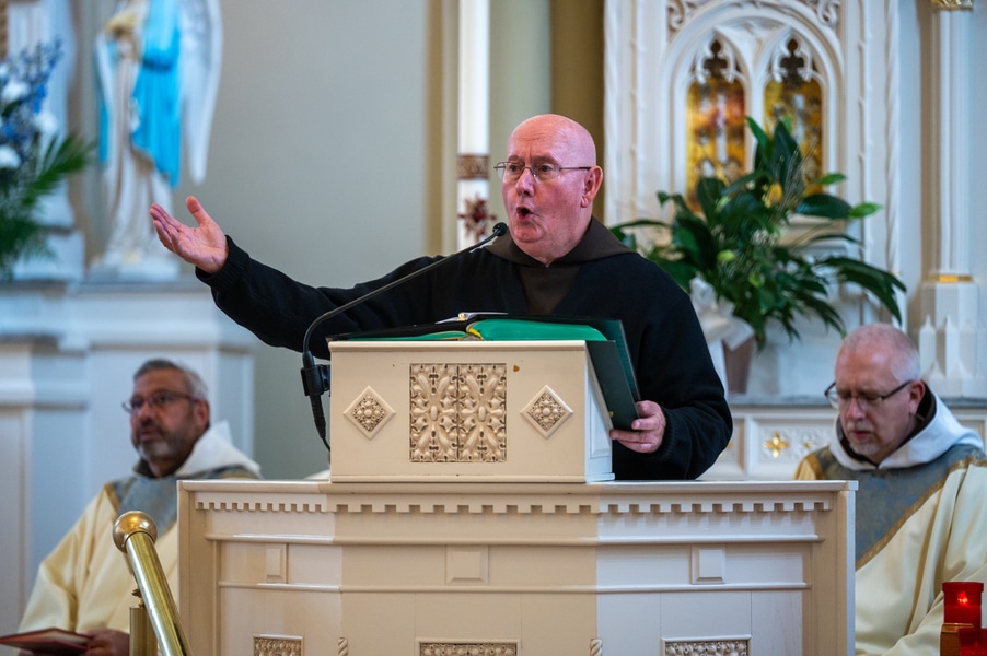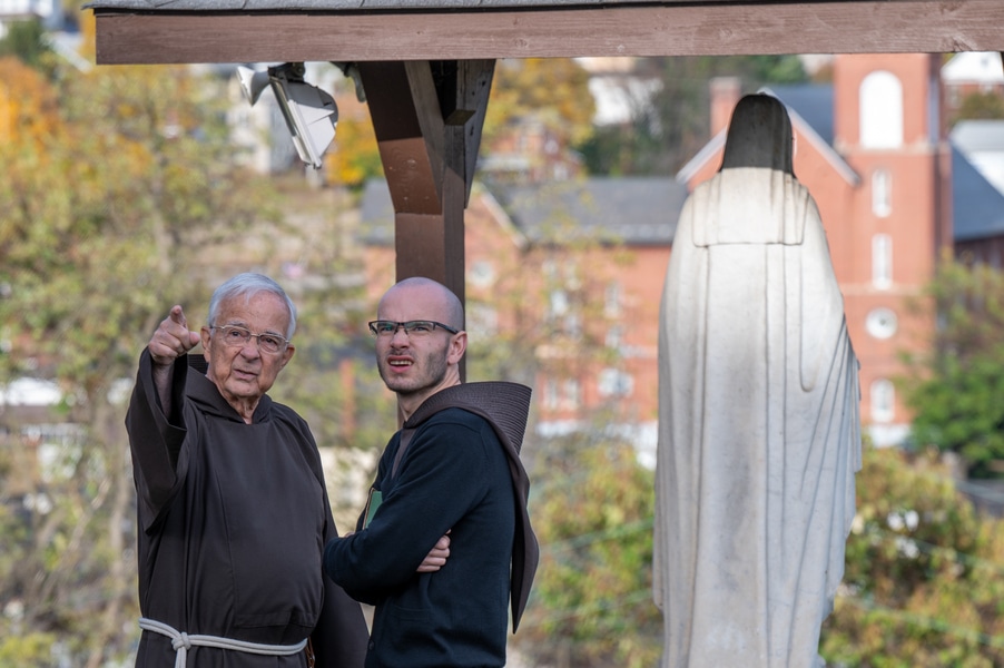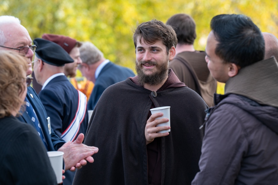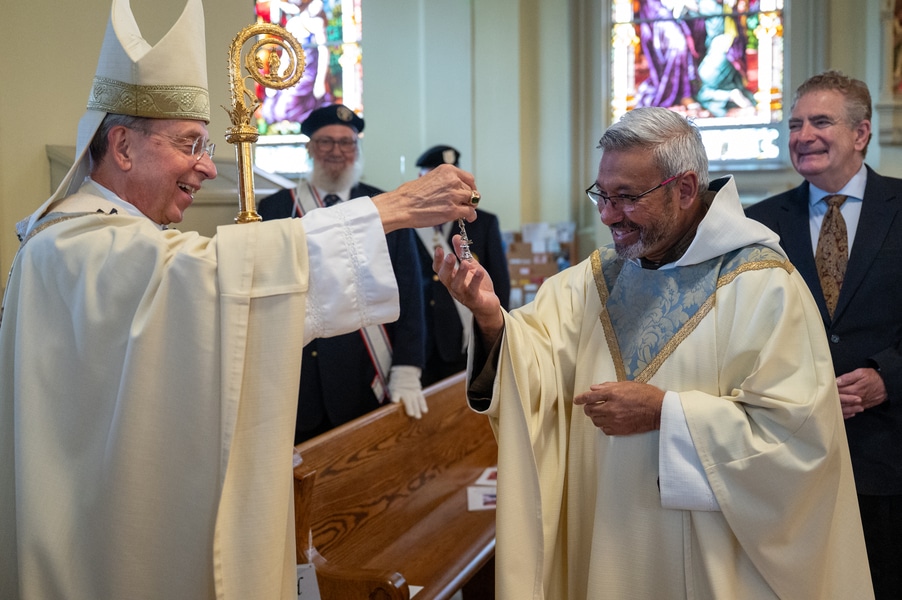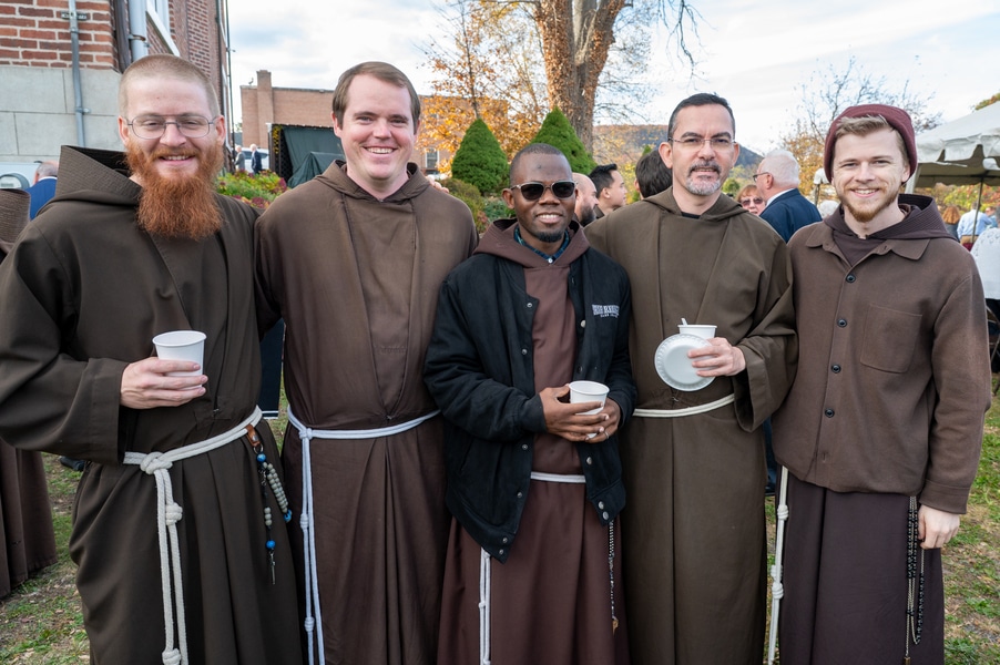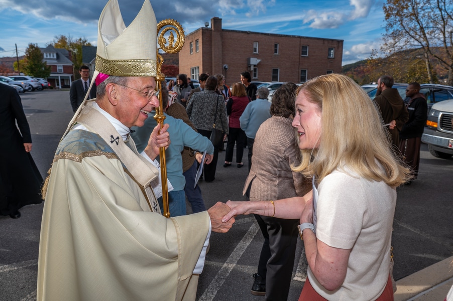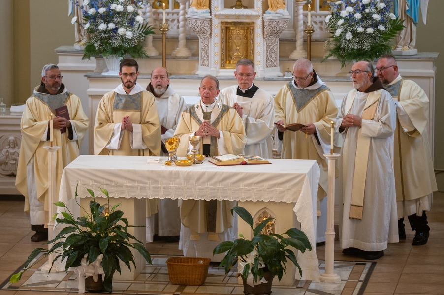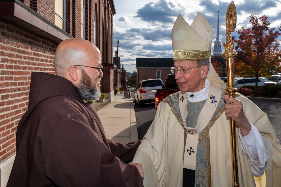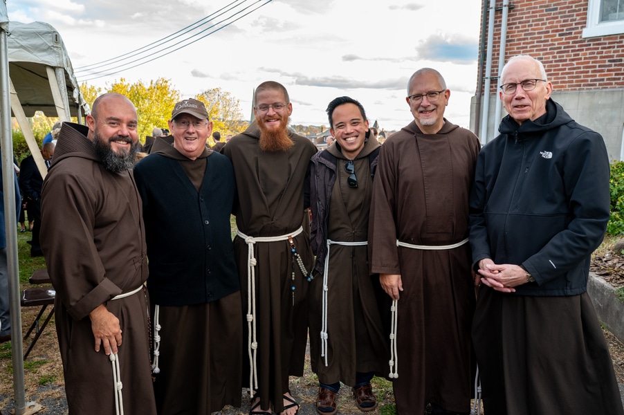 Capuchins celebrate 150 years of ministry in Cumberland November 3, 2025By Katie V. Jones Catholic Review Filed Under: Feature, Local News, News, Western Vicariate CUMBERLAND – At Our Lady of the Mountains Parish, families proudly trace their membership in the Shrine of Ss. Peter and Paul through the generations and share stories about their great-great-great grandparents. Those families are just as quick to include the Capuchin Franciscans in their stories. Members of the Capuchin Franciscan Order concelebrated Mass Nov. 1 with Archbishop William E. Lori to mark the 150th anniversary of the arrival of the Friars to Cumberland. The Mass was held at the Shrine of Ss. Peter and Paul. (Kevin J. Parks/CR Staff) While the church was built by the Redemptorists in 1848 and then purchased by the Carmelite Friars in 1866, it was the Capuchins in 1875 who settled in to stay. Archbishop William E. Lori celebrated the 150th anniversary of the Capuchins’ arrival with a special Nov. 1 Mass at Ss. Peter and Paul on the Feast of All Saints. At the same time, he officially installed Capuchin Franciscan Father Stephen Fernandes as pastor of Our Lady of the Mountains, which includes Ss. Peter and Paul, St. Patrick and St. Mary in Cumberland. “It is a lot to celebrate, and I am so happy to do it with all of you,” Archbishop Lori told a full crowd at the shrine, many of them friars, recognizable by their long-hooded brown robes. A branch of the Franciscan order, the Capuchins are devoted to prayer and service to the poor. The liturgy was followed by an outdoor reception and a formal dinner reception. “The rich history that is St. Francis is alive here just as much as it was 150 years ago, and that life continues to breathe life into our congregation, our community,” said Larry Smith, whose daughter is a sixth-generation member. “We’re coming up on 250 years of the anniversary of the celebration of the republic of the United States and just 100 years into that, that is when this community started. That vibrant community continues to be alive today because of the devoted dedication of those wonderful men in brown who lead us, who love us, who teach us, who inspire us and who lift us up in every way.” Archbishop William E. Lori presents the key to the Shrine of Ss. Peter and Paul in Cumberland to Capuchin Franciscan Father Stephen Fernandes during his installation as pastor of the Cumberland parish Nov. 1. (Kevin J. Parks/CR Staff) Archbishop Lori said the Capuchin friars arrived in Cumberland with few possessions but with a “rich legacy of holiness” and, in the words of Pope John Paul II, they were “rich in love.” “What did the Capuchins do with this love? They invested their love in you, the people of God, as they served in parishes, classrooms, prisons, soup kitchens, hospitals,” Archbishop Lori said. “The Capuchin men, including here in Mountain Maryland, reached out to God’s people in every walk of life, mostly hard-working families, many of them immigrants. … Out of their poverty, the Capuchins served the world generously.” German Capuchins, Fathers Anton Schuermann and Franz Wolff, purchased the property on Holy Hill, and installed the church’s altars, all hand-carved by friars. They welcomed the mostly German Catholic community and other Capuchins exiled from Europe. Over the years, a minor seminary was built and a school. The community was self-sufficient, growing its own fruits and vegetables, and raising cows and chickens. Capuchin Franciscan Father Blaine Burley shares a portion of the 150-year history of the Friars at the Shrine of Ss. Peter and Paul in Cumberland during a dinner celebration at the Allegany Museum Nov 1. (Kevin J. Parks/CR Staff) “We are happy to have the opportunity to honor the Capuchins for their service to the community,” Joe George, president of the Friends of the Shrine of Ss. Peter and Paul, said in an interview. “They have been spiritual leaders for so long. They are involved with the poor, the food pantry.” The friars helped support the creation of St. John Neumann School, which merged with Bishop Walsh High School in 2002. The monastery was razed in 1995. Today, only the shrine remains of the original Ss. Peter and Paul’s Parish the Capuchins purchased in 1875. The friars reside at St. Mary. “The friars have been wonderful through the years. It is so nice they came back. This place left a mark on them,” Julia Kidwell, a fifth-generation parishioner said at the outdoor reception following Mass. “They are such a wonderful blessing for all of us.” Hilda Miltenberger, 84, used to cook evening meals for the friars as well as extra meals to hold them over on weekends. “They loved my home cooking,” Miltenberger said, proudly. “They had special guests in one night and each wanted their steaks different. I had to get a cookbook out for rare steak to see how much to cook them. I was very pleased I did that for them.” Joe George, president of the Friends of the Shrine of Ss. Peter and Paul, left, Capuchin Franciscan Father Stephen Fernandes, pastor, and Mayor Raymond M. Morriss enjoy conversation during a dinner celebrating the 150th anniversary of the Capuchin Franciscan community in Cumberland Nov. 1. (Kevin J. Parks/CR Staff) At the beginning of the anniversary Mass, Archbishop Lori gave the keys to the shrine to Father Fernandes. He then renewed his vows to the applause of all present. “I don’t have any words,” Father Fernandes said, afterward. “I’m following the footsteps of men who have gone before me 150 years ago.” Since his appointment to Cumberland in July, Father Fernandes has started celebrating a Spanish Mass on the second and fourth Sunday of the month. While he has only held three as of Nov. 1, the Mass attracts roughly 30 people, including families who have enrolled their children into programs, he said. “I hope to continue to build and serve them,” Father Fernandes said. A formal dinne