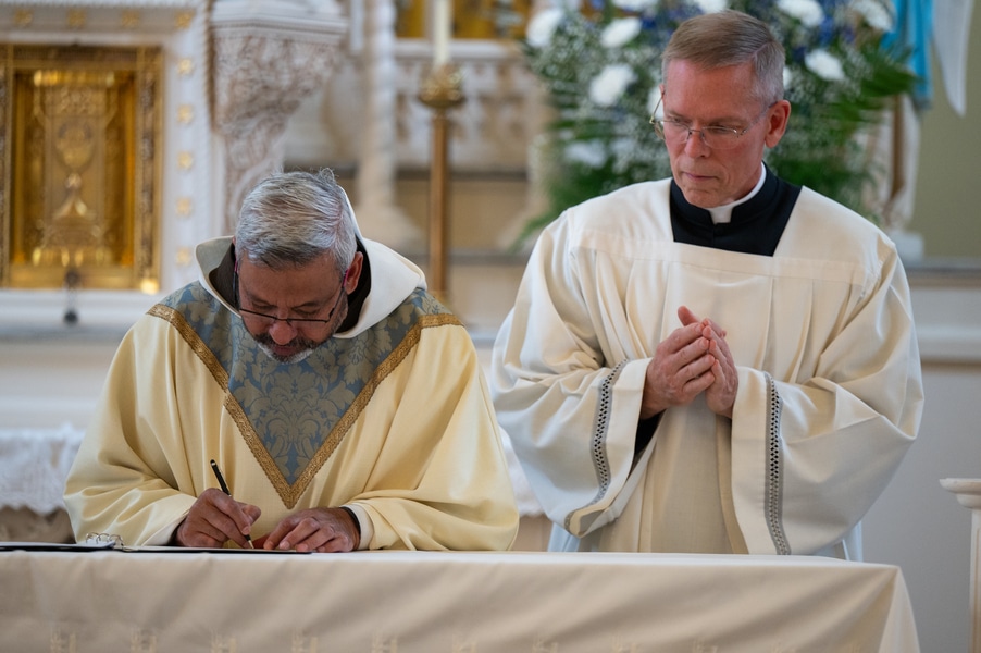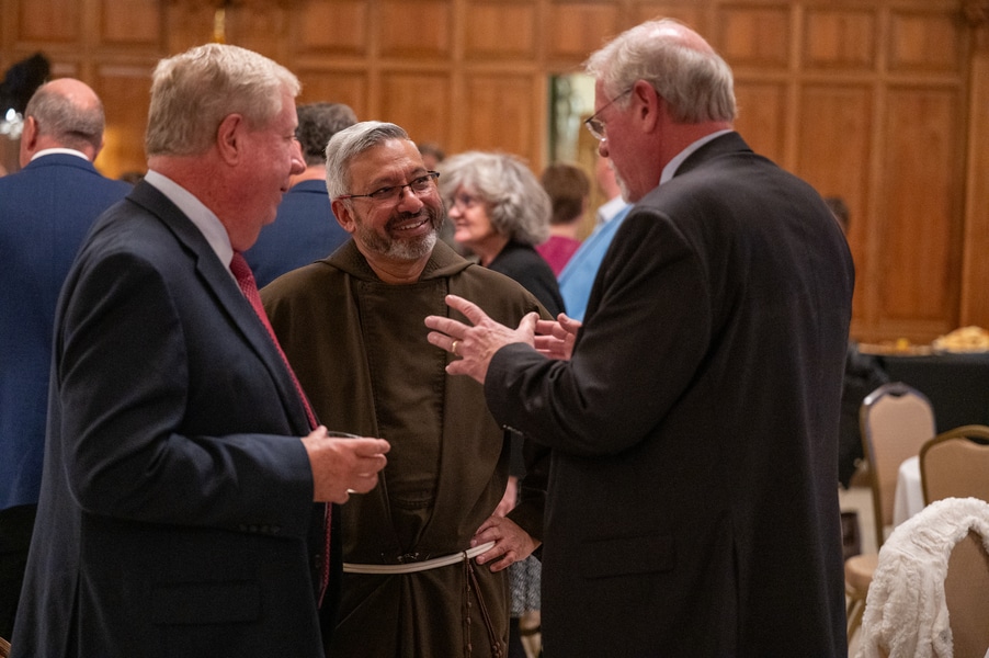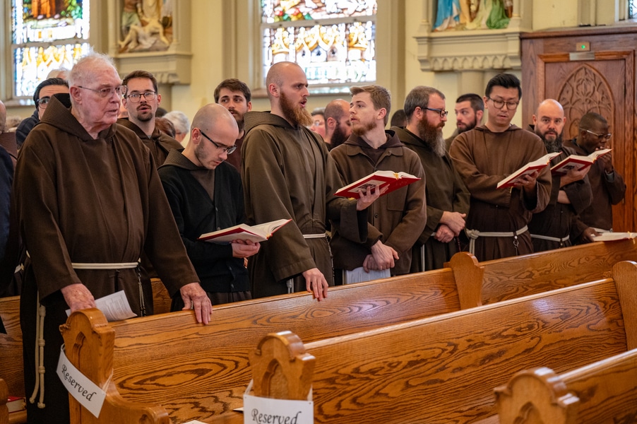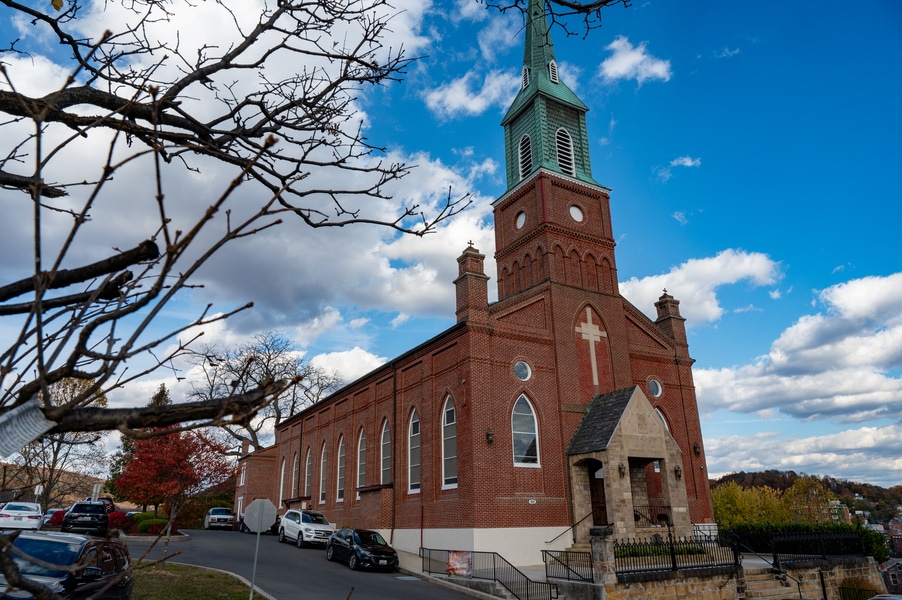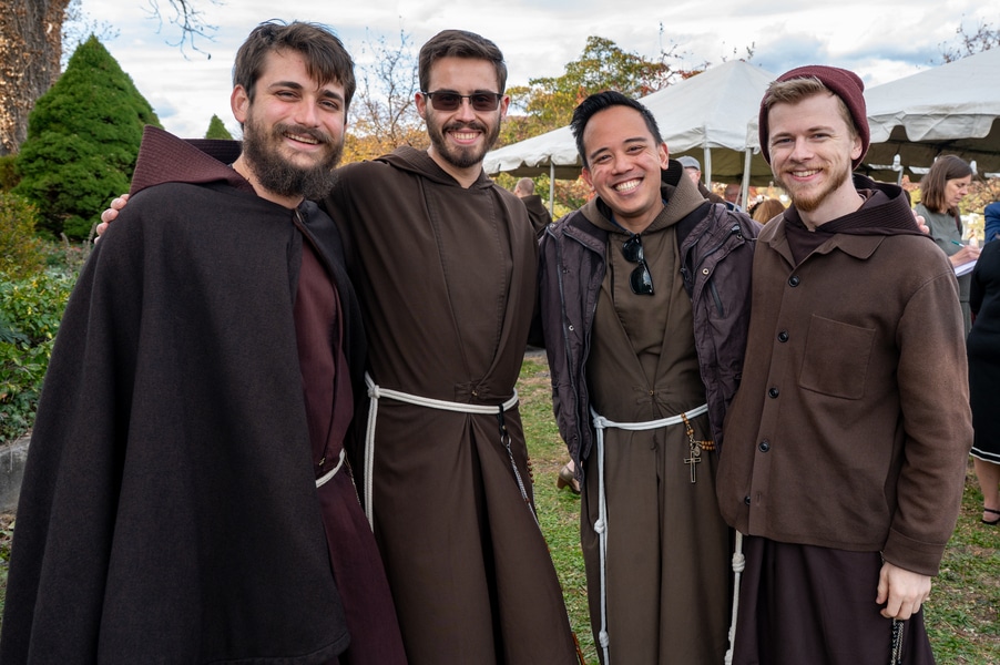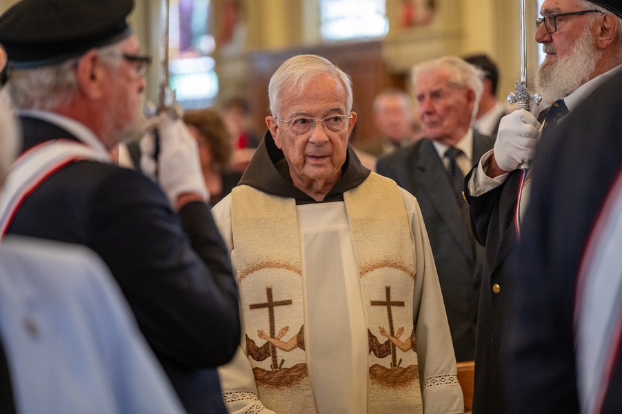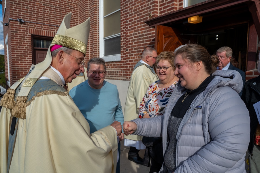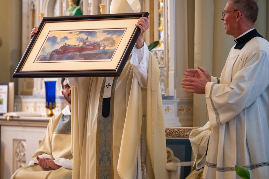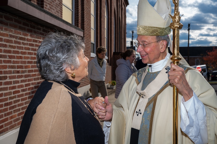 Capuchins celebrate 150 years of ministry in Cumberland November 3, 2025By Katie V. Jones Catholic Review Filed Under: Feature, Local News, News, Western Vicariate CUMBERLAND – At Our Lady of the Mountains Parish, families proudly trace their membership in the Shrine of Ss. Peter and Paul through the generations and share stories about their great-great-great grandparents. Those families are just as quick to include the Capuchin Franciscans in their stories. Members of the Capuchin Franciscan Order concelebrated Mass Nov. 1 with Archbishop William E. Lori to mark the 150th anniversary of the arrival of the Friars to Cumberland. The Mass was held at the Shrine of Ss. Peter and Paul. (Kevin J. Parks/CR Staff) While the church was built by the Redemptorists in 1848 and then purchased by the Carmelite Friars in 1866, it was the Capuchins in 1875 who settled in to stay. Archbishop William E. Lori celebrated the 150th anniversary of the Capuchins’ arrival with a special Nov. 1 Mass at Ss. Peter and Paul on the Feast of All Saints. At the same time, he officially installed Capuchin Franciscan Father Stephen Fernandes as pastor of Our Lady of the Mountains, which includes Ss. Peter and Paul, St. Patrick and St. Mary in Cumberland. “It is a lot to celebrate, and I am so happy to do it with all of you,” Archbishop Lori told a full crowd at the shrine, many of them friars, recognizable by their long-hooded brown robes. A branch of the Franciscan order, the Capuchins are devoted to prayer and service to the poor. The liturgy was followed by an outdoor reception and a formal dinner reception. “The rich history that is St. Francis is alive here just as much as it was 150 years ago, and that life continues to breathe life into our congregation, our community,” said Larry Smith, whose daughter is a sixth-generation member. “We’re coming up on 250 years of the anniversary of the celebration of the republic of the United States and just 100 years into that, that is when this community started. That vibrant community continues to be alive today because of the devoted dedication of those wonderful men in brown who lead us, who love us, who teach us, who inspire us and who lift us up in every way.” Archbishop William E. Lori presents the key to the Shrine of Ss. Peter and Paul in Cumberland to Capuchin Franciscan Father Stephen Fernandes during his installation as pastor of the Cumberland parish Nov. 1. (Kevin J. Parks/CR Staff) Archbishop Lori said the Capuchin friars arrived in Cumberland with few possessions but with a “rich legacy of holiness” and, in the words of Pope John Paul II, they were “rich in love.” “What did the Capuchins do with this love? They invested their love in you, the people of God, as they served in parishes, classrooms, prisons, soup kitchens, hospitals,” Archbishop Lori said. “The Capuchin men, including here in Mountain Maryland, reached out to God’s people in every walk of life, mostly hard-working families, many of them immigrants. … Out of their poverty, the Capuchins served the world generously.” German Capuchins, Fathers Anton Schuermann and Franz Wolff, purchased the property on Holy Hill, and installed the church’s altars, all hand-carved by friars. They welcomed the mostly German Catholic community and other Capuchins exiled from Europe. Over the years, a minor seminary was built and a school. The community was self-sufficient, growing its own fruits and vegetables, and raising cows and chickens. Capuchin Franciscan Father Blaine Burley shares a portion of the 150-year history of the Friars at the Shrine of Ss. Peter and Paul in Cumberland during a dinner celebration at the Allegany Museum Nov 1. (Kevin J. Parks/CR Staff) “We are happy to have the opportunity to honor the Capuchins for their service to the community,” Joe George, president of the Friends of the Shrine of Ss. Peter and Paul, said in an interview. “They have been spiritual leaders for so long. They are involved with the poor, the food pantry.” The friars helped support the creation of St. John Neumann School, which merged with Bishop Walsh High School in 2002. The monastery was razed in 1995. Today, only the shrine remains of the original Ss. Peter and Paul’s Parish the Capuchins purchased in 1875. The friars reside at St. Mary. “The friars have been wonderful through the years. It is so nice they came back. This place left a mark on them,” Julia Kidwell, a fifth-generation parishioner said at the outdoor reception following Mass. “They are such a wonderful blessing for all of us.” Hilda Miltenberger, 84, used to cook evening meals for the friars as well as extra meals to hold them over on weekends. “They loved my home cooking,” Miltenberger said, proudly. “They had special guests in one night and each wanted their steaks different. I had to get a cookbook out for rare steak to see how much to cook them. I was very pleased I did that for them.” Joe George, president of the Friends of the Shrine of Ss. Peter and Paul, left, Capuchin Franciscan Father Stephen Fernandes, pastor, and Mayor Raymond M. Morriss enjoy conversation during a dinner celebrating the 150th anniversary of the Capuchin Franciscan community in Cumberland Nov. 1. (Kevin J. Parks/CR Staff) At the beginning of the anniversary Mass, Archbishop Lori gave the keys to the shrine to Father Fernandes. He then renewed his vows to the applause of all present. “I don’t have any words,” Father Fernandes said, afterward. “I’m following the footsteps of men who have gone before me 150 years ago.” Since his appointment to Cumberland in July, Father Fernandes has started celebrating a Spanish Mass on the second and fourth Sunday of the month. While he has only held three as of Nov. 1, the Mass attracts roughly 30 people, including families who have enrolled their children into programs, he said. “I hope to continue to build and serve them,” Father Fernandes said. A formal dinne
