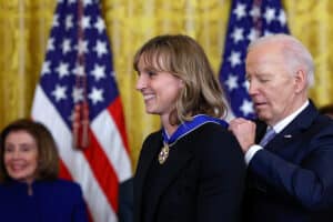 “Powered by faith, family, and teamwork, Katie Ledecky is a symbol of perseverance and strength with a heart of gold that shines for the nation and for the world,” President Joe Biden said before presenting the honor to the swimmer.