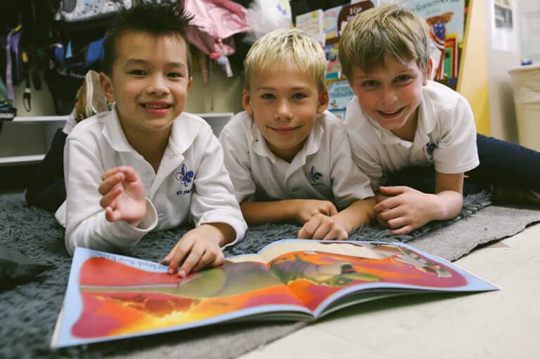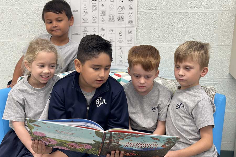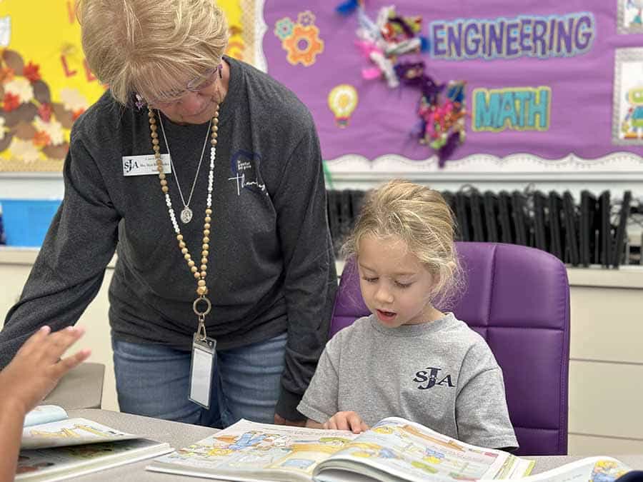 Catholic schools stress learning the fundamentals September 30, 2025By Katie V. Jones Catholic Review Filed Under: Feature, Local News, News, Schools For Mary Beth Nocket, a first-grade teacher at St. Joan of Arc School in Aberdeen, the thrill of watching 6-year-old students discover they can read words never grows old. St. Joan of Arc student Ethan Deering, second from left, reads to Adrianna Zacker, from left, Eli Coppola, August Morgan-Suchowski and Keegan del Rosario. (Courtesy St. Joan of Arc School) “Those lightbulb moments are fascinating to watch,” Nocket said. “My heart is full. They get it. It is very uplifting.” Teaching reading and writing in first grade holds enormous weight. The journey begins in kindergarten with letter sounds and phonics, but in first grade comes the crucial work of decoding and sounding out words, Nocket said. “Reading is so important. We read the rest of our lives, for job applications, for rental contracts,” Nocket said. “You need a good foundation.” That foundation seems increasingly critical. According to the U.S. National Assessment of Educational Progress (NAEP), only about 31-33 percent of fourth graders performed at or above the proficient level in reading in recent assessments. A striking 40 percent are now reading below the basic level, the highest share seen in many years. St. Joan of Arc teacher Mary Beth Nocket reads with Adrianna Zacker. (Courtesy St. Joan of Arc School) Low literacy correlates with long-term economic disadvantage. In August 2025, the unemployment rate for adults 25 and older without a high school diploma was 5.4 percent – significantly higher than for those who finished high school or went on to college, according to the U.S. Bureau of Labor Statistics. Catholic schools generally perform above national averages in core subjects. On the most recent NAEP, Catholic school fourth graders scored about 10 points higher than their public-school peers in math and roughly 15 points higher in reading. Eighth graders posted an even wider gap – about 20 points higher in reading. Back in her Aberdeen classroom, Nocket’s daily focus stays close to home. Reading is the cornerstone – and helping her children know God cares for them. “Know God always loves you,” said Nocket, who also teaches writing, math, science and social studies. “It gives them a strong sense of security that they are cared for.” Email Katie V. Jones at kjones@CatholicReview.org Read More Schools Calvert Hall holds off Loyola Blakefield to claim a 28-24 victory in the 105th Turkey Bowl Maryland pilgrims bring energy and joy to NCYC 2025 5 Things to Know about the 2025 Turkey Bowl Mercy High School freshman set to ask question of Pope Leo XIV Baltimore-area Catholic school students take active role in Ignatian Teach-In Faith, fortitude inspire St. Mary’s freshman through journey with kidney disease Copyright © 2025 Catholic Review Media Print
