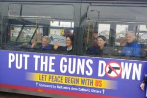With the words “Put the Guns Down – Let Peace Begin with Us” emblazoned across its side, a Baltimore City bus proclaimed a message of peace May 22, as Catholic sisters from eight religious congregations gathered alongside it on Monroe Street.