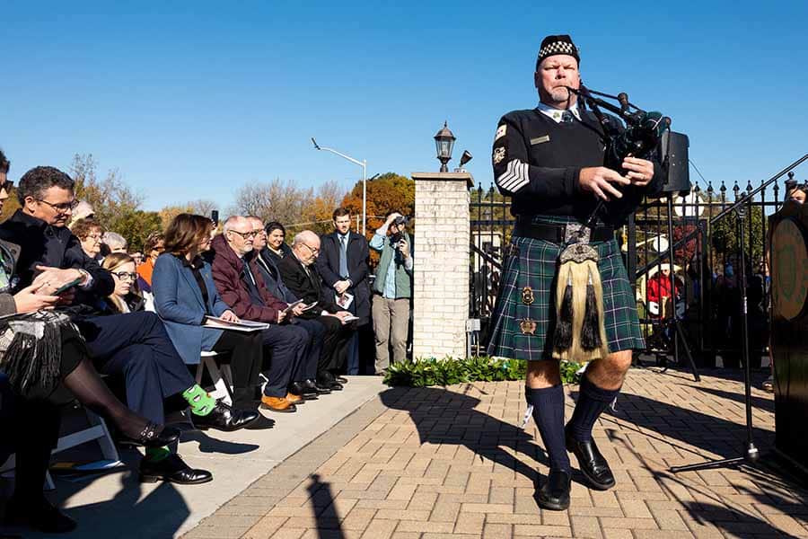 Catholics join in Chicago international commemoration of Ireland’s Great Famine November 4, 2025By Simone Orendain OSV News Filed Under: Immigration and Migration, News, World News CHICAGO (OSV News) — On Nov. 2, the feast of All Souls, Catholics in Chicago joined in commemorating the great Irish famine that left more than 1 million people dead and began the mass exodus of Irish refugees and migrants seeking a better life to the United States and other countries 180 years ago. Ireland’s National Famine Commemoration Committee chose Chicago as the 2025 host city for its annual international event, during a time that the immigration crackdown in the United States has deeply touched the city. In a statement that day marking the commemoration of Ireland’s great famine, Chicago Cardinal Blase J. Cupich prompted the faithful to “join (him) in prayer and remembrance” in commemorating the tragedy. “As we observe this sad anniversary, let us also remember that what turned an agricultural failure into human tragedy was the reality that their government stood by and watched it happen without meaningful response,” he said. Piper John Harmening opens the 2025 International Famine Commemoration at Chicago Gaelic Park in Oak Forest Nov. 2, 2025. Catholics in Chicago remembered the Irish famine that left more than 1 million people dead and began the mass exodus of Irish refugees and migrants seeking a better life to the United States and other countries 180 years ago. (OSV News photo/Hailey Hoffman) The Great Hunger, or “An Gorta Mór” as it is called in Irish, began in 1845 when Ireland’s potato crops — the mainstay of two-thirds of Ireland’s population — failed for several seasons from a decay-causing fungal attack that spread across the country’s land. However, the ruling British government insisted that food export quotas from Ireland be maintained while spending little to aid the people, leading to mass death among the Irish by starvation, famine-induced diseases, exhaustion in workhouses and exposure to elements following eviction-induced homelessness. British landlords also turned out tens of thousands of Irish tenant families who could no longer pay rent — 50,000 families alone by 1846 — tearing down their homes and confiscating their properties, with many landlords seeing the crisis as an opportunity to build larger and more profitable estates. The crisis worsened after the British government saddled Ireland’s landlords and tenants with financing their own famine relief under the 1847 Poor Law tax amendment. Many tenant families were therefore coerced into surrendering their plots of land to receive aid and had to join overcrowded workhouses where mortality rates soared. Historians estimate that between 1-1.5 million people in Ireland died by the time the famine ended in 1852. “It is difficult, even from the distance of many generations, to contemplate the enormity of the disaster that left more than a million dead and forced many more into a shadow existence of workhouses and privation,” Cardinal Cupich said. “Neither did the million who boarded ships to anywhere hope might lie find a warm welcome in their new countries. Shunned because of their faith and their poverty, many were told they ‘need not apply’ for work. Still, the gifts they brought and their perseverance have enriched every place they found refuge, however grudging.” On the sunny grounds of Chicago Gaelic Park, an Irish cultural center in the Village of Midlothian on the southwest border of the city, Ireland’s minister of culture, communications and sports, who also chairs the commemoration committee, laid a wreath at a famine memorial sculpture at the Nov. 2 ceremony. Culture Minister Patrick O’Donovan stood by the bronze sculpture of a weary looking, bone-thin family made decades ago by Father Anthony Brankin, a retired Chicago priest of Italian and Irish descent, who celebrated All Souls’ Day Mass at the park’s banquet hall. Before laying the wreath, O’Donovan conveyed to the few hundred people gathered the enormity of the disaster that reduced Ireland’s pre-famine population of 8 million by more than 3 million people within a decade. The island’s population today — 7.1 million between the Republic of Ireland and Northern Ireland — is still lower than its pre-famine peak. O’Donavan described the plight of the more than 1 million Irish who died of starvation and its related illnesses. He also described how almost 2 million Irish permanently exited their homeland to flee the Great Hunger: “Coffin ships,” barely seaworthy vessels, carried most of the Irish refugees and migrants across the Atlantic to the United States during this time, while others headed to Australia and other countries. “If you were lucky to make it to the United States, you were lucky,” said O’Donovan in an impassioned speech highlighting the stripping away of his people’s native tongue, culture and Catholic faith (among other faiths) under British rule. “Otherwise you were dumped at sea as another unrecorded victim of bad management and bad politics. Because for me, while the potato blight was caused by nature, the Irish famine was caused by politicians and particularly those in Westminster, who showed absolutely no regard for and no compassion, no empathy, no sympathy, for the Irish.” Once in the U.S., the Irish immigrants who suffered the famine mainly settled in Boston and New York, where they were labeled “aliens” by the press, subjected to economic and social exploitation and discrimination, and attacked by American Protestant mobs. The experience was replicated in other major U.S. cities to which the Irish migrated. Today, more than 40 million Americans, or 15 percent of the U.S. population, claim Irish descent. The Chicago Tribune reported by 1850, one of every five Chicagoans was Irish. According to the American Enterprise Institute in 2023, Cook County, which incl