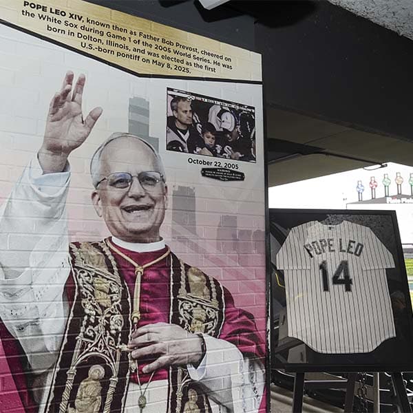 Chicago stadium seat gains fame: It’s where future pope saw first game of 2005 World Series September 6, 2025By Simon Caldwell OSV News Filed Under: News, Sports, Vatican, World News CHICAGO (OSV News) — Since Aug. 22, Chicago White Sox fans have been able to easily spot the stadium seat where Pope Leo XIV sat when he watched the first game of the 2005 World Series. The team put a plaque and markers including the pope’s image on the back of the forest green seat in row 19 of section 140 inside Rate Field on Chicago’s Southside. “Not only the historical significance of the first pope from the United States, but just the historic significance of any time a new pope is elected and announced, it’s such a momentous occasion,” explained Christine O’Reilly, the White Sox vice president for community relations. Pope Leo XIV wears a Chicago White Sox baseball cap during his weekly general audience in St. Peter’s Square at the Vatican June 11, 2025. (OSV News photo/Remo Casilli, Reuters) “And the fact that Pope Leo — Father Bob, Bob from (suburban) Dolton — who happened to be a White Sox fan, who happened to be at game one of the World Series, it all just really was something that we couldn’t help not only embrace, but to memorialize,” she said. “So that all of our fans could see it and really share in the overall excitement.” According to her, tracing back the now famous image of the pope sitting in the stadium, of then-Augustinian Father Robert Francis Prevost (or Father Bob as many called him) dressed in his team’s colors of black and white, was a low-tech endeavor. There was no digital image shot with a smartphone with embedded data, and no need for exact coordinates. Instead, O’Reilly described, the in-house video camera captured on the big stadium screen Father Bob sitting next to a father and son of a family that to this day still has those same season seats to the White Sox games. After the game, friends inundated the father, Ed Schmidt, with messages on his home phone that they saw him watching the game. Then, she said, years later when all of Chicago was chattering about their homegrown pope once he was elected May 8, someone mentioned seeing him and Schmidt on those few seconds of video. “So it was a matter of just going and reviewing the game broadcast footage because they knew from other people telling them that they had seen them on TV,” O’Reilly told OSV News. “And of course, they knew where their season tickets were. So that’s how we were able to determine the actual seat location that then Father Bob, now Pope Leo XIV, was sitting in at the time.” Having a hometown pope, said O’Reilly, a Catholic, makes the Chicago metro area with a population of 9.4 million feel like a “small, intimate, large city” where people have connections to one another. She said Pope Leo is “very, very close, dear friends” with the Schmidts through St. Rita High, an Augustinian-run school on the Southside where he substitute taught and would visit often as superior of the order’s Midwest province (1999-2001), and where Schmidt was an active board member. Also, many of O’Reilly’s family members graduated from St. Rita’s. In one of her first positions with the Sox, O’Reilly said, she was in season ticket sales and sold Schmidt his first season passes. A mural dedicated to Pope Leo XIV, alongside a special Pope Leo No. 14 Chicago White Sox jersey, is unveiled in Section 140 of Rate Field, the White Sox’s ballpark, in Chicago, May 19, 2025. (OSV News photo/Courtesy of the Chicago White Sox) Jim Keating, a diehard White Sox fan and lifelong Chicago Southside resident who lives a block and a half from the ball park can name a few of those close common connections to the pope too, especially during game one of the 2005 World Series. He doesn’t personally know Pope Leo but “they had him on the big screen, apparently, right? You know, at some point, me and my wife were on the big screen, too, during the same game. It’s like, wild … you can’t make this stuff up.” Keating pointed out his age, 70, which Pope Leo will be on Sept. 14. His daughter called him moments after the pope was elected and said her childhood friends started contacting her to tell her then-Bishop Prevost presided over their confirmations. And Keating, a daily Massgoer who went to Catholic school from elementary through college added, “I’m retired, right? From law enforcement, but in the security job that I’ve had in the last couple years, we have done security details around his old house. It’s that crazy … because we’ve been working in Dolton, trying to protect some utility workers.” The pope’s childhood home in the southeast suburb of Dolton is now in a city whose mainstay manufacturing industry died off, where crime has been common and Keating said robberies of utility workers happened regularly. Since his election, droves of visitors from the city and way beyond have been stopping at the house’s front yard to pray and take photos. And the city of Dolton bought the home in July with plans to turn it into a historical site. In the years that included the White Sox last World Series win (2005), Pope Leo was prior general of the Augustinian order (2001-2013). Then in 2014, Pope Francis appointed him administrator then bishop of Chiclayo, Peru, where he had been a missionary in the ’80s and ’90s in the country’s mostly impoverished north and northeast. He then became cardinal in 2023. On his regular visits home to Chicago, he would celebrate Masses (as recently as last summer) and as bishop preside over confirmations, ordinations and other prelates’ duties, catching the occasional game of his favorite baseball team. For Richard King, another loyal White Sox fan from the Southside, the pope being a fan has been “fun.” He said, “There are several people that have dressed like the pope at the White Sox game. So there’s all kinds of humor