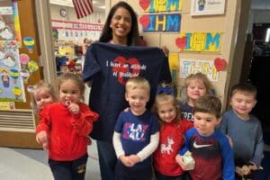 Students and teachers who consistently make “holy moments” choices receive special T-shirts to wear on designated days. “It’s not competitive and they are given out sparingly,” Surine said. When a student is recognized, peers gather for a photo. “They’re very supportive.”