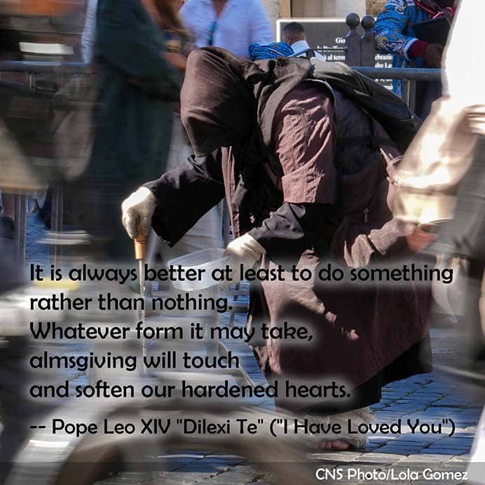 Church must ‘walk poor with the poor’ to serve Christ, says Pope Leo in new exhortation October 9, 2025By Gina Christian Filed Under: Catholic Social Teaching, Feature, News, Social Justice, World News In his first apostolic exhortation, Pope Leo XIV has taken up the call of Pope Francis for Christians to see in the poor the very face of Christ — and to be a church that “walks poor with the poor” in order to authentically live out the Gospel. “Dilexi Te” (“I Have Loved You”) was publicly released Oct. 9, having been signed on Oct. 4, the feast of St. Francis of Assisi, whose radical embrace of poverty and service to the poor is presented as a key example in the exhortation. The document, which totals more than 21,000 words spanning five chapters, takes its title from Rv. 3:9, in which Christ addresses “a Christian community that, unlike some others, had no influence or resources, and was treated instead with violence and contempt,” wrote Pope Leo. A quote from Pope Leo XIV’s apostolic exhortation “Dilexi Te” (“I Haved Loved You”) is seen over a photo of a person asking for alms near St. Peter’s Square at the Vatican Oct. 8, 2025. (CNS illustration/Joanna Kohorst with photo by Lola Gomez) The exhortation completes one that “Pope Francis was preparing in the last months of his life” — namely, an apostolic exhortation on the church’s care for the poor that built on the late pope’s 2024 encyclical “Dilexit Nos,” said Pope Leo. “I am happy to make this document my own — adding some reflections — and to issue it at the beginning of my own pontificate, since I share the desire of my beloved predecessor that all Christians come to appreciate the close connection between Christ’s love and his summons to care for the poor,” wrote Pope Leo, who retained Pope Francis’ planned title for the work. Pope Leo said he, like his predecessor, considered it “essential to insist on this path to holiness,” since — as Pope Francis wrote in his 2018 apostolic exhortation “Gaudete et Exsultate” — “in this call to recognize him in the poor and the suffering, we see revealed the very heart of Christ, his deepest feelings and choices, which every saint seeks to imitate.” The exhortation draws extensively on Scripture, papal and conciliar documents, the works of the Church Fathers and the lives of numerous saints — as well as the “ecclesial discernment” of the Latin American bishops, to whom Pope Leo said he was “greatly indebted,” having previously served as an Augustinian missionary in Peru for several years. Poor as a priority Throughout the document, Pope Leo urges Christians to recognize God’s oneness with the poor, and to prioritize them according to the demands of faith. “Love for the Lord … is one with love for the poor,” wrote the pope, observing later in the document that “Jesus’ teaching on the primacy of love for God is clearly complemented by his insistence that one cannot love God without extending one’s love to the poor.” In an even more direct passage, Pope Leo admitted, “I often wonder, even though the teaching of Sacred Scripture is so clear about the poor, why many people continue to think that they can safely disregard the poor.” He stressed that poverty is “a multifaceted phenomenon,” and that “there are many forms of poverty.” Among those are material impoverishment; social marginalization; moral, spiritual and cultural poverty; “personal or social weakness or fragility”; and “the poverty of those who have no rights, no space, no freedom.” In addition, said Pope Leo, forms of poverty have continued to evolve in ways that are “sometimes more subtle and dangerous.” He warned that “in general, we are witnessing an increase in different kinds of poverty, which is no longer a single, uniform reality but now involves multiple forms of economic and social impoverishment, reflecting the spread of inequality even in largely affluent contexts.” People walk along a dirt road as a barefoot child runs ahead in Port Moresby, Papua New Guinea, Sept. 8, 2025. (CNS photo/Lola Gomez) Globally, women often bear the brunt of poverty in its various manifestations, said Pope Leo, citing Pope Francis’ 2020 encyclical “Fratelli Tutti.” Causes, challenges of poverty Throughout the text of his exhortation, Pope Leo examined personal, cultural, social and systemic factors that both incur poverty and prevent its eradication — all of which, in essence, derive from a disregard for the sanctity of every human life. “The poor are not there by chance or by blind and cruel fate. Nor, for most of them, is poverty a choice,” said Pope Leo. “Yet, there are those who still presume to make this claim, thus revealing their own blindness and cruelty.” He pointed to a culture — one “sometimes well disguised” — that “discards others without even realizing it and tolerates with indifference that millions of people die of hunger or survive in conditions unfit for human beings.” The pope also deplored “that specious view of meritocracy that sees only the successful as ‘deserving.'” Such views fuel structures of sin in society that, as Pope Francis said in “Dilexit Nos,” are often “part of a dominant mindset that considers normal or reasonable what is merely selfishness and indifference,” wrote Pope Leo. As a result, said Pope Leo, “It then becomes normal to ignore the poor and live as if they do not exist,” and “likewise seems reasonable to organize the economy in such a way that sacrifices are demanded of the masses in order to serve the needs of the powerful.” Christians themselves have not been immune from “attitudes shaped by secular ideologies or political and economic approaches that lead to gross generalizations and mistaken conclusions,” wrote Pope Leo. “The fact that some dismiss or ridicule charitable works, as if they were an obsession on the part