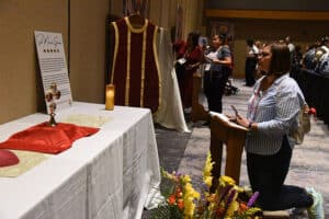 Saints and blesseds whose relics were available for veneration in the chapel included the four patron saints of the National Eucharistic Pilgrimage: the Blessed Virgin Mary, St. Juan Diego, St. Elizabeth Ann Seton and St. Junipero Serra. The relic of Mary featured in the chapel was part of her veil.