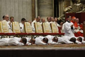 VATICAN CITY (CNS) — Before the Altar of the Chair in St. Peter’s Basilica, a symbol of the Catholic Church’s unity behind the successor of St. Peter, 15 men laid prostrate to express their humility and take vows of chastity and obedience to their bishop.