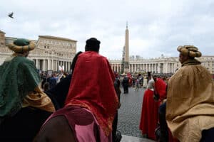 While Pope Francis and thousands of people were at Mass in St. Peter’s Basilica, thousands more lined the main boulevard leading to St. Peter’s Square for the traditional, folkloric Epiphany celebration. Marching bands and people in Renaissance costumes paraded up the street behind the Three Kings on horseback.