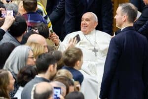 Many Vatican employees brought their young children to the audience. After delivering his speech, the pope passed through the crowd in the Paul VI Audience Hall in a wheelchair, taking his time to greet the families and handing out small chocolate Santas to the children.