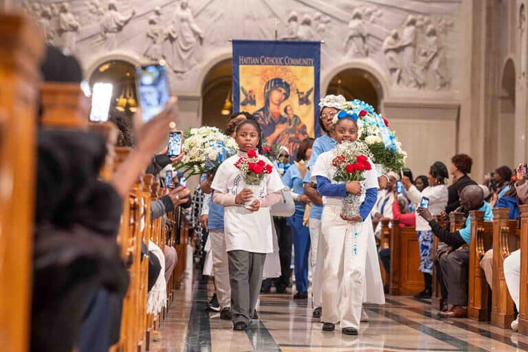 Haitian Catholics persevere with faith, courage amid adversity in US and in troubled homeland December 20, 2025By Mark Zimmermann OSV News Filed Under: Immigration and Migration, Jubilee 2025, News, World News WASHINGTON (OSV News) — Cardinal Christophe Pierre, apostolic nuncio to the United States, acknowledged “the struggle” that is Haiti’s “reality,” but he assured an estimated 5,000 Haitian Catholics gathered in Washington that Mary “walks with us in our struggles” as a mother. The cardinal, who was apostolic nuncio in Haiti from 1995 until 1999, celebrated the Mass for the annual Haitian Catholic Community Pilgrimage to the Basilica of the National Shrine of the Immaculate Conception in Washington Dec. 6. Haitian Catholics from across the United States and Canada filled the largest Catholic church in North America for the pilgrimage marking the Jubilee Year of Hope. Women bring offertory gifts to the altar during a Mass for the annual nationwide Haitian Catholic Community Pilgrimage to the Basilica of the National Shrine of the Immaculate Conception in Washington Dec. 6, 2025. Some of the women carried baskets with grapes, oranges, bananas, pineapples and bottles of wine. (OSV News photo/Mihoko Owada, Catholic Standard) Speaking in Creole, French and English during his homily, Cardinal Pierre praised Haitian Catholics, noting their perseverance in faith, their devotion to Mary and their courage in the face of adversity. “We know the struggle still marks our reality today, the violence many of your families have witnessed, the instability in the Caribbean region, the wounds that come from poverty, migration and natural disasters,” the cardinal said. But he pointed to how Mary believed God’s promise, and gave birth to Jesus who brought salvation to the world. Mary, he said, “walks with us in our struggles, not as a distant figure, but as a mother. She accompanies us in the battle and reminds us that hope is stronger than fear.” The cardinal noted how Pope Leo XIV’s maternal grandfather of mixed race was born on the island of Hispaniola, where Haiti and the Dominican Republic are located. “I hope this is a special reminder of your bond with the pope and with the entire Catholic family,” he said. Cardinal Pierre reflected on that day’s Gospel reading, which described how the angel Gabriel announced to Mary that she would give birth to Jesus, and he said the angel’s words, “Do not be afraid,” are “God’s words for us today, especially for those whose families face insecurity and who live with uncertainty about the future.” Haiti, the poorest country in the Western Hemisphere, has been plagued by waves of gang violence and instability in recent years. In the United States, the Department of Homeland Security in September terminated Temporary Protective Status for Haitian immigrants who had resettled in the United States in 2010 following a devastating earthquake in their country. In June, the Trump administration announced a travel ban and restrictions against 19 countries including Haiti, and DHS in recent weeks announced a pause in processing immigration applications for people from those countries. Noting that “today is not only a moment to remember the trials facing your beloved homeland, though those sufferings are real and remain close to our hearts,” Cardinal Pierre said the Dec. 8 feast of the Immaculate Conception offered a reminder that “God is with us.” The cardinal said that something else that the angel Gabriel said to Mary — “Nothing will be impossible to God” — offers hope to Haitians and their families and their homeland, and “for the Church and for each of us.” “Mary believed that promise. She trusted in it, and because of her trust, the world was changed,” he said. Concluding his homily, Cardinal Pierre encouraged Haitian Catholics to ask Mary to help them receive “the grace of a new hope, the hope that comes from knowing that God is at work, that Christ is with us, and that nothing will be impossible to God. … May Mary, pure mother of hope intercede for us, protect your families, strengthen your homeland and lead us all closer to your Son, Jesus Christ our Lord.” The Mass began with joyful singing led by a Haitian Catholic choir, as a boy and a girl carrying flowers led a procession down the basilica’s main aisle, followed by adults carrying banners with images of Mary including Our Lady of Perpetual Help, Haiti’s patron saint, and other adults carrying small flags from their native country. The bishops concelebrating the Mass with Cardinal Pierre included Cardinal Robert W. McElroy of Washington; Archbishop Timothy P. Broglio of the U.S. Archdiocese for the Military Services; Bishop Jacques Fabre-Jeune of Charleston, South Carolina, the first Haitian-born bishop to lead a diocese in the United States; Bishop Robert J. Brennan of Brooklyn, New York; Bishop Pierre-André Dumas of Anse-à-Veau-Miragoâne, Haiti; Auxiliary Bishop Wismick Jean-Charles of Port-au-Prince, Haiti; and Washington Auxiliary Bishop Evelio Menjivar. About 50 priests also concelebrated the Mass. Lionel Delatour, the ambassador of the Republic of Haiti to the United States, was among the people attending the Mass. Offering a greeting to the pilgrims, Cardinal McElroy noted that he had been looking forward to the Mass. “Many people have told me this is the most joyous Mass that takes place in the shrine in the whole of the year, and I can see that that is true,” he said. The cardinal also praised the faith and hope of Haitian communities in the United States and in Haiti. “For us as Christians, hope is not the belief that everything always comes out all right. Hope for us as believers is the understanding that in our moments of greatest suffering, God will find a way to stand by our side and accompany us through. That is true Christian hope,” Cardinal McElroy said. Washington’s archbishop — who has spoken out ag
