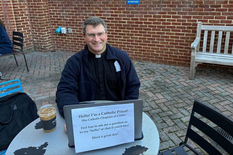 ‘Hello! I’m a Catholic Priest!’ How one coffee shop ministry attracts student seekers October 26, 2025By Kimberly Heatherington OSV News Filed Under: Colleges, Evangelization, News, World News “Hello! I’m a Catholic Priest!” greets the cheerful, large-font sign taped to the back of the laptop computer of Father Richard Miserendino, chaplain of the University of Mary Washington’s Catholic Campus Ministry and a priest in the Diocese of Arlington, Va. The notice also invites passersby at the campus coffee shop — in Fredericksburg, Va., about an hour from Washington — to ask him a question, chat, or just say hello. Everyone has heard of faith sharing, even if Catholics can sometimes find the concept more than a little intimidating. So is this cafe evangelism? Evangelization is admittedly an essential component of any Catholic priest’s professional toolkit, but Father Rich — as he is affectionately nicknamed — would probably also tell you that his usually twice-weekly station at a small, round patio table with chipped paint is not equivalent to a pulpit — and evangelization is not always his first or only mission while he’s sitting there. Sometimes, it’s just to listen. In the course of a couple of hours on a recent bright and clear fall day — the first after the 110-plus-year-old secular university’s fall break, when the leaves were turning and a jacket seemed like a good idea — Father Miserendino exchanged brief greetings with dozens of students who walked past. Others, however, took a seat — and it’s then that the priest’s ministry of presence was especially evident. A former U.S. Marine was adapting to civilian challenges in the wake of an intense deployment. Another student recently lost a grandparent. A young man wearing a white cowboy hat and clutching a cellophane-wrapped bouquet of bright flowers was on his way to present them to his girlfriend, to mark the six-month anniversary of their relationship. Different people with different stories — but each trusted the bespectacled and affable man in a clerical collar with their confidences as they sat or stood in the early afternoon sunshine. “Sometimes, they’re a bit more theological. Sometimes they’re a bit more heart — you know, things that people are working through,” Father Miserendino, who began his alfresco ministry about a year ago, shared with OSV News. “Sometimes people are just lonely, and they just want to talk. And so, it varies.” The UMW Catholic Campus Ministry features both the St. John Bosco Center — its official “headquarters”, with a large multipurpose room for Sunday Mass and social events, a daily Mass and Adoration chapel, student lounge, kitchen, conference room, and staff offices — and the next-door St. Dominic Savio House — used for preparing people for entry into the Catholic Church, Bible studies, and other events. But catching the sometimes fragmented attention of students can still be a challenge. “We do a lot of stuff on campus,” Father Miserendino explained, mentioning a recent Eucharistic procession — the rugby team gave way as it passed — as well as public Eucharistic adoration. “But it’s amazing how — in the cell phone age, with earbuds in, and everybody’s looking at their phone — you can have big billboard signs that say ‘Catholic Campus Ministry’ and they’re going to walk right by.” Father Miserendino said that, as he pondered his outreach predicament, a Gospel passage — Matthew 4:19 and Mark 1:17 — came to him. “So how do I go where they are? Jesus says, ‘I’ll make you fishers of men’ — and that’s always stuck with me,” he recalled. “If I’m going fishing and I’m constantly fishing in this one spot and there’s no fish — try moving the boat, you know?” “I don’t think I’m the first priest to try something like this; I think there are others,” admitted Father Miserendino. “But I’ve always wanted to do it. I’ve got to get my computer work done — send out emails; the bureaucratic part of the vocation,” he said. “But I can do that as easily out there as I can in the office.” He was, however, duly warned about the potential success of the idea with the student body of approximately 3,800 from 33 states and 15 countries, around a quarter of whom Father Miserendino estimates are Catholic. “I was given the impression coming in that they would, you know, break my bones to make their bread,” he laughed. “And it would just be adversarial around the clock.” But that never happened. “It became this thing where I was like, ‘Wow, this actually is really working. People are coming up, and they’re asking me questions,'” said a still somewhat surprised Father Miserendino, who praised the support of university administration. “It’s been really edifying to see that this generation of college students, it’s not adversarial. There’s a lot of really great openness to asking questions.” “I would not say that every conversation I have leads to immediate conversion where somebody says, ‘Oh my gosh — now I’m going to be Catholic.’ But,” he added, “usually it’s the start to another conversation, and another conversation.” Relationships develop gradually. “The interesting thing is, sometimes people will see you for a couple of days and they’ll wave, or you’ll get a couple of head nods, or whatever,” observed Father Miserendino. “And then after three or four days, that’s when they’ll finally work up the courage to come talk to you. It’s a labor of love, and it takes time — but you’ve got to be out there, being present.” And while American college campuses are often portrayed as fiery ecosystems of confrontational political and social advocacy, that hasn’t been his experience. “It’s not as much driven by current events as you might think. Very few people ask me about politics,” Father Miserendino noted. “And nobody ha