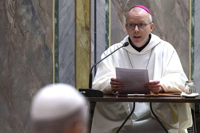‘Hidden Glory’: Highlights from Bishop Varden’s meditations for papal Lenten retreat February 28, 2026By Courtney Mares OSV News Filed Under: Feature, Lent, News, Vatican, World News ROME (OSV News) — Norwegian Bishop Erik Varden preached a series of meditations for the first Lenten retreat of Pope Leo XIV and the Roman Curia, reflecting on the splendor of truth and the Christian idea of freedom, as well as sin, abuse and Church corruption. Bishop Varden of Trondheim, a Trappist monk, shared wisdom from contemplative life during the retreat, drawing from the writings of St. Bernard of Clairvaux, a 12th-century abbot and doctor of the church. “It is tempting to think we must keep up with the world’s fashions. It is, I’d say, a dubious procedure. The Church, a slow-moving body, will always run the risk of looking and sounding last-season,” Bishop Varden told the pope and the cardinals in a meditation on Feb. 24 in the Pauline Chapel of the Apostolic Palace. “But if she speaks her own language well, that of the Scriptures and liturgy, of her past and present fathers, mothers, poets, and saints, she will be original and fresh, ready to express ancient truths in new ways, standing a chance, as she has done before, of orienting culture.” Pope Leo XIV poses with Bishop Erik Varden of Trondheim during the Roman Curia’s annual Lenten retreat in the Pauline Chapel at the Vatican Feb. 22, 2026. The Norwegian bishop was chosen by Pope Leo to preach at the Lenten retreat, which runs from Feb. 22 to 27, and will reflect on the theme, “Illuminated by a Hidden Glory.” (OSV News photo/Simone Risoluti, Vatican Media) Pope Leo chose Bishop Varden to preach at the week retreat, which runs through the evening of Feb. 27, reflecting on the theme, “Illuminated by a Hidden Glory.” — Splendor of truth Many people today are earnestly asking the question, “‘What is truth?'” Bishop Varden said in his evening meditation on Feb. 24, noting that often people ask the question “with remarkable good will, notwithstanding their confusion, fear, and the rush they are always in.” — The Church cannot let the question go unanswered, he said. “We need our best resources to uphold substantial, essential, freeing truth against more or less plausibly shining, more or less fiendish substitutes,” Bishop Varden said, underlining the “imperative to see and articulate the world in Christ’s light.” He noted that the Second Vatican Council’s universal call to holiness was “to embody truth,” and that “the Christian claim to truth becomes compelling when its splendor is made personally evident with sacrificial love in sanctity, cleansed of temptations.” — Christian freedom Bishop Varden also reflected in his morning meditation on Feb. 24 on how “the notion of ‘freedom’ has become contentious in public discourse” with political causes utilizing “the jargon of freedom.” “Christian freedom is not about seizing the world with force,” he clarified.”It is about loving the world with a crucified love magnanimous enough to make us freely wish, one with Christ, to give our lives for it, that it may be set free.” “To subscribe to a Christian idea of freedom is to consent to pain,” he said. “When Christ tells us: ‘Resist not evil’, he does not ask us to countenance injustice. He lets us see that justice’s cause is sometimes best served by suffering for it, refusing to meet force with force. Our emblem of freedom remains the Son of God who ’emptied himself.'” — Abuse and corruption On Feb. 25, Bishop Varden addressed the subject of clerical sexual abuse in a meditation titled “The Fall of Thousands.” “Nothing has done the Church more tragic harm, and compromised our witness more, than corruption arisen within our own house,” he said. “The worst crisis of the Church has been brought on, not by secular opposition, but by ecclesiastical corruption. The wounds inflicted will take time to heal. They call out for justice and for tears.” Bishop Varden acknowledged the temptation when confronting abuse “to look for a diseased root,” noting that early warning signs are not always present. Citing St. Bernard, he said that where people pursue noble endeavors, enemy attacks will be fierce, adding that St. Bernard still “holds men and women responsible for the way in which they use their sovereign freedom.” “There are falls that reek hellishly, bringing destruction to the guilty and carrying ruin in their wake. That wake is often broad and long, pulling in many innocents,” the bishop said. — Hidden glories In a Feb. 25 meditation, Bishop Varden highlighted the “hidden glory” that is perceptible now before reaching the glories of heaven. “The Church reminds women and men of the glory secretly alive in them,” he said. “She shows us that present mediocrity and despair, not least my despair at my own persistent failures, need not be final; that God’s plan for us is infinitely lovely; and that God, through Christ’s Mystical Body, will give us grace and strength, if only we ask.” He highlighted how the Church manifests the radiance of “hidden glory” in her saints and channels “hidden glory” in her sacraments, especially the Eucharist. The saints, he said, “stand as proofs that even illness and degradation may be means providence uses to realize a glorious purpose, bestowing strength on the feeble and making them radiant.” — Angelic priestly ministry On Feb. 26, Bishop Varden reflected on “angelic encounters,” which he said, are always personal and can never be replaced “by a download or a chatbot.” Quoting the popular prayer that asks one’s guardian angel to “enlighten, keep, govern, and guide,” Bishop Varden noted that St. John Henry Newman saw a “priest’s ministry as angelic.” “The priest is at home in this world, unafraid to go into dark woods in search of the lost. At the same time he k