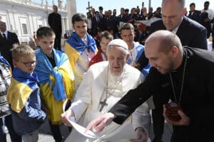The pope made his remarks April 27 during his weekly general audience in St. Peter’s Square, where he also asked that people “persevere in praying constantly for peace.”