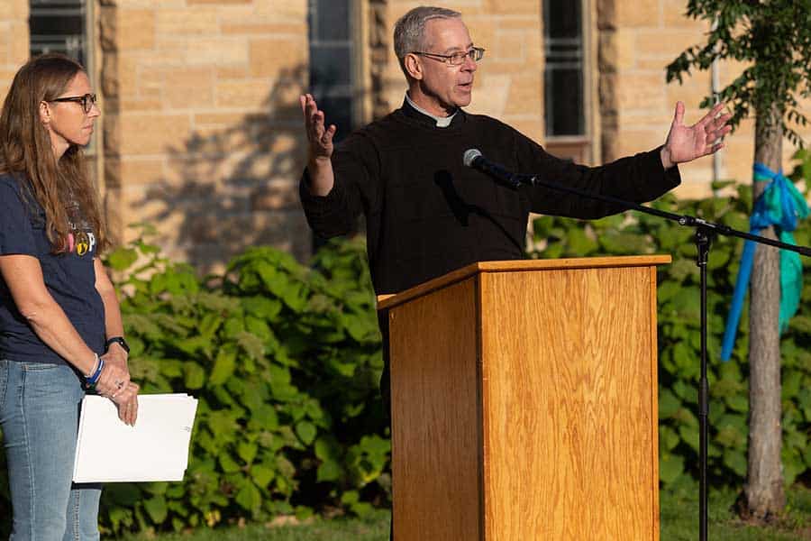 Hope, healing highlight prayer service and Mass a month since Annunciation shooting September 30, 2025By Joe Ruff OSV News Filed Under: Feature, Gun Violence, News, World News Sharing hugs, tears and smiles, more than 150 people gathered on the lawn outside Annunciation Catholic Church and School in Minneapolis for a morning prayer service Sept. 27. Led by Principal Matthew DeBoer, as well as the pastor, Father Dennis Zehren, and teachers and others in the Annunciation community, the 40-minute gathering at 8:30 a.m. marked exactly one month since a shooting at the church during an all-school Mass killed two students and wounded 21 other people. At 10 a.m., Archbishop Bernard Hebda presided and Bishop Michael Izen and numerous priests concelebrated a Memorial Mass at the Cathedral of St. Paul in St. Paul for the two students who lost their lives — 8-year-old Fletcher Merkel and 10-year-old Harper Moyski — and their families, and to pray for healing for the students and families of Annunciation school and parish. Father Dennis Zehren, pastor of Annunciation in Minneapolis, Minn., leads a prayer for those gathered for the prayer service at Annunciation on Sept. 27, 2025, the one-month anniversary of the shooting. (OSV News photo/David Hrbacek, The Catholic Spirit) “A special word of welcome to our Annunciation community,” Archbishop Hebda said in opening remarks. “I realize there are so many things going on in your lives. I am delighted that you would take time to join us as we offer this holy Mass, as we mark 30 days, this one month’s time, (since) the tragedy. … You know the whole archdiocese has been praying fervently throughout these days. In many ways, people might say they’re all prayed out. I see many of you who (have been) at the daily Rosary at Annunciation at 9 p.m. I know you’ve been offering your prayers.” At the prayer service, DeBoer spoke about the Merkel home as a place of hope and joy, and a day in August that Fletcher’s mother, Mollie, told him about. DeBoer described girls from the school with their “softball arms” flinging water balloons at boys from the school who were playing basketball in the Merkel’s backyard, “shooting hoops, probably shooting a lot of bricks, if I know those boys as their former coach.” “It turned into this beautiful back and forth,” DeBoer said. “She shared a video with me this week. The end of the video is Harper and Fletcher breaking open the balloons right over their heads to see who is more wet. We have to remember that joy. We have to remember that light,” the principal said. Many at the prayer service and at the Mass wore one of two recently made Annunciation T-shirts, one bearing the word “Hope” on the front with the words “Together we heal” on the back, the other with “Joy” on the front and “Be the light” on the back. Lydia Kaiser, 12, who suffered a gunshot wound on the left side of her head, was at the prayer service with members of her family. Harry Kaiser, her father and Annunciation’s gym teacher, said his daughter passed all cognitive, speech and physical tests so she was discharged from the hospital without any therapy referrals, though the family will continue to monitor her recovery. Lydia said she was back in school at Annunciation, which has been resuming classes in stages since Sept. 16. Many in the Kaiser family, including Lydia, also attended Mass at the cathedral. Her mother, Leah, spoke through tears afterward about the support her family has received. “I am just incredibly grateful that I am part of this Catholic community that is called Annunciation,” Leah Kaiser said. “It has brought this community together in prayer with the archbishop and all of his loving words. Our beautiful pastor, Father Zehren, and his just amazing homily. … “There are no words to express how much hope and love has just covered this whole dark event in our family and our community, in our daughter,” Leah Kaiser said. “All of us are suffering. But it is very clear that the light and the love are dominating everything.” In his homily, Father Zehren thanked those gathered and “all of the good and faithful followers of Jesus around the world” who have lifted the Annunciation community in prayer. “You have been such a source of strength, such a source of comfort to us all, that we pray that that same comfort of Jesus would now return back to you,” Father Zehren said. “As St. Paul writes, you have sown generously, may you also reap generously the great comfort of Jesus that you have shown us. May you come to know that, too, in your hearts.” Father Zehren said that in raising Fletcher, Harper and others in prayer, “we too, could be raised up to a little greater faith, a little greater hope. And it’s true, it’s the case when we commend somebody to heaven, then heaven more becomes our home. We understand better where we’re supposed to be heading. And when we commend our loved ones to God, then God becomes more real for us.” Sophia Forchas, 12, who was in critical condition for two weeks with head injuries from the shooting, has been recovering in a way her family has described as nothing short of miraculous. Father Zehren said he has been praying the words “talitha koum” for Sophia, which means little girl, arise, and are the words Jesus spoke in the fifth chapter of the Gospel of Mark as he raised a girl from the dead. “And it’s true that when one is raised up, we all get raised up a little more,” Father Zehren said. “And it’s been wondrous, miraculous, to see how Sophia has been being raised up. And every time we hear good news, how she takes another step and is raised up a little higher, we too are raised up a little higher to know the wonders of God working in our midst.” Noting the gift Fletcher and Harper were to the community when they were alive, Father Zehren said they point to an aspect of being childlike in the eyes of Jesus, that of 