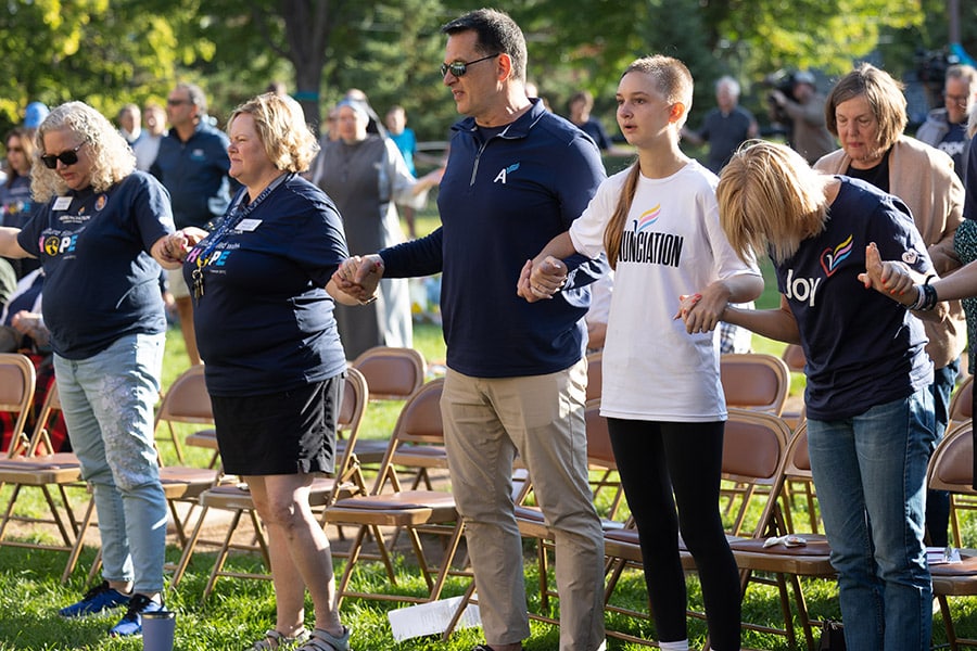 In first visit with Pope Leo, Archbishop Hebda delivers Annunciation letters to pontiff October 24, 2025By OSV News The Catholic Spirit Filed Under: Gun Violence, News, Vatican, World News ST. PAUL, Minn. (OSV News) — Letters from Annunciation students and their families in Minneapolis made it to Pope Leo XIV at the Vatican Oct. 1 — via Archbishop Bernard A. Hebda of St. Paul and Minneapolis as he visited with Pope Leo for the first time. “The recent encounter with Pope Leo was particularly meaningful for me because I had the opportunity to give to him letters that were written by students from Annunciation School and their families, thanking him for his prayers in the aftermath of the shooting that had taken place at the school in their church on Aug. 27,” Archbishop Hebda wrote in his Oct. 20 “Together on the Journey” weekly newsletter to the faithful. Two students were killed in the shooting during an all-school Mass at Annunciation Church in Minneapolis; 18 students and three adults were injured. The shooter died of a self-inflicted gunshot wound at the scene, police said. Harry Kaiser, center, prays the Our Father with his daughter, Lydia, second from right, and wife, Leah, right, during a prayer service at Annunciation in Minneapolis, Minn., on Sept. 27, 2025, the one-month anniversary of a shooting at the church. (OSV News photo/David Hrbacek, The Catholic Spirit) Pope Leo has been praying for the Annunciation community. In a telegram sent to Archbishop Hebda shortly after the shooting, Cardinal Pietro Parolin, the Vatican secretary of state, said the pontiff was “profoundly saddened” and “sends his heartfelt condolences and the assurance of spiritual closeness to all those affected by this terrible tragedy, especially the families now grieving the loss of a child.” Pope Leo also prayed for the Annunciation community after reciting the Angelus prayer with visitors in St. Peter’s Square Aug. 31. The pope added that “we include in our prayers the countless children killed and injured every day around the world” as well as prayers for an end to the global “pandemic” of gun violence. In his Oct. 20 newsletter reflecting on his visit with the pope, Archbishop Hebda said, “The loss of life on that (Aug. 27) occasion was horrific, and the impact on students, teachers and their families traumatizing. I asked Pope Leo for his continued prayers for Sophia Forchas and the other survivors who continue their recovery, and especially his prayers for those who might find it difficult to return to Annunciation Church or even to the celebration of the Mass.” Sophia, 12, who was in critical condition for two weeks with head injuries from the shooting, has been recovering in a way her family has described as nothing short of miraculous. Archbishop Hebda also wrote that he was in Rome for the ordination of two archdiocesan seminarians as transitional deacons — Deacons Charles DeReuil II and Steven Lang. Among the letter writers from Annunciation were Lydia Kaiser, an eighth grader at the school who was injured in the shooting, and her brother, Jimmy Kaiser, 17, a senior at DeLaSalle High School in Minneapolis. After a Sept. 27 memorial Mass at the Cathedral of St. Paul in St. Paul marking one month since the shooting, Jimmy Kaiser handed his letter to Archbishop Hebda, asking that the archbishop include it among the letters from Annunciation. Jimmy Kaiser said he thanked Pope Leo for his prayers and let the pope know that he was praying for him, as well. The Catholic Spirit, newspaper of the Archdiocese of St. Paul and Minneapolis. This story was originally published by The Catholic Spirit and is distributed through a partnership with OSV News. Read More Gun Violence Catholic bishops offer prayers for National Guard members shot in DC Brazilian cardinal calls for peace, solidarity with poor after deadly police raid Annunciation student critically injured in shooting discharged from hospital, met with cheers Parents at Annunciation in Minneapolis seek legislative change, gun control bills Evidence of mercy amid the madness Mexican priest murdered in cartel-ravaged Guerrero state Copyright © 2025 OSV News Print