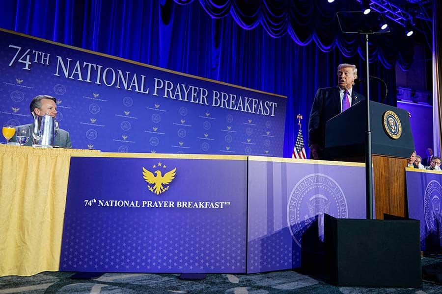 In National Prayer Breakfast address, Trump backs Noem after Minneapolis fallout February 5, 2026By Kate Scanlon OSV News Filed Under: News, World News WASHINGTON (OSV News) — President Donald Trump Feb. 5 said he will not fire Homeland Security Secretary Kristi Noem amid political fallout after some of her department’s controversial actions in Minneapolis. Critics including faith leaders have questioned immigration enforcement efforts in that city, especially after the deaths of Renee Nicole Good and Alex Pretti, both 37-year-old U.S. citizens and Minneapolis residents shot and killed by federal agents Jan. 7 and 24 respectively, in separate incidents. Rumors have circulated in Washington that Trump was considering ousting Noem from her Cabinet post as a result, but Trump appeared to dispute those rumors. U.S. President Donald Trump speaks during the National Prayer Breakfast in Washington Feb. 5, 2026. (OSV News photo/Al Drago, Reuters) “They were saying about Kristi Noem yesterday, I did the Super Bowl interview, ‘Sir, are you going to relieve Kristi Noem from her duties?’ No. Why would I do that?” Trump said in his address at the annual National Prayer Breakfast. “We have the strongest border in the history of our country. We have the best crime numbers we’ve ever had, going back to the year 1900, that’s 125 years.” Trump was referring to a pre-game interview with NBC News. Four major U.S. broadcasters — Fox, NBC, CBS and ABC — air the Super Bowl on a rotating schedule, and presidents often grant an interview to the network hosting the big game to air before the event. Faith leaders including Archbishop Paul S. Coakley of Oklahoma City, president of the U.S. Conference of Catholic Bishops, have called for prayer and calm in Minneapolis amid tensions that have grown in that city following the deaths of Pretti and Good. In his address, Trump said he was pleased to address the National Prayer Breakfast, an invitation-only event with policymakers and Christian leaders. He quipped that when aides told him he would be attending, he said, “I’ll be there. I’m afraid not to be. I need all the help I can get.” Trump touted strikes his administration carried out in Nigeria in response to violence in that country by Islamist groups perpetuated against predominantly Christian communities, but also in some cases, moderate Muslim communities. “We knocked the hell out of them the other day in Nigeria because they were killing Christians,” Trump said of a Christmas Day airstrike on what his administration said was an ISIS target. “You know about that? They were killing Christians, you can’t do that. When Christians come under attack, (the militants) know they’re going to be attacked violently and viciously by President Trump. I know it’s not a nice thing to say, but that’s the way it is,” Trump said. U.S. Homeland Security Secretary Kristi Noem speaks during a news conference at One World Trade Center in New York City Jan. 8, 2026, to discuss ongoing U.S. Immigration and Customs Enforcement (ICE) operations, as part of President Donald Trump’s immigration policy. (OSV News photo/David ‘Dee’ Delgado, Reuters) Trump, a Republican, also repeatedly questioned why people of faith would support his political opponents. “I don’t know how a person of faith can vote for a Democrat, I really don’t,” Trump said. “And I know we have some here today. I don’t know why they’re here, because they certainly don’t give us their vote.” El Salvador President Nayib Bukele also delivered remarks at the event, despite controversy over human rights conditions in his country generally but especially in a notorious prison there. The Trump administration has sent some individuals it has deported to that prison, alleging they are members of the criminal organization Tren de Aragua. Bukele cast his controversial efforts to reduce crime in El Salvador as a spiritual battle. “We won the spiritual war first, and that reflected in our physical world,” Bukele said. Trump called Bukele “one of my favorite people” and “a great ally” of the U.S. Trump also took issue with reporting about a joke he said he made in October 2025, when he told reporters on Air Force One that “I don’t think there’s anything that’s going to get me into heaven. I think I’m not maybe heaven-bound.” “I was being funny,” Trump said in his remarks about that comment. “I was trying to be, you know, you can’t be sarcastic with them, because they write your words, and (when) people are reading, the words are much different. But I said I’m never going to make it to heaven. I just don’t think I qualify. I don’t think there’s a thing I can do.” “I really think I probably should make it,” he continued. “I mean, I’m not a perfect candidate, but I did a hell of a lot of good for perfect people.” Elsewhere in his comments, Trump also took aim at Rep. Thomas Massie, R-Ky., calling him a “moron” over their recent disagreement on key funding votes. Massie has also called for the release of all files in the sex-trafficking investigation into Jeffrey Epstein, a multimillionaire financier who was found dead in prison of an apparent hanging in 2019. For many years, the National Prayer Breakfast was organized by the International Foundation, a Christian group that also used the name the Fellowship Foundation and sometimes the nickname “The Family.” In 2023, the event was reorganized following concerns from some lawmakers that the event was becoming too divisive after several controversial moments at the annual gathering. One such moment took place in 2013 when Dr. Ben Carson delivered remarks criticizing then-President Barack Obama’s health care policies while he was sitting nearby. Read More Immigration & Migration Amid U.S. foreign aid cuts, bishops call for solidarity between American, African Catholics Haitian Catholics in U.S. relieved, yet wary