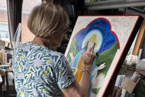 “Every time I come into my studio, I start with a prayer. I pray over my brushes. I pray over my paint. And, in the case of a saint, I pray to the saint,” she said. “I ask the saint to guide me to select the colors that the saint would want, to put the saint in a setting where the saint would want to be, and I ask the saint to speak to my heart, tell my heart what you want my hands to do.”
