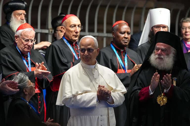 Interreligious dialogue is ‘way of life’ for Catholic Church, pope says October 29, 2025By Cindy Wooden Catholic News Service Filed Under: Ecumenism and Interfaith Relations, Feature, News, Vatican, World News VATICAN CITY (CNS) — For the Catholic Church, interreligious dialogue “is not a tactic or a tool, but a way of life — a journey of the heart that transforms everyone involved, the one who listens and the one who speaks,” Pope Leo XIV said. Dialogue is a journey that people walk “not by abandoning our own faith but by standing firmly within it,” he said. “For authentic dialogue begins not in compromise, but in conviction — in the deep roots of our own beliefs that give us the strength to reach out to others in love.” Pope Leo made the remarks Oct. 28 at a nighttime celebration marking the 60th anniversary of “Nostra Aetate,” the Second Vatican Council’s declaration on relations with Judaism, Islam and other world religions. Pope Leo XIV waves to onlookers as he leaves an ecumenical Christian prayer service inside Rome’s Colosseum Oct. 28, 2025. He joined representatives of other religions nearby, in front of the Arch of Constantine to appeal for peace. (CNS photo/Vatican Media) The original document, signed by St. Paul VI was placed on the stage in the Vatican audience hall for the event, along with an oil lamp from Assisi and an olive tree, a symbol of peace. At the beginning of the event, more than 80 representatives of Christianity, Judaism, Islam, Hinduism, Jainism, Sikhism, Buddhism, Zoroastrianism, Confucianism, Taoism, Shintoism and African Traditional Religions filed into the hall behind a Sri Lankan Buddhist dance troupe and accompanied by children from an Italian choir. Many of the leaders had personally greeted Pope Leo earlier in the evening at Rome’s Colosseum where they took part in a meeting of religions for peace sponsored by the Community of Sant’Egidio. About 400 of the 3,000 people in attendance were scholars participating in a three-day conference on “Nostra Aetate” at Rome’s Pontifical Gregorian University. In his remarks, Pope Leo noted how the declaration began as a treatise “describing a new relationship between the Catholic Church and Judaism. We can say, therefore, that the fourth chapter, dedicated to Judaism, is the heart and generative core of the entire declaration.” “For the first time in the history of the church, we have a doctrinal text with an explicitly theological basis that illustrates the Jewish roots of Christianity in a well-founded biblical manner,” the pope said. “At the same time, Nostra Aetate takes a firm stand against all forms of antisemitism.” The declaration “teaches that we cannot truly call on God, the Father of all, if we refuse to treat in a brotherly or sisterly way any man or woman created in the image of God,” Pope Leo said. “Indeed, the church rejects all forms of discrimination or harassment because of race, color, condition of life or religion.” With “Nostra Aetate,” he said, ” a seed of hope for interreligious dialogue was planted. Today, your presence bears witness that this seed has grown into a mighty tree, its branches reaching far and wide, offering shelter and bearing the rich fruits of understanding, friendship, cooperation and peace.” At the end of the evening, the children gave each participant a small bag of seeds, symbolizing the shared mission to continue planting seeds of dialogue and hope for future generations. Pope Leo listed four teachings of “Nostra Aetate” that he said remain “highly relevant today”: — “Humanity is drawing closer together,” and it is “the task of the church to promote unity and love among men and women, and among nations.” — “It points to what we all share in common. We belong to one human family — one in origin and one also in our final goal. Moreover, every person seeks answers to the great riddles of the human condition.” — All religions “try to respond to the restlessness of the human heart. Each, in its own way, offers teachings, ways of life and sacred rites that help guide their followers toward peace and meaning.” — “The Catholic Church rejects nothing that is true and holy in these religions, which ‘reflect a ray of that truth which enlightens all people.’ She regards them with sincere reverence and invites her sons and daughters, through dialogue and collaboration, to recognize, preserve and promote what is spiritually, morally and culturally good in all peoples.” Sixty years after the church called people “to look beyond what separates us and to discover what unites us all,” he said, people struggle to do so. “We see walls rising again — between nations, between religions, even between neighbors.” “The noise of conflict, the wounds of poverty and the cry of the earth remind us how fragile our human family remains,” Pope Leo said. “As religious leaders, guided by the wisdom of our respective traditions,” he said, “we share a sacred responsibility: to help our people to break free from the chains of prejudice, anger and hatred; to help them rise above egoism and self-centeredness; to help them overcome the greed that destroys both the human spirit and the earth.” When so many people are tempted to despair, Pope Leo said, religious leaders must “reawaken in all men and women their sense of humanity and of the sacred” and work “to keep hope alive, to keep dialogue alive and to keep love alive in the heart of the world.” Read More Vatican News Catholic filmmaker investigates UFO mysteries at the Vatican Tennessee teen’s letter to Pope Leo brings a reply with gift of special rosary blessed by him Pope arrives in Turkey giving thanks, preaching peace Lebanese long for peace ahead of Pope Leo’s visit Vatican reports surplus in 2024 with asset sales, increased donations Gratitude should accompany your turkey and pie, pope says Copyright © 2025