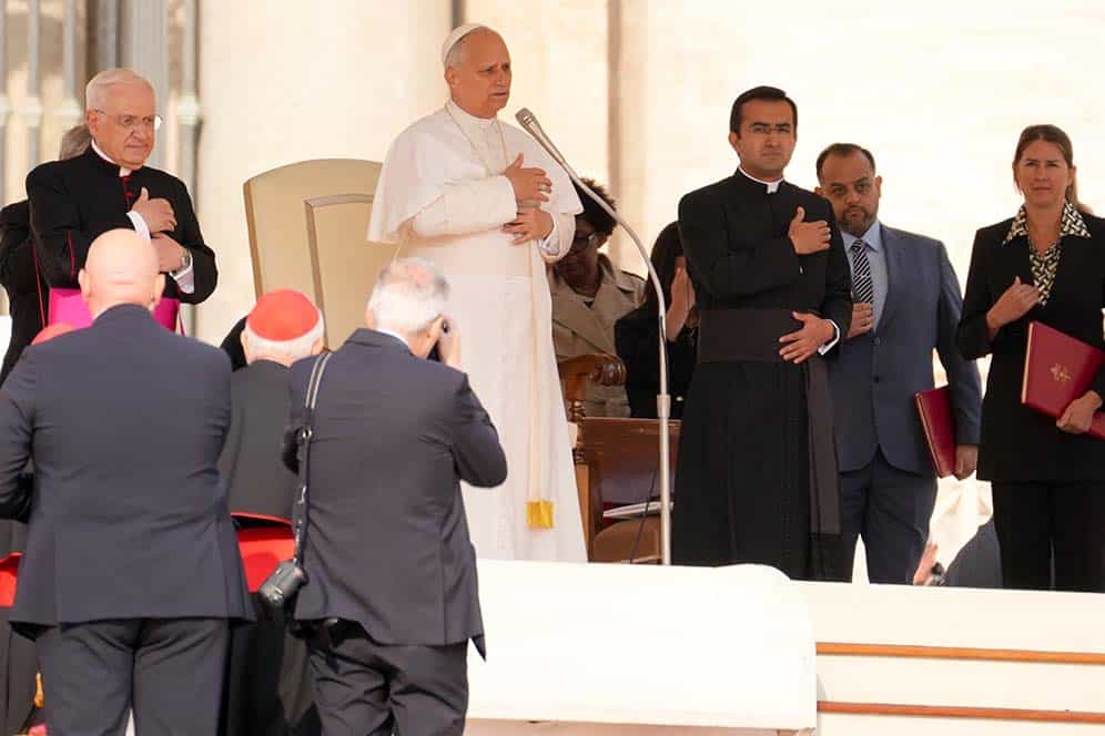 Jesus provides sustenance, not ready-made answers, pope says October 15, 2025By Carol Glatz Catholic News Service Filed Under: News, Vatican, World News VATICAN CITY (CNS) — Power, possessions and rank do not satisfy the deep desire for real meaning in life, Pope Leo XIV said. “It is only the resurrected Jesus who can give the true and lasting peace that sustains and fills us,” the pope said in English Oct. 15 during his weekly general audience in St. Peter’s Square. Pope Leo XIV begins his weekly general audience in St. Peter’s Square at the Vatican Oct. 15, 2025. (CNS photo/Lola Gomez) “We are not truly satisfied with achievements and passing certainties of this world,” he said, “because we are created in the image and likeness of God and through the power of the Holy Spirit we recognize an inexhaustible longing in our hearts for something more.” Greeting Polish-speaking visitors during the audience, the pope said he was joining them in asking for the intercession of St. John Paul II, whose feast day is Oct. 22. Calling the Polish-born pope a “witness of hope and guide of young people,” Pope Leo prayed: “May he inspire teachers, catechists and educators to collaborate with parents in forming the consciences of the new generations.” Before the general audience, the pope received a 12-year-old silver-gray purebred Arabian horse as a gift from a Polish-born horse breeder. Video showed Pope Leo holding its reins and comfortably leading the horse by its bridle in a small courtyard inside Vatican City. The pope often traveled by horse when serving as a missionary in Peru. The horse, named Proton, was raised at a stud farm in Poland, the Vatican press office said in a statement. Sired by Kahil Al Shaqab, a renowned stallion and show horse, Proton’s maternal grandfather is Hlayyil Ramadan, a world Arabian horse champion, who was born and bred in Jordan by Princess Alia Al-Hussein. Meanwhile, in his ongoing series of audience talks on the Jubilee theme, “Jesus Christ our Hope,” Pope Leo reflected on how Christ’s resurrection fulfills the desires of every human heart. “We live busy lives, we concentrate on achieving results, and we even attain lofty, prestigious goals,” he said in his main address in Italian. “We would like to be happy, and yet it is very difficult to be happy in a continuous way, without any shadows,” he said. “We feel deep down that we are always missing something.” However, he said, “we were not created for lack, but for fullness, to rejoice in life, and life in abundance.” “This deep desire in our hearts can find its ultimate answer not in roles, not in power, not in having, but in the certainty that there is someone who guarantees this constitutive impulse of our humanity; in the awareness that this expectation will not be disappointed or thwarted,” the pope said. The risen Jesus “is the wellspring that satisfies our thirst, the infinite thirst for fullness that the Holy Spirit imbues into our hearts,” he said. “Indeed, the resurrection of Christ is not a simple event of human history, but the event that transformed it from within.” Just like water quenches thirst, refreshes, irrigates and renders fertile “what would otherwise remain barren,” he said, “the Risen One is the living wellspring” that always “stays pure and ready for anyone who is thirsty.” Only Jesus “responds to the deepest questions of our heart: is there really a destination for us? Does our existence have any meaning? And the suffering of so many innocents, how can it be redeemed?” he said. “The risen Jesus does not bestow upon us an answer ‘from above,’ but becomes our companion on this often arduous, painful and mysterious journey,” he said. “Only He can fill our empty flask when our thirst becomes unbearable.” Jesus is also “the destination of our journey. Without his love, the voyage of life would become wandering without a goal, a tragic mistake with a missed destination,” he said. Human beings are “fragile creatures,” who make mistakes, Pope Leo said. But the faithful can “rise again” with the help of the Risen One who “guarantees our arrival, leading us home, where we are awaited, loved, saved.” To journey with Jesus “means to experience being sustained despite everything, to have our thirst quenched and to be refreshed in the hardships and struggles that, like heavy stones, threaten to block or divert our history,” he said. “In a world struggling with fatigue and despair, let us be signs of hope, peace and joy of the risen Christ,” he added. Read More Vatican News Though Nicaea is a ruin, its Creed stands and unites Christians, pope says A little leaven can do great things, pope tells Turkey’s Catholics Tennessee teen’s letter to Pope Leo brings a reply with gift of special rosary blessed by him Catholic filmmaker investigates UFO mysteries at the Vatican Pope arrives in Turkey giving thanks, preaching peace Lebanese long for peace ahead of Pope Leo’s visit Copyright © 2025 Catholic News Service/U.S. Conference of Catholic Bishops Print