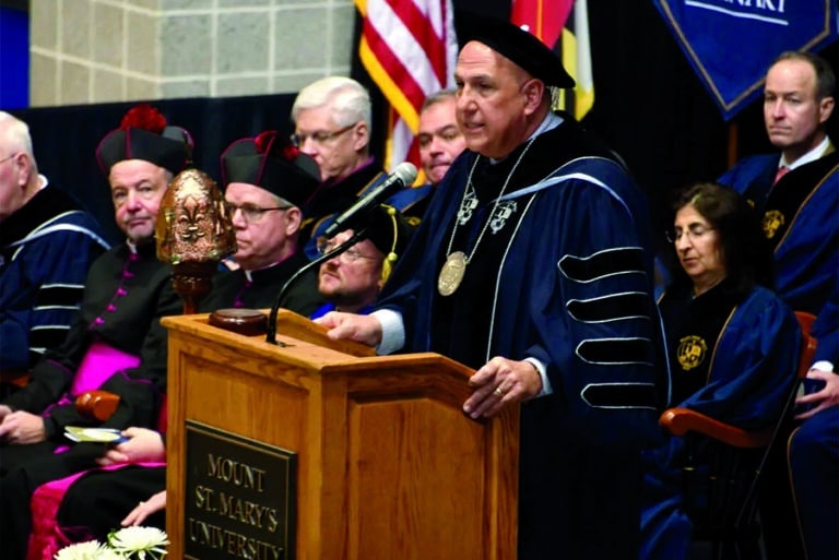 Joyce inaugurated as Mount St. Mary’s president; promises continued faith, excellence April 14, 2025By Nolan Wilkinson Courtesy The Frederick News-Post Filed Under: Colleges, Feature, Local News, News EMMITSBURG – Dr. Gerard “Jerry” Joyce was officially inaugurated as president of Mount St. Mary’s University in an April 12 ceremony to the cheers of faculty, staff and students. “The path ahead will have bumps, as it always has, but Mount St. Mary’s’ history teaches us resilience and our mission reminds us that this work transcends us,” he said during a speech. Dr. Gerard “Jerry” Joyce took over as the 27th president of Mount St. Mary’s University. (Courtesy Mount St. Mary’s University) The private Catholic university in Emmitsburg brought Joyce on to replace retired president Timothy Trainer, who held the position from 2016 to the summer of 2024. Joyce took over in July 2024, coming from his position as executive vice president of DeSales University in Pennsylvania, also a Catholic university. He worked at DeSales for more than 30 years, including a period when he was interim president of the university in 2017. He helped lead DeSales through the COVID-19 pandemic, and, according to Mount St. Mary’s Office of the President, he helped usher in two of the largest first-year classes in 2021 and 2022 while serving as vice president at DeSales. One of the university Board of Trustees’ goals in hiring Joyce was to increase enrollment, Board Chairman Rich Miller said in July. Joyce now leads Mount St. Mary’s and more than 2,000 graduate and undergraduate students as the university’s 27th president. Joyce received a doctorate in education administration and policy studies from The Catholic University of America in Washington, D.C. He received a bachelor of science degree from DeSales University. Hundreds attended Joyce’s inauguration at Knott Arena at Mount St. Mary’s, including many local leaders. Frederick County Executive Jessica Fitzwater said she expects Joyce to provide good leadership in increasingly uncertain times in the academic world. “Dr. Joyce assumes the mantle of leadership at a challenging moment,” Fitzwater said in a speech. “Liberal arts colleges, which had a prominent place in the American higher education system, are under remarkable pressure, because the model is changing in this country.” Frederick County Council President Brad Young and Frederick Mayor Michael O’Connor also spoke at the inauguration, praising the place the university holds within the local community. Young is an adjunct professor at the Richard J. Bolte Sr. School of Business at the university. “The Mount was founded in 1808 and has been a great asset for our county ever since,” Young said. One of Joyce’s first actions as president, according to the Mount St. Mary’s website, was to begin development of the university’s next strategic plan. The plan, set to finish in June, will set goals and performance indicators for the university. “Together, we could reimagine education, expand access to opportunity, strengthen our communities, and lead in sustainability,” he said of the plan. During the inauguration, Miller conferred on Joyce three of the school’s artifacts that signified his office – a crucifix presented to the university’s founder by a pope, a mace dating to the centennial celebration of the university, and the presidential medallion made for the school’s 175th anniversary. Joyce in turn promised to protect, further and govern the university and its mission. Baltimore Archbishop William E. Lori celebrated an Inauguration Mass April 11. Concelebrants include Monsignor Andrew Baker, vice president and seminary rector; Father Justin Gough, university chaplain; and Monsignor Richard B. Hilgartner, a member of the Mount St. Mary’s University Board of Trustees and pastor of St. Joseph in Cockeysville. Read More Colleges Loyola University Maryland receives $10 million gift Loyola University forensic science students help identify victim in cold case Catholic Law conference puts spotlight on Big Tech ethics in the era of AI Nobel Laureate challenges young people at Loyola lecture to demand justice for Congo Father Michael M. Romano installed as rector of Mount St. Mary’s Seminary Proclamation of St. Newman as doctor of church signals Catholic revival at Oxford Copyright © 2025 Catholic Review Media Print