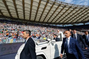 About 50,000 children and adults gathered in St. Peter’s Square for the Mass wrapping up the two-day event which began in Rome’s Olympic Stadium May 25. Pope Francis established the world day as a “movement of boys and girls who want to build a world of peace, where we are all brothers and sisters, a world that has a future because we want to take care of the environment around us,” he said at the stadium.