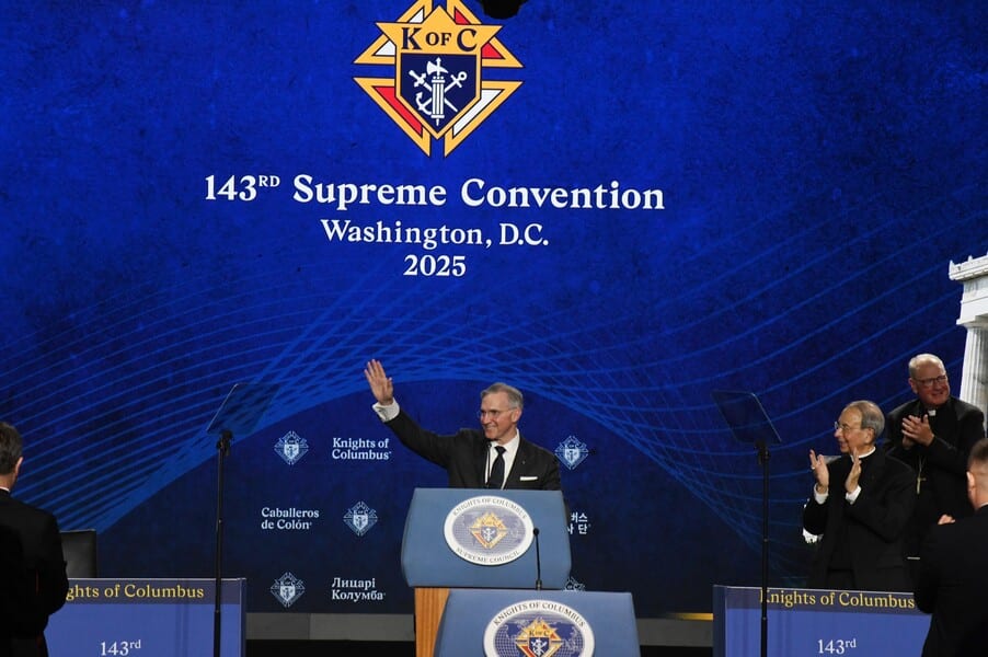 Knights of Columbus open 143rd Supreme Convention with call to be ‘heralds of hope’ August 6, 2025By Nicole Olea Special to the Catholic Review Filed Under: Feature, Knights of Columbus, News, World News The Knights of Columbus opened their 143rd Supreme Convention Aug. 5 in Washington, D.C., with a call to charity, unity, fraternity and patriotism, as Supreme Knight Patrick E. Kelly urged members to be “heralds of hope” in a world searching for meaning. Delegates from the United States, Canada, Mexico, the Philippines, Poland, Ukraine, Cuba and other nations gathered in the nation’s capital, joined virtually by viewers on EWTN, Salt + Light Television, and CatholicTV. The session began with prayer led by Baltimore Archbishop William E. Lori, the Knights’ Supreme Chaplain, invoking hope rooted in Christ’s love and the intercession of Blessed Michael McGivney, the group’s founder. “Our hope is born of love, and is rooted in the pierced heart of your son, Jesus Christ,” Archbishop Lori prayed. “Let us, your Knights of Columbus family, be heralds of hope.” Pope Leo XIV addressed the convention in a video message reflecting on the Jubilee Year of Hope. He reminded the Knights that “the source of our hope is Jesus Christ,” and praised the Order for being “tangible signs of hope for those of our brothers and sisters who experience hardships of any kind.” Patrick Kelly, supreme knight of the Knights of Columbus, opens the 143rd Supreme Convention on Aug. 5, 2025 in Washington, D.C. (Courtesy Patrick Ryan/Catholic Standard) Saying the convention’s theme, “Heralds of Hope,” is timely, Pope Leo commended the Knights’ charitable outreach, including efforts for “the unborn, pregnant mothers, children, those who are less fortunate, and those affected by the scourge of war,” which he said “brings hope and healing to many and continues the noble legacy of your founder, Blessed Michael McGivney.” Kelly’s annual report highlighted the Knights’ global impact and alignment with the vision of Pope Leo XIV. He recalled being in Rome at the time of the conclave and pledging the “unfailing unity” of 2.1 million Knights to the new Holy Father. He said Pope Leo’s call for missionary outreach, unity and fraternity “felt like he was speaking directly to the Knights of Columbus,” because those principles reflect the Order’s founding mission. He also paid tribute to Pope Francis, describing him as “a pope of charity,” whose example inspired the Knights’ outreach to Indigenous communities, efforts against human trafficking, and humanitarian aid in Ukraine. “We don’t merely volunteer,” Kelly said. “We see the face of Christ in those we serve, and we sacrifice for them because that’s what Jesus did for us.” Humanitarian work remains a hallmark of the Knights’ mission. The Global Wheelchair Mission has donated more than 158,000 wheelchairs, including 19,000 last year. Aid continues for Christians in Nigeria, where persecution persists, and for Ukrainians suffering from the ongoing war. Kelly shared the story of Tetiana Sahaidak, a young woman in Ukraine who lost her foot in a missile attack and is now receiving a prosthetic with the Knights’ support. The Knights of Columbus continue their longstanding support for the Special Olympics through volunteer service and financial contributions, Supreme Knight Kelly said. Members assist at local and international events, helping athletes and families experience the joy of competition while promoting the dignity of every person with intellectual disabilities. In the United States, Knights responded to natural disasters including the Texas floods, hurricanes in the Southeast, and the California wildfires. He shared a story about one Knight’s family whose home was destroyed in California and found hope in a statue of the Blessed Mother that survived untouched. Their video singing the “Regina Caeli” went viral, inspiring millions. The Knights of Columbus in the Philippines exemplify the fraternal group’s mission of charity, serving those in the most desperate conditions. Kelly praised the more than 500,000 Filipino Knights for their daily outreach, from operating soup kitchens in Manila to supporting hundreds of children who live in what he called a “heartbreaking place” — a giant landfill — through education and care programs. Filipino Knights also lead the national “Guardians of Dignity” initiative to combat human trafficking in partnership with the Arise Foundation. Their work, Kelly said, reaches “beyond the peripheries,” bringing hope to abandoned children, trafficking survivors and the poorest families across the nation. The Knights’ pro-life mission expanded through the Aid and Support After Pregnancy (ASAP) initiative, which provided $6 million to pregnancy resource centers last year. The Knights also reached a milestone of 2,000 donated ultrasound machines, including a new unit for a Virginia center that has already helped save more than 200 babies. “Too many men are acting like boys,” Kelly said, emphasizing the Order’s COR program for men’s faith formation. “Women need husbands, children need fathers, and we all need men to act like men.” Spiritual renewal is central to the Knights’ work. The Sacred Heart Pilgrim Icon Program has inspired more than 5,000 prayer services, drawing one-half million participants, while the Knights continue to lead Eucharistic processions and support the National Eucharistic Revival. Vocations support also remains a priority. The Knights’ RSVP program has assisted more than 150,000 men and women discerning the priesthood or religious life and has surpassed $100 million in contributions. Kelly underscored that commitment by presenting the 2025 International Blessed Michael McGivney Medal to Pallottine Frank S. Donio, the Knights’ highest annual honor for priests, which recognizes chaplains whose ministry reflects th