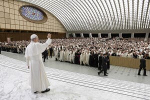 The pope met with more than 3,000 knights and dames of the Holy Sepulchre in the Vatican’s Paul VI Audience Hall Oct. 23 during their Jubilee pilgrimage to Rome. Cardinal Fernando Filoni, grand master of the order, was also present.