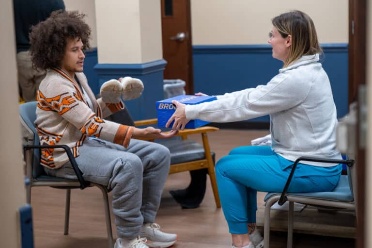 Mercy surgeons help residents get back on their feet at Helping Up Mission November 26, 2025By Kevin J. Parks Filed Under: Feature, Health Care, Local News, News Michael Brown’s feet hurt so badly he just wanted to stay off them. A resident of Helping Up Mission in Baltimore for a little over four months, he said the pain in his feet, knees and back left him feeling forgotten. Dr. Vandan Patel, a surgeon with The Institute for Foot and Ankle Reconstruction at Mercy Medical Center, explains the inner workings of shoe support and construction during his office’s annual foot-care outreach Nov. 25 at the Helping Up Mission in Baltimore. (Kevin J. Parks/CR Staff) “Sometimes you feel like nobody cares. For me, this means the world,” Brown said as he received a foot exam Nov. 25 from the surgical team of The Institute for Foot and Ankle Reconstruction at Mercy Medical Center in Baltimore. After slipping on his new socks and shoes, he added, they “feel amazing.” Brown was one of about 80 men receiving free foot evaluations and footwear at Helping Up Mission in Baltimore. With clippers in hand and cases of new socks and shoes ready for distribution, Mercy’s surgical team partnered with Dick’s Sporting Goods and Royal Farms for the 2025 effort. The tradition, begun in 2007, offers simple care that often has life-changing impact. Helping Up Mission, on East Baltimore Street, is a faith-based residential program that serves about 500 men confronting addiction, homelessness and trauma. Its approach, rooted in what it calls “where sacred and science come together,” focuses on restoring residents’ physical, spiritual and emotional well-being. Kris Sharrar, the mission’s director of philanthropy and a coordinator for the event, said the goal is always personal and practical. Dr. Julia McCann, a surgical fellow with The Institute for Foot and Ankle Reconstruction at Mercy Medical Center, examines the foot of a Helping Up Mission resident during the practice’s annual Thanksgiving outreach Nov. 25. (Kevin J. Parks/CR Staff) “We’re intending to meet the person (client) where they are with the needs they may have,” he said. Sharrar knows the impact firsthand. A 2007 graduate of Helping Up Mission’s yearlong spiritual recovery program, he vividly remembers the boots he received at the same outreach years ago. If someone is dealing with painful feet, he noted, he or she is unlikely to focus on deeper issues. Treating the whole person – body included – is essential. That need has only grown as fentanyl and even animal tranquilizers enter the drug supply, often without a user’s knowledge. One impulsive act, Sharrar warned, can be fatal. Such realities make the mission’s work even more urgent. Dr. Vandan Patel, a surgeon with The Institute for Foot and Ankle Reconstruction at Mercy, said the team comes back each year because the need is unmistakable. “Talking with these guys, they have their own individual stories, and some of them are pretty difficult,” said Patel, who began participating in the outreach during his 2022–23 Mercy fellowship. Routine footcare may be easy for those with resources, he said, but it’s not easy for people navigating addiction, poverty or life on the street. Even basic nail care or treating minor issues can help residents get back on their feet – “literally.” And the gratitude they show, he added, isn’t something many of them experience often. For Patel and his colleagues, the outreach also provides a reset from the daily grind of appointments, clinics and surgeries. Taking time to offer care that is both simple and deeply needed, he said, lifts everyone involved. “That makes you appreciate why we started to do this in the first place,” Patel said. Email Kevin J. Parks at kparks@CatholicReview.org Jorgen Post, a certified orthotic fitter with D&J Medical, part of The Institute for Foot and Ankle Reconstruction at Mercy Medical Center, completes paperwork before assisting a resident of the Helping Up Mission with new shoes and socks Nov. 25, in Baltimore. (Kevin J. Parks/CR Staff) Michael Brown, a residential client of the Helping Up Mission in Baltimore, smiles as he wears the new socks and shoes he received during a Nov. 25 foot-care outreach courtesy of The Institute for Foot and Ankle Reconstruction at Mercy Medical Center. Brown, who said he suffers from significant foot and back pain, was one of 80 men who received care. (Kevin J. Parks/CR Staff) Read More Local News Artist helps transform blight to beauty throughout Baltimore area Radio Interview: Advent and St. Nicholas Archbishop Lori announces clergy appointments, including pastor assignment and retirement Calvert Hall holds off Loyola Blakefield to claim a 28-24 victory in the 105th Turkey Bowl Tears and prayers greet St. Thérèse relics in Towson Maryland pilgrims bring energy and joy to NCYC 2025 Print