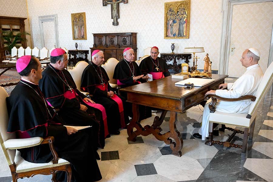Mexican Catholics push ahead with peace efforts as violence plagues country January 18, 2026By David Agren OSV News Filed Under: News, World News Mexico’s Catholic leaders have urged the country’s political leaders to listen to victims of violence, seek input from all sectors of society and work together toward pacifying the country as the nation confronts rampant insecurity. Swaths of the country are currently under the control of criminal groups, and citizens are increasingly being exposed to crimes such as extortion. “We don’t come today to ask permission to build peace. We come to implore every sector of society, every Mexican, and the Mexican state itself to assume this historic responsibility, because peace cannot wait,” Auxiliary Bishop Héctor Pérez Villarreal of Mexico City said Jan. 12. He made the comments in announcing the second edition of the National Dialogue for Peace, a peace-building initiative sponsored by the Mexican bishops’ conference, the Jesuits’ Mexico province and the Conference of Religious Superiors of Mexico. Pope Leo XIV meets with members of the presiding council of the Mexican bishops’ conference at the Vatican Sept. 18, 2025. Seated with the pope are, from left, Archbishop Jaime Calderón Calderón of León, vice president; Bishop Roberto Yenny García of Ciudad Valles, lead member; Archbishop Jorge Alberto Cavazos Arizpe of San Luis Potosí, treasurer; Bishop Ramón Castro Castro of Cuernavaca, president; and Auxiliary Bishop Héctor Mario Pérez Villarreal of Mexico City, secretary general. (CNS photo/Lola Gomez) “We don’t seek to polarize, but rather to bring people together. We don’t want to shout, but rather to listen. We don’t want to see the problem in a simplistic way, but rather to truly delve into the paths to peace,” added Bishop Pérez Villarreal, secretary-general of the Mexican bishops’ conference. The National Dialogue for Peace emerged from the 2022 atrocity of two elderly Jesuits, Fathers Javier Campos and Joaquín Mora, being murdered by a well-known local crime boss as they protected a man chased into their parish in an Indigenous community in the Sierra Tarahumara of northern Chihuahua state. The first initiative organized peace forums across the country, culminating in a national gathering in early 2024. Its first diagnosis of Mexico’s security situation was presented to the 2024 presidential candidates — with then-candidate Claudia Sheinbaum, now president, telling the dialogue’s organizers and participants: “I don’t share the pessimistic evaluation of the present moment.” The forum offered a space for victims to be heard, while the dialogue’s organizers have worked with experts from civil society to present proposals to political leaders, served as a liaison with government officials in some states — including many from the ruling MORENA party — and initiated programs to repair the social fabric in communities afflicted by criminal activities. “As the National Dialogue for Peace, what we are doing is reviving best practices. We are sharing what exists today that is positive and has offered good results … to reach agreements and improve the conditions for peace to exist,” said Jesuit Father Jorge Atilano, director of the National Dialogue for Peace. The security situation is discouraging, however, according to the dialogue’s organizers. “What we hear is concern about the country’s insecurity. Above all, what we’ve pointed out is the issue of growth of extortion, which reflects greater (criminal) control over territories and this exploitation to access both public and private resources,” Father Atilano said. “What we found” in the first forum “was devastating: vast territories where the state no longer governs, where violence has become the only law and where institutions have retreated in the face of organized crime and an isolated and fragmented society,” said Marist Brother Luis Felipe González Ruiz, second vice president of the Conference of Religious Superiors of Mexico. The second national forum organized by the dialogue is scheduled for Jan. 30 to Feb. 1 at the Jesuit-run ITESO university in Guadalajara. It comes as President Sheinbaum weathers pressure from U.S. President Donald Trump to curb drug cartel violence and fentanyl production. Trump alleged after U.S. special forces grabbed Venezuelan President Nicolás Maduro in a daring Jan. 3 raid that “the cartels are running Mexico. It’s very, very sad to watch and see what’s happening to their country.” He added in the Jan. 8 interview with Sean Hannity. “We are going to now start hitting land with regard to the cartels.” Trump has expressed respect for Sheinbaum, even as he has mused over military intervention in Mexico. Sheinbaum has repeatedly rejected Trump’s offers of U.S. military assistance in combating drug cartels. The Mexican president has quietly made concessions to Trump’s demands by ramping up migrant enforcement, abandoning her predecessor’s security policy known as “hugs, not bullets” — something called for by Catholic leaders after the murders of the two Jesuits — and sent 55 drug cartel leaders to the United States to face federal charges there. Sheinbaum said Jan. 8 that Mexico’s murder rate had fallen 40 percent, its lowest level since 2016, during her 15 months in office. Critics countered that the number of disappeared climbed by 20 percent during 2025 and justice is still missing for many victims. “There’s still a deep challenge to state order in Mexico,” Falko Ernst, a security analyst in Mexico City, told OSV News. “Any help, including from the Catholic Church, is more than welcome in order to add additional hands to what will hopefully be consistent efforts to tackle the situation.” “We believe that, without truth and justice for the victims in the country, there can be no peace,” said Elena Azaola Garrido, an academic from the Center for R