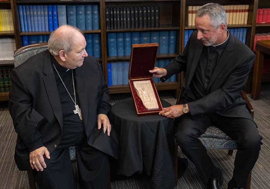 Minnesota archdiocese to host exhibit of largest collection of papal artifacts outside of Rome October 25, 2025By Josh McGovern The Catholic Spirit Filed Under: Arts & Culture, News, World News ST. PAUL, Minn. (OSV News) — From Jan. 10 to Feb. 1, the Archdiocese of St. Paul and Minneapolis will host “Vatican Unveiled,” an exhibit of the largest collection of papal artifacts outside of Rome, in celebration of the archdiocese’s 175th anniversary. Father Rich Kunst, right, shows a Holy Year brick to Archbishop Bernard A. Hebda of St. Paul and Minneapolis at the Archdiocesan Catholic Center in St. Paul during an introductory session Aug. 13, 2025, about “Vatican Unveiled,” an exhibit of the largest collection of papal artifacts outside of Rome taking place Jan. 10 to Feb. 1, 2026, at the Mall of America in Bloomington, Minn. (OSV News photo/David Hrbacek, The Catholic Spirit) The 19,000-square-foot exhibit — curated by Father Richard Kunst, a priest of the Diocese of Duluth — will be hosted at the Mall of America in Bloomington. Items will include a document with the second-oldest papal signature outside the Vatican and a Swiss Guard uniform, the archdiocese announced in a news release Oct. 6. In a video announcing the exhibit, Archbishop Bernard A. Hebda extended the invitation “to a very special celebration of the 175th anniversary of the Archdiocese of St. Paul and Minneapolis. It’s called ‘Vatican Unveiled,’ and it is a special exhibit of the largest collection of papal and other artifacts outside of Vatican City, the home of the Catholic Church.” Father Kunst, ordained in 1998, has said he grew up collecting items. Before his ordination, he was a staff member for the late U.S. Sen. Rod Grams, a Republican from Minnesota. The priest has developed a deep knowledge of the items in the “Vatican Unveiled” collection and a “passion for telling their stories,” the archdiocese stated in the news release. Father Kunst is the vocations director for the Duluth Diocese and a former columnist for The Northern Cross, a monthly diocesan newspaper in Duluth that ceased operations last November. The diocese recently announced in a Facebook post that it plans to publish The Northern Cross in a magazine format starting in December. Josh McGovern is a reporter at The Catholic Spirit, newspaper of the Archdiocese of St. Paul and Minneapolis. This story was originally published by The Catholic Spirit and is distributed through a partnership with OSV News. Read More Arts & Culture Artist helps transform blight to beauty throughout Baltimore area ‘The Sound of Music’ at 60 Celebrity chef ‘Lidia’ hasn’t forgotten what it’s like to be a refugee. Here’s how she’s giving back Pope sings praises of choirs, affirms importance of their ministry Indigenous elders, New York artist, Seattle cathedral join to create St. Kateri icon Mexican for whom ‘¡Viva Cristo Rey!’ is life slogan wins Miss Universe contest Copyright © 2025 OSV News Print